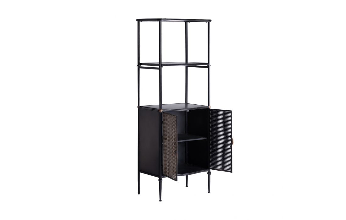 Bookseller made up of a black metallic iron structure combined with a golden color that stars the two doors of the metallic grille cabinet