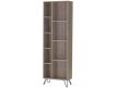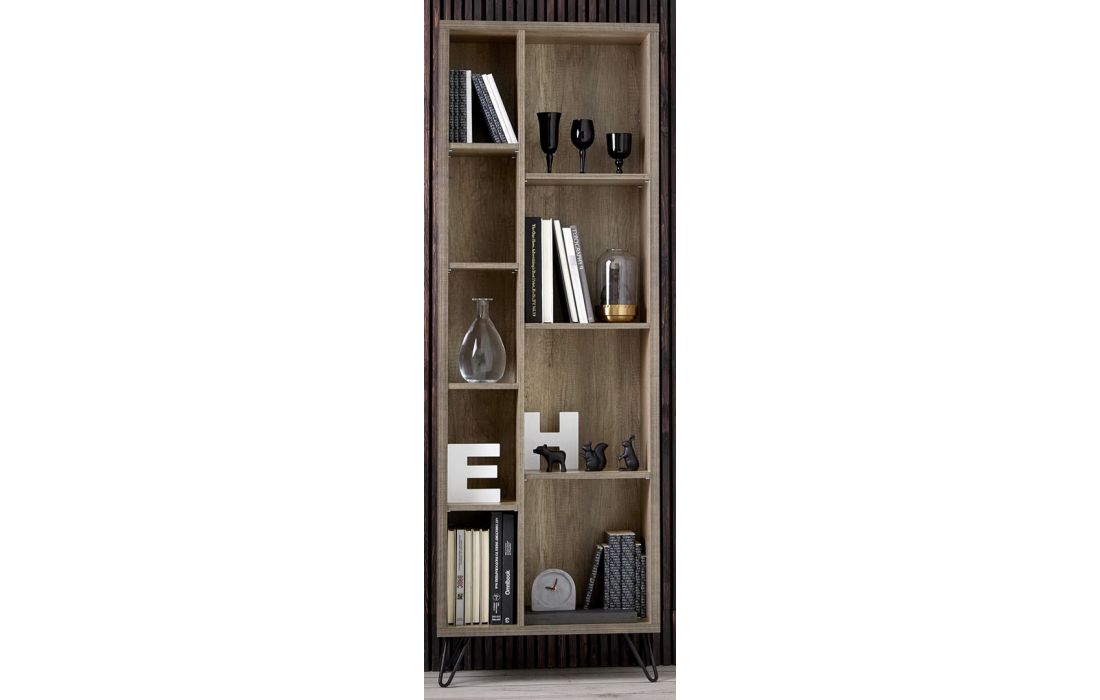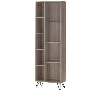 Wood veneer bookcase with black metal feet.