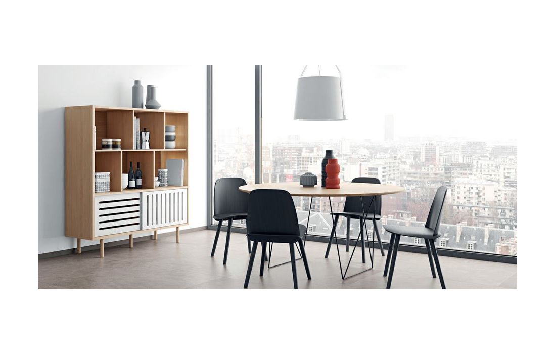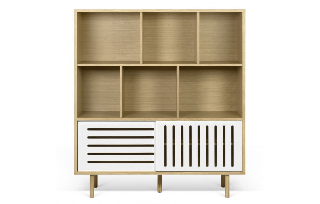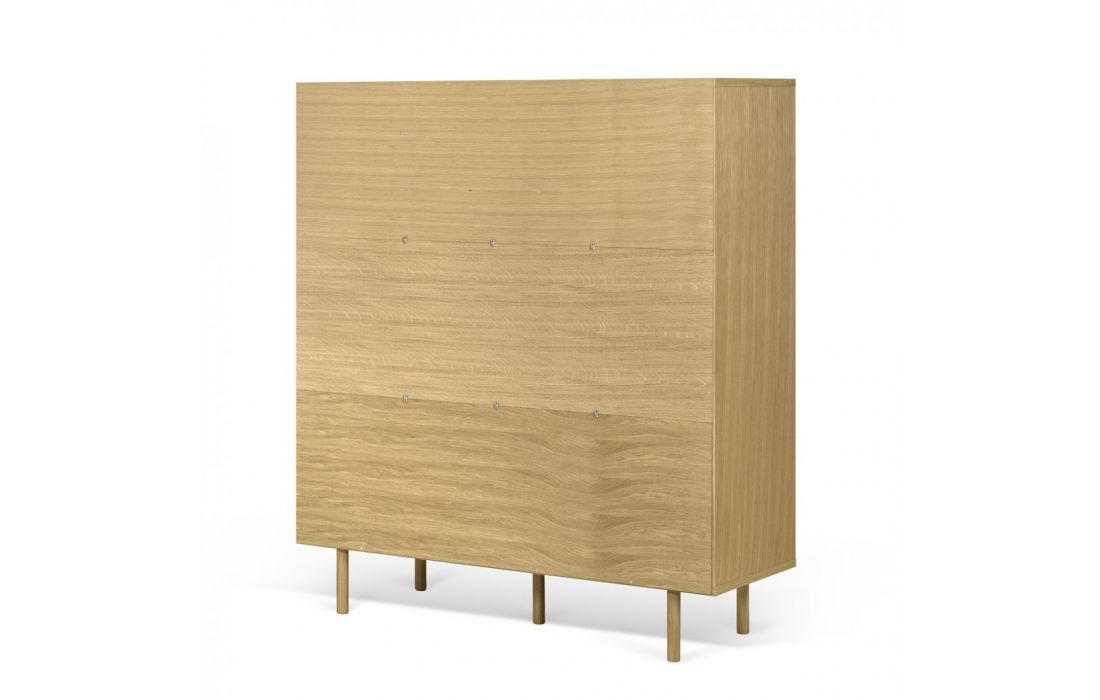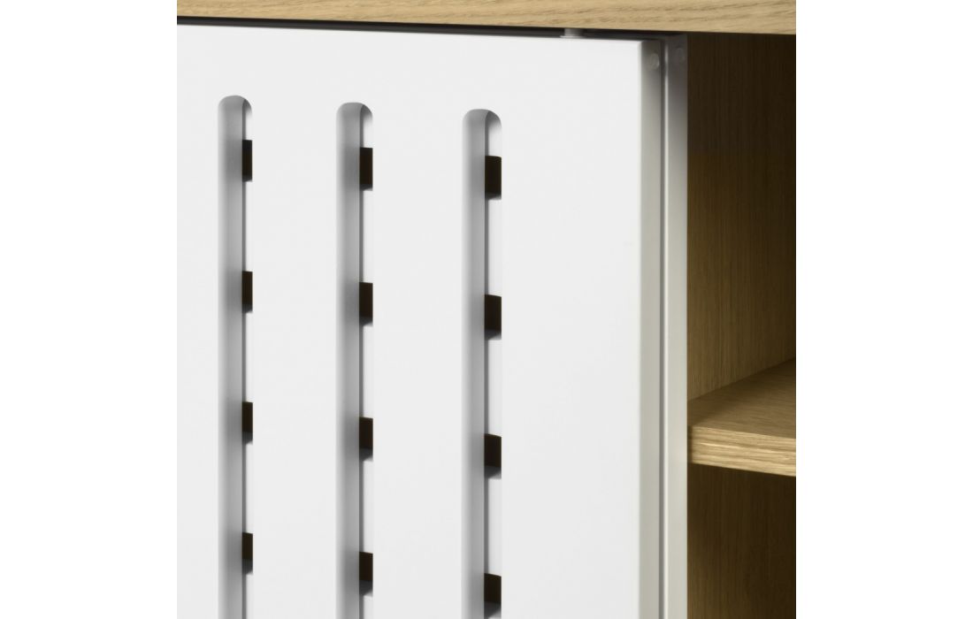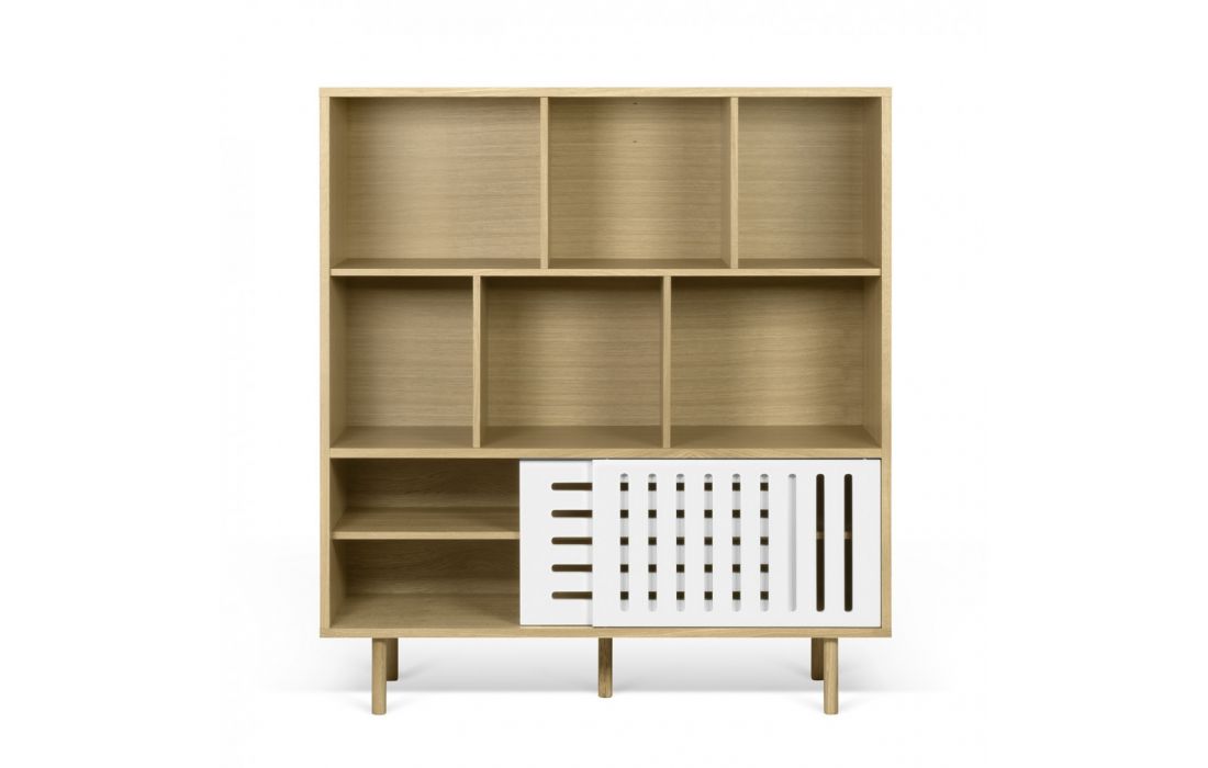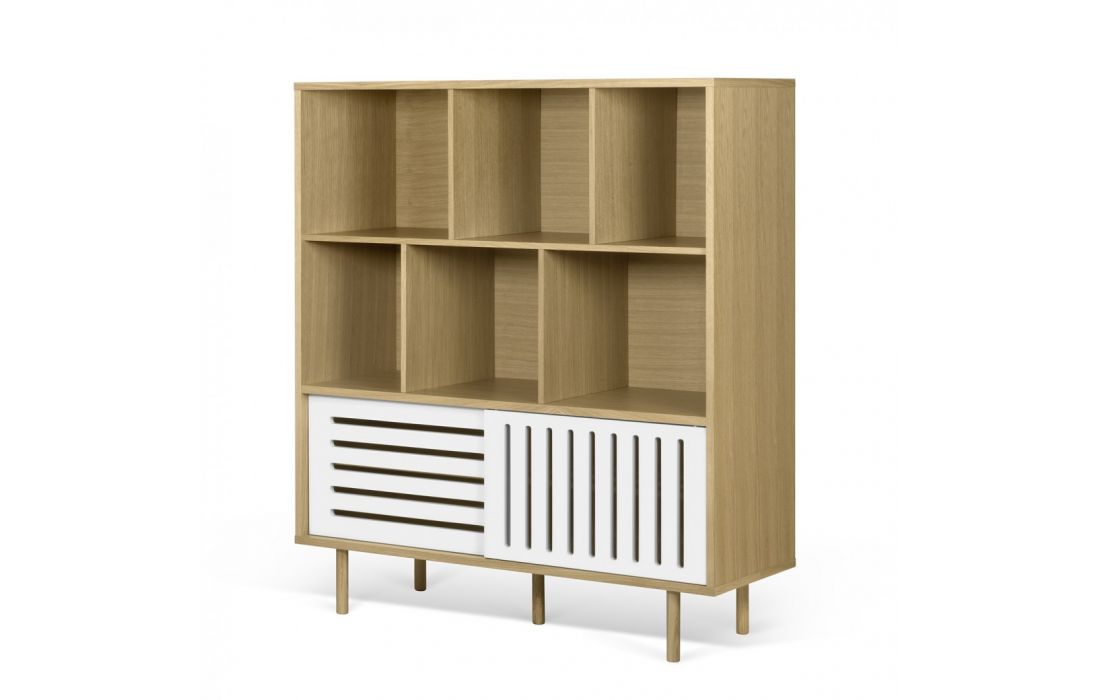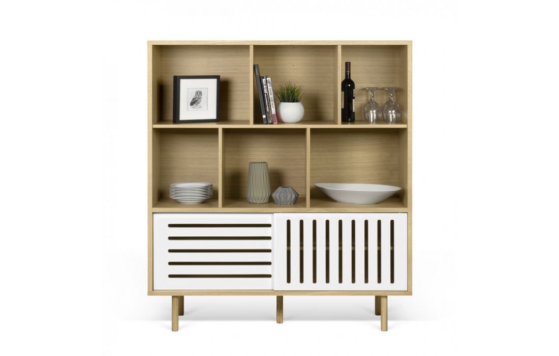 Mobile high with 2 sliding doors 1 shelf inside each compartment, the top is composed of numerous shelves, in order to maximize the use of the available wall space.