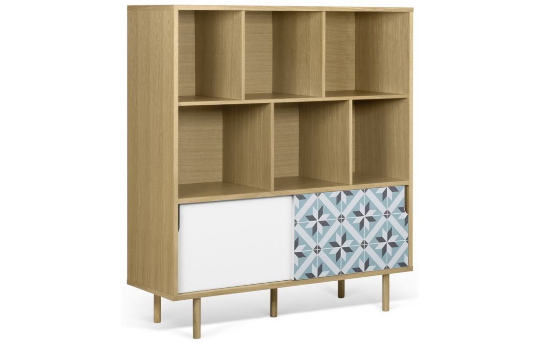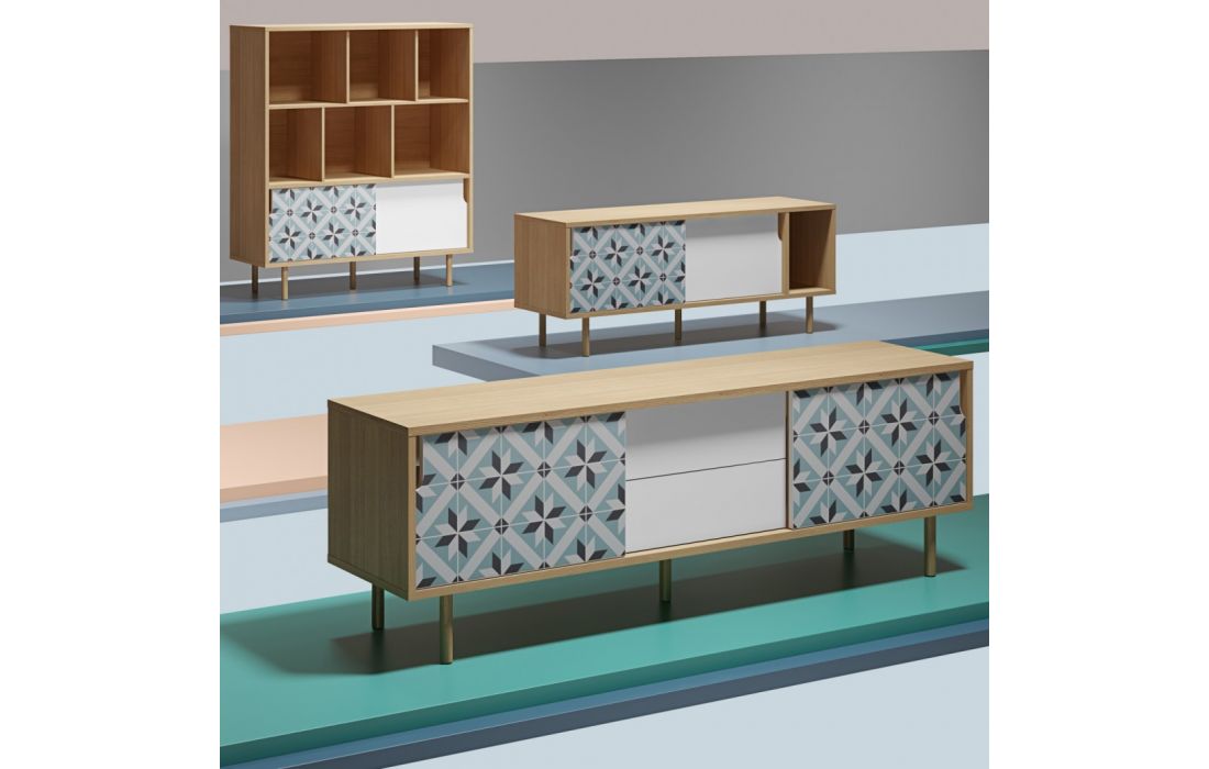 High furniture with distinctive details, such as the geometric pattern on the doors.