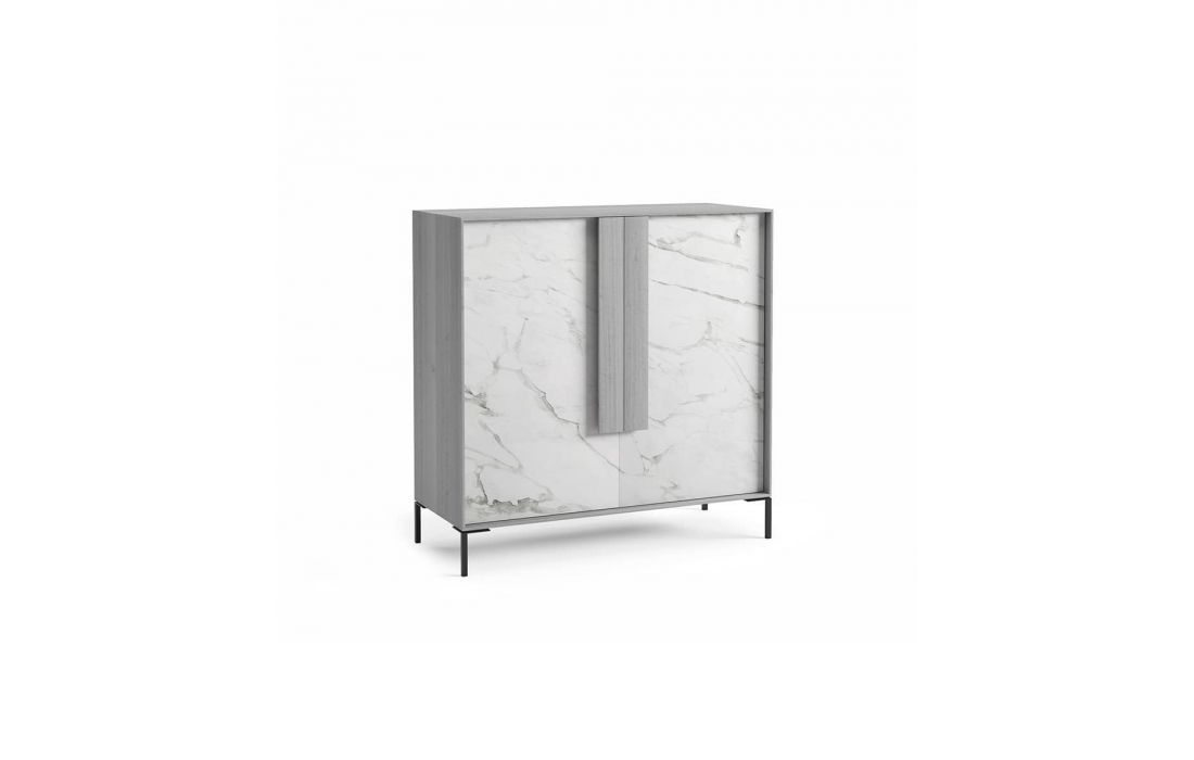 Cabinet with MDF structure in gray eucalyptus, doors in calacata ceramic and feet in lacquered metal. Interior with mirror on the shore and glass shelves.