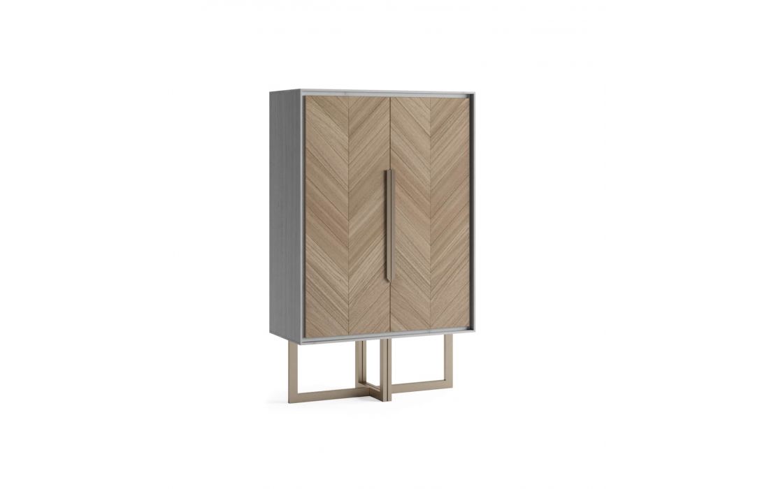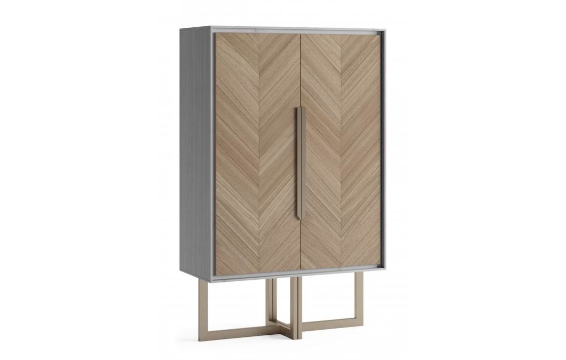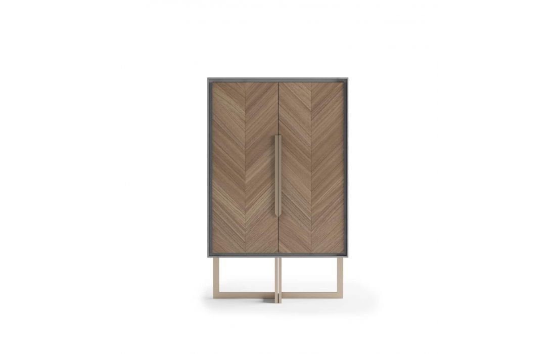 Tall liqueur cabinet with MDF structure veneered with walnut and a foot in matt golden stainless steel. Interior with mirror on the shore and glass shelves.