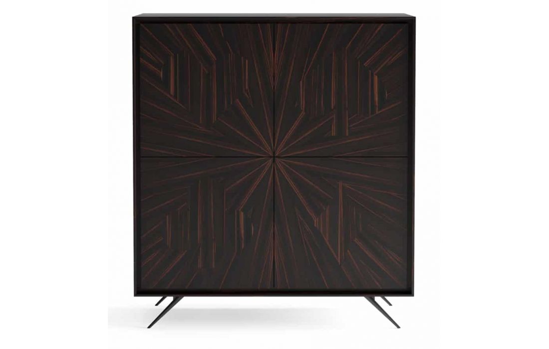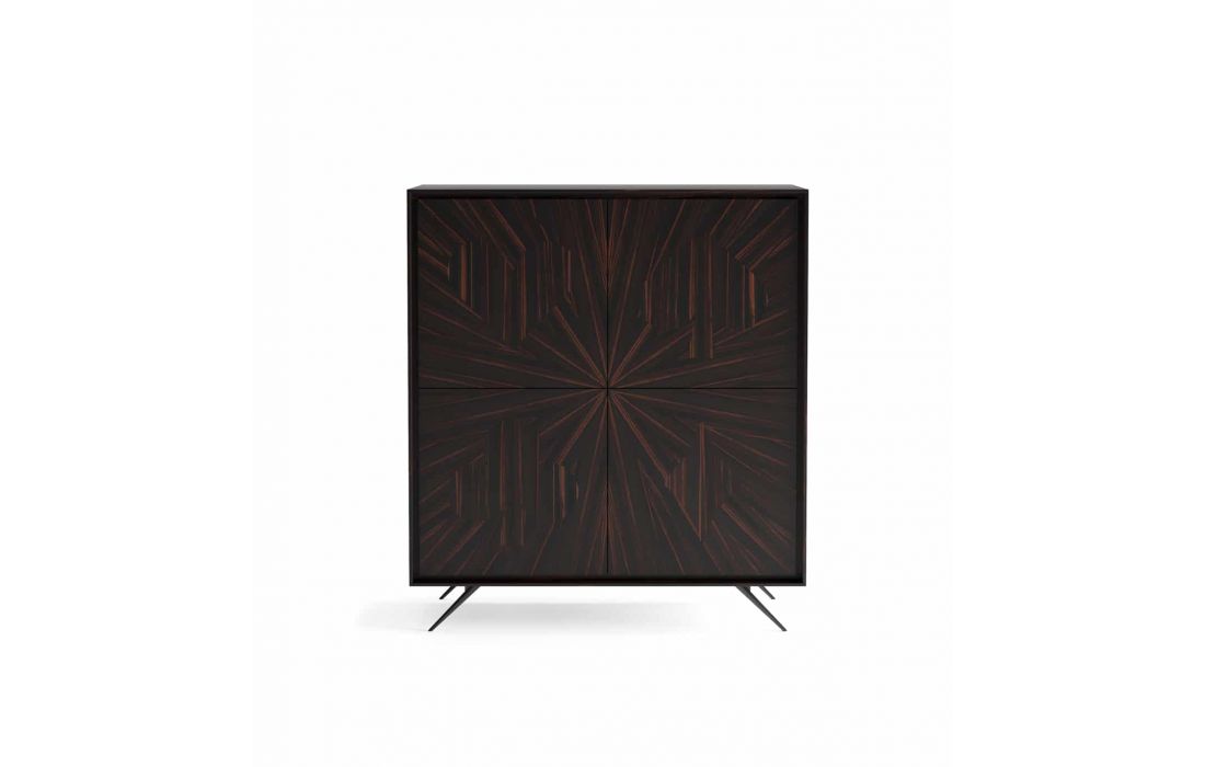 Tall liqueur cabinet with MDF structure veneered with ebony, insertion of suits on the doors and feet in black iron. Interior with mirror on the shore and glass shelves.