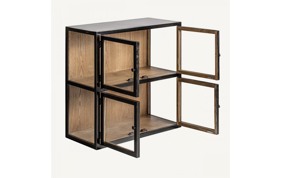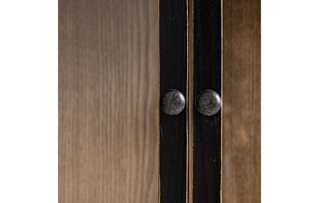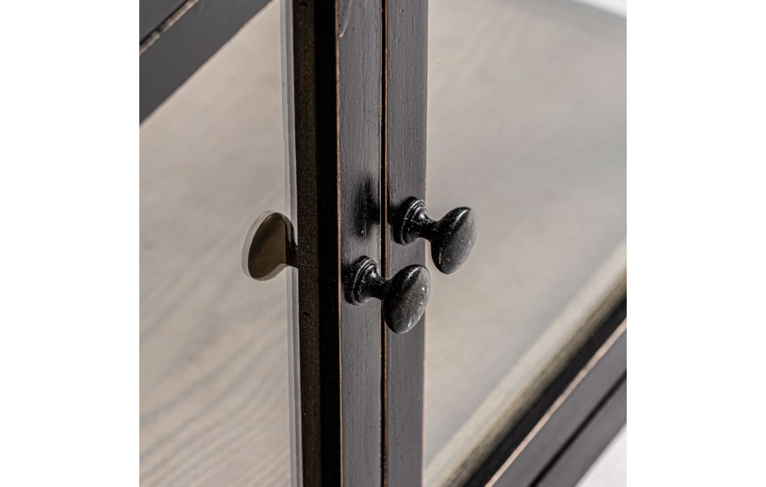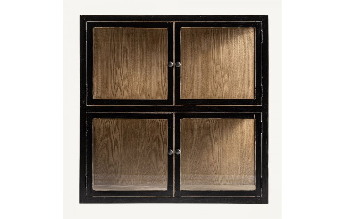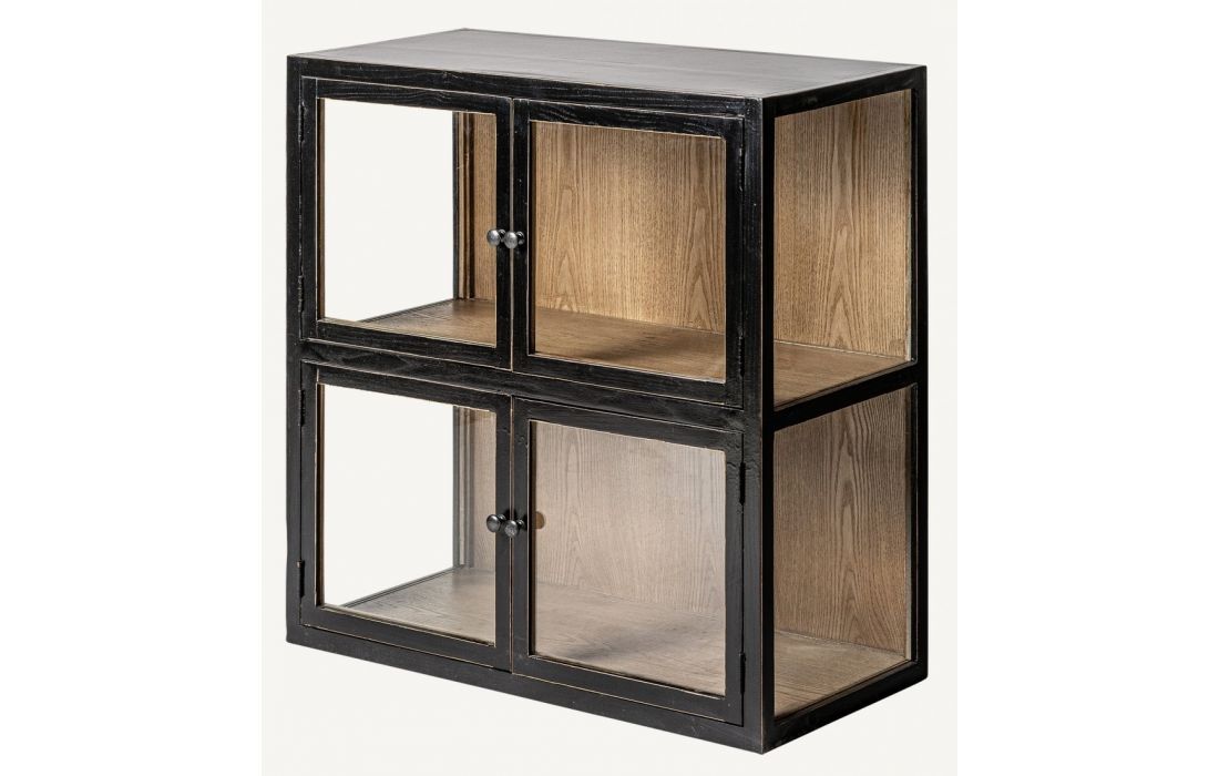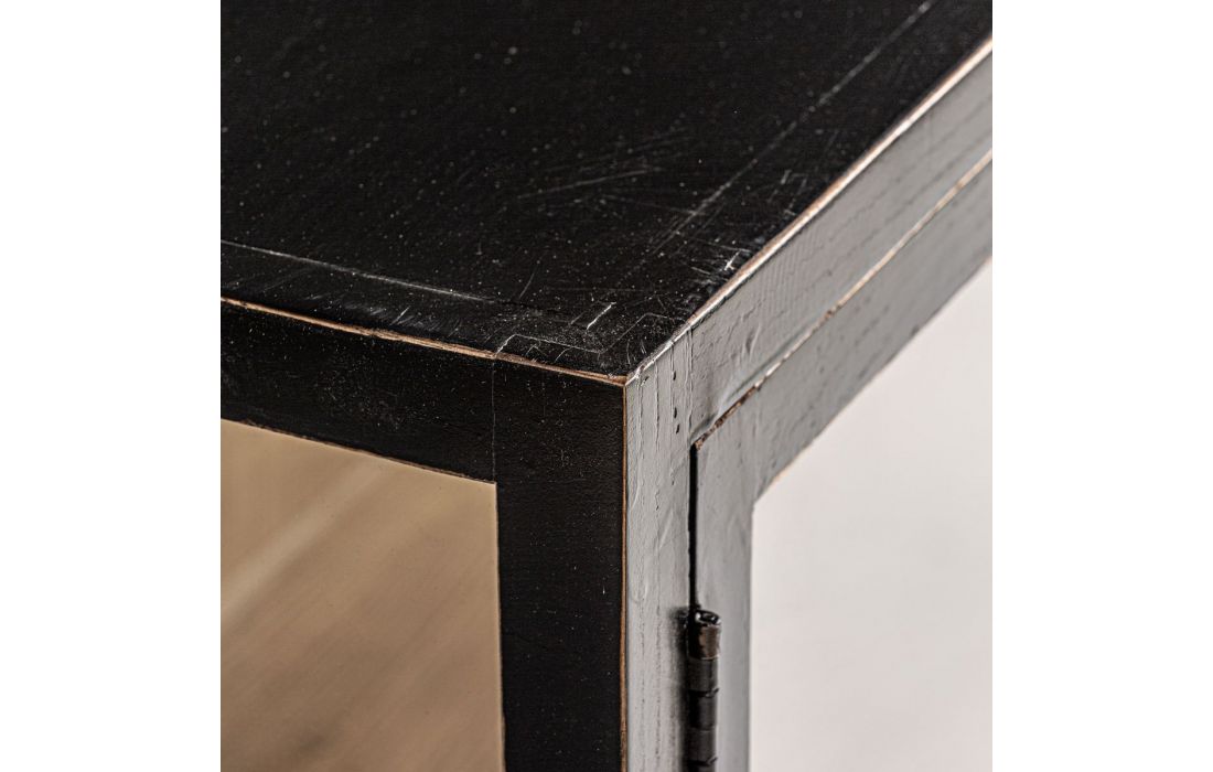 Colonial style showcase made of recycled pine wood in black/natural color and glass.