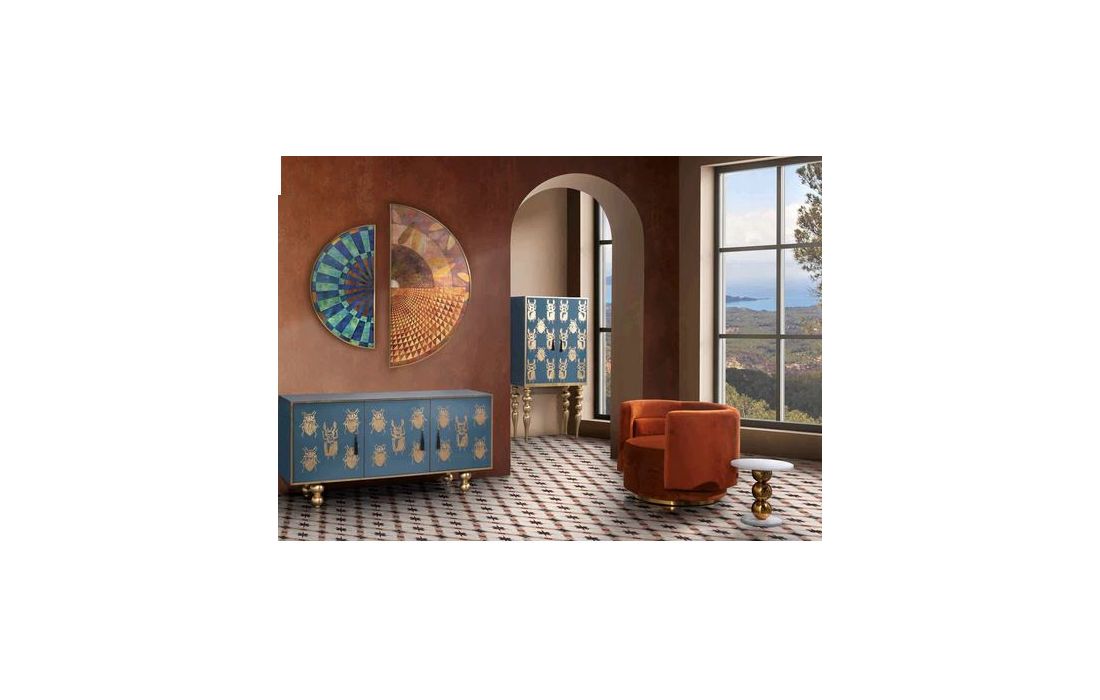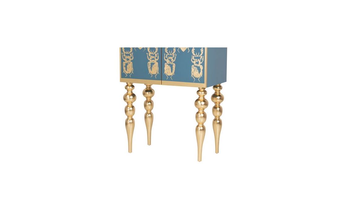 Tall piece of furniture made of birch wood, with 2 doors painted in blue and black with golden details with golden feet.