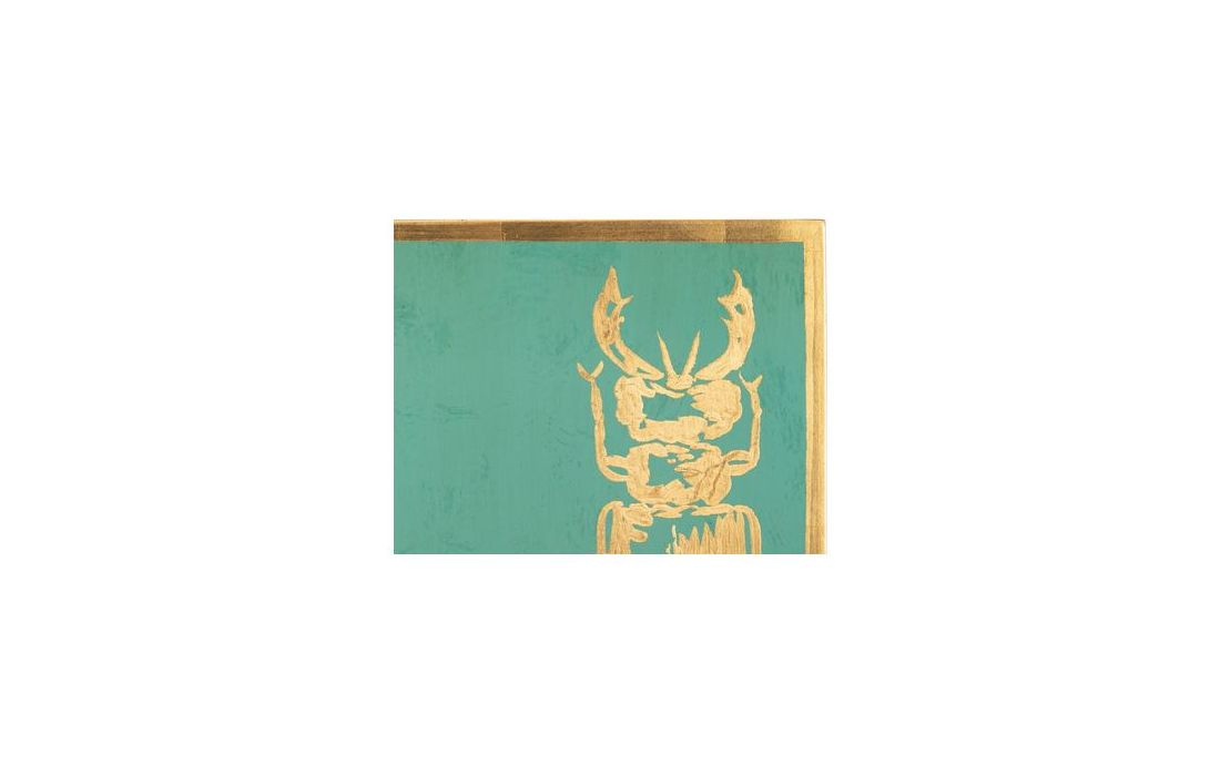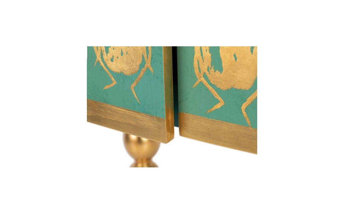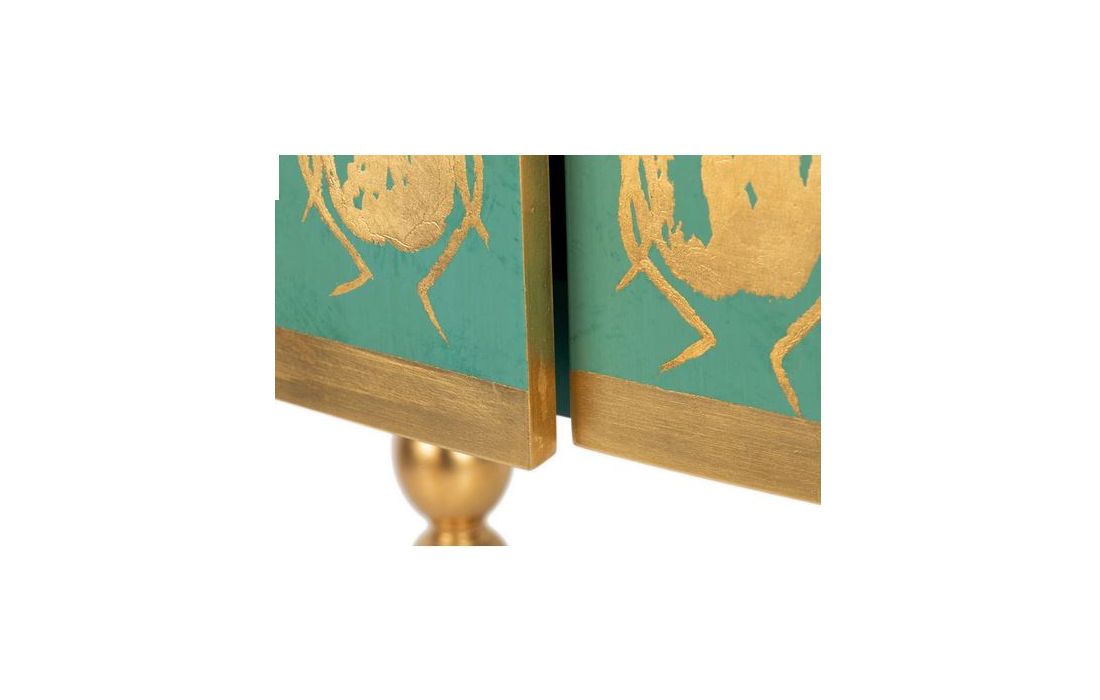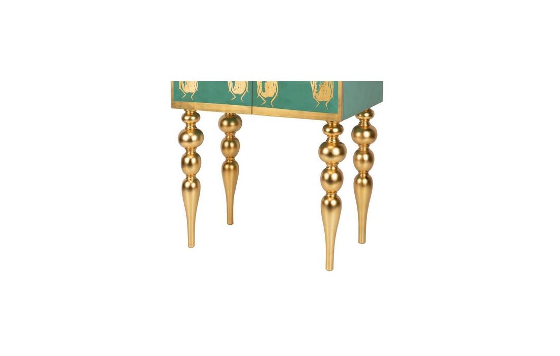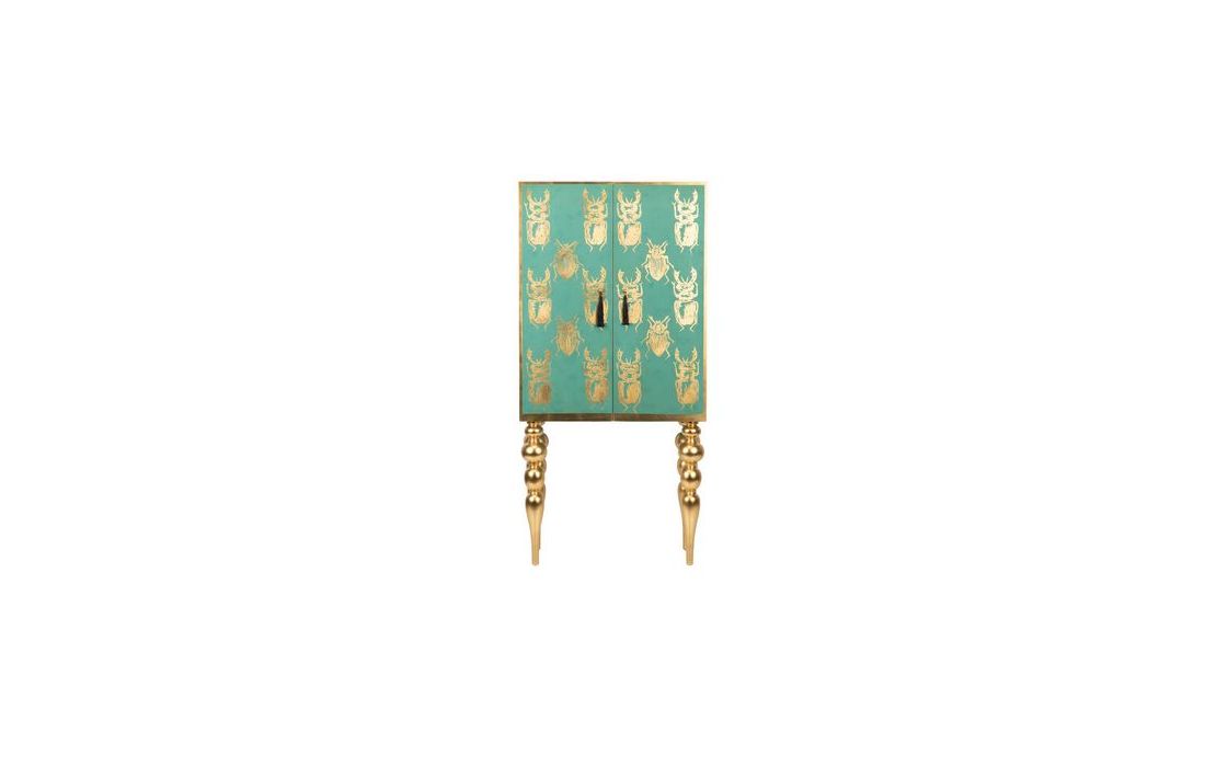 Tall piece of furniture made of birch wood, with 2 doors painted in black, turquoise and with golden details with golden feet.