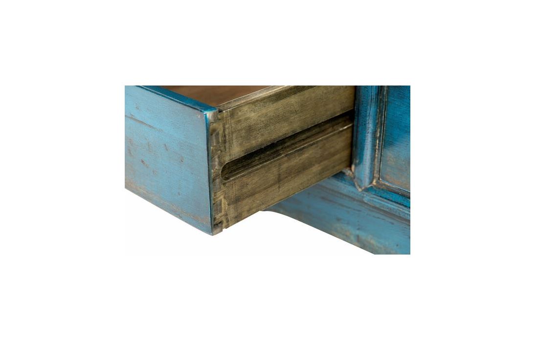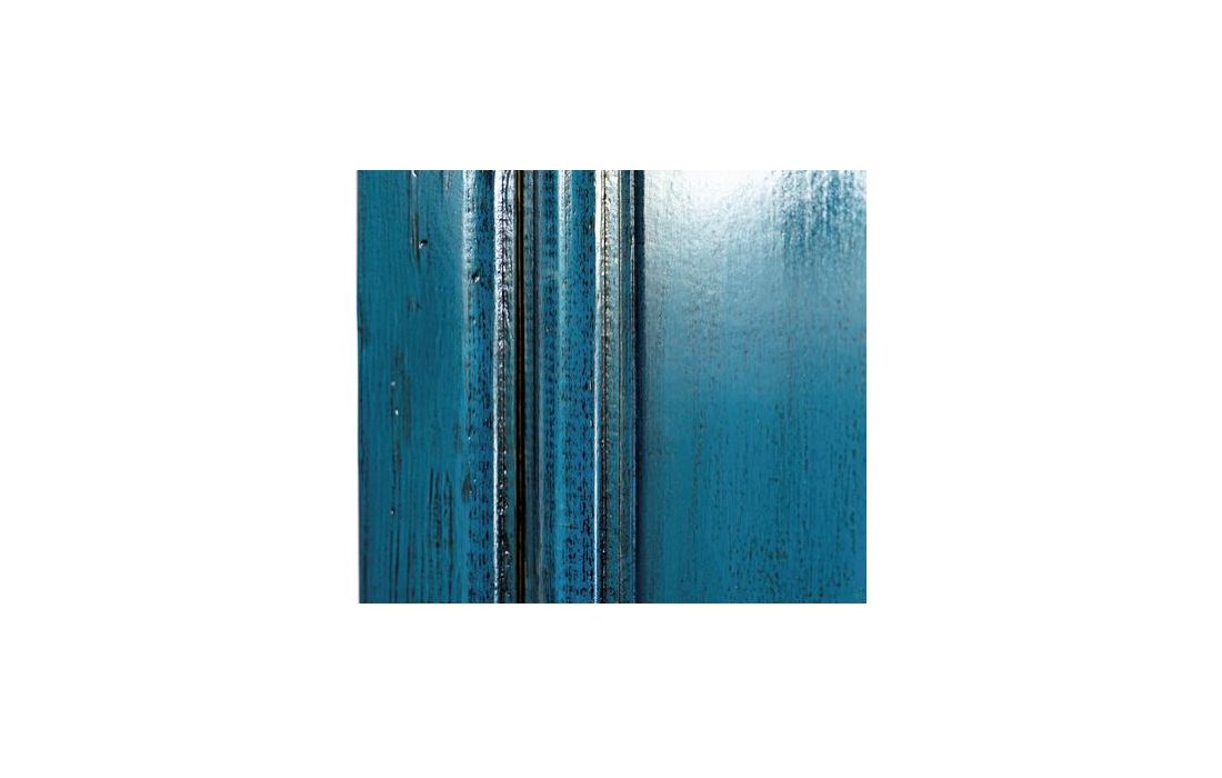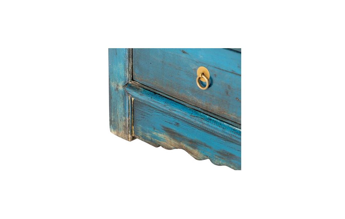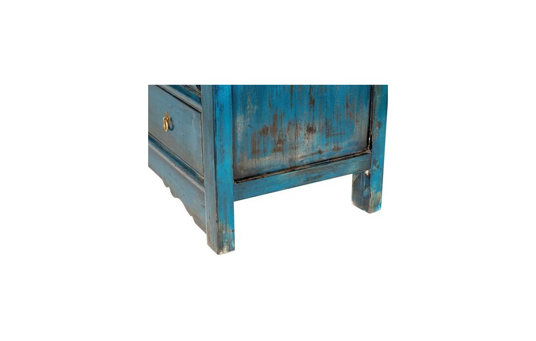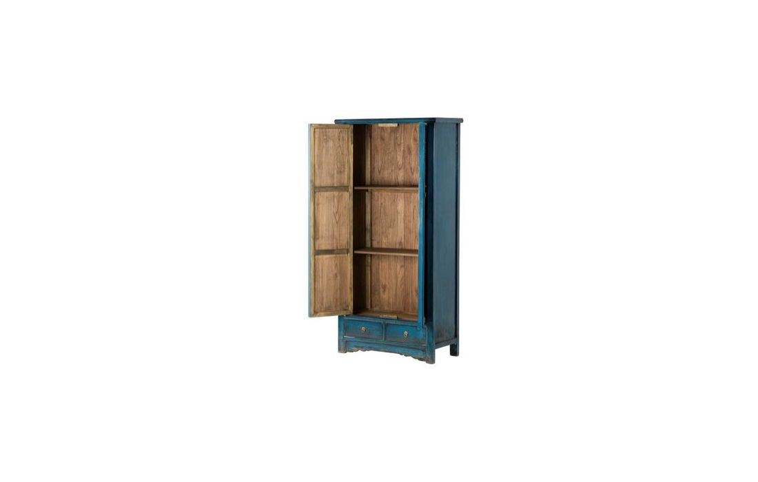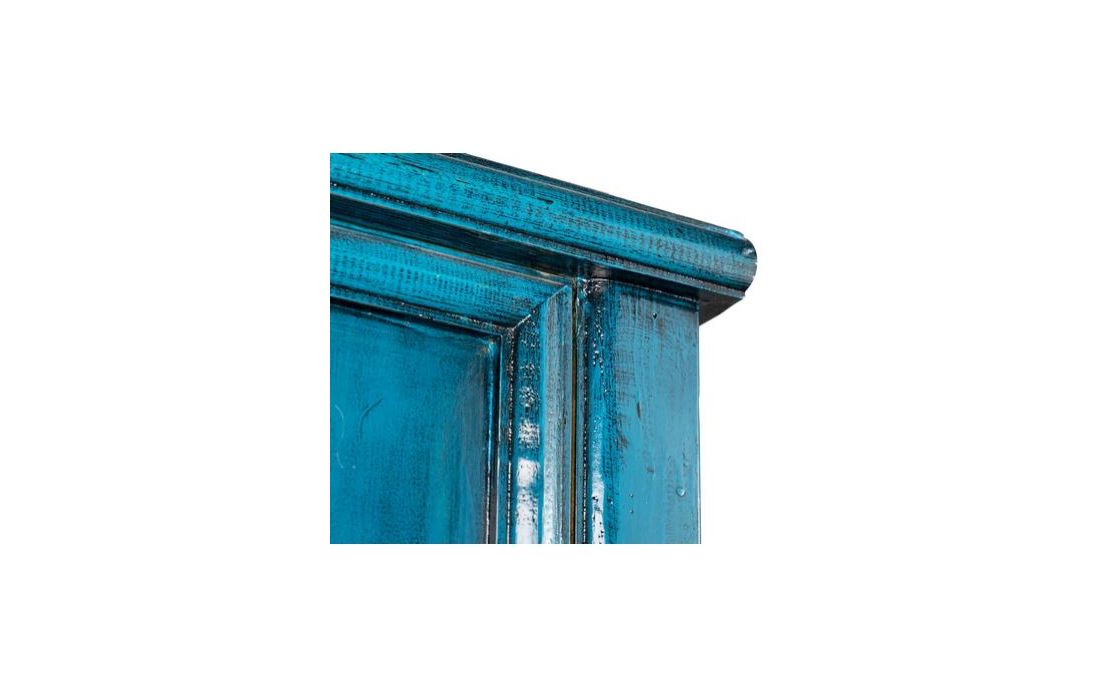 Tall piece of furniture with two doors and two drawers painted blue, with an aged finish