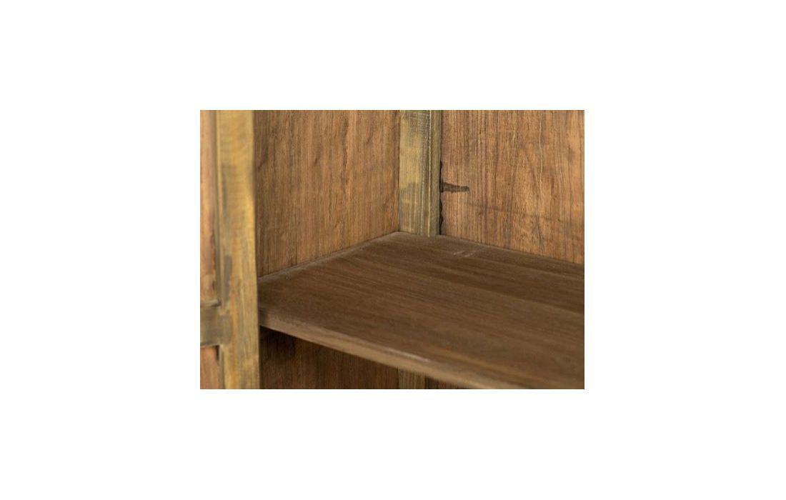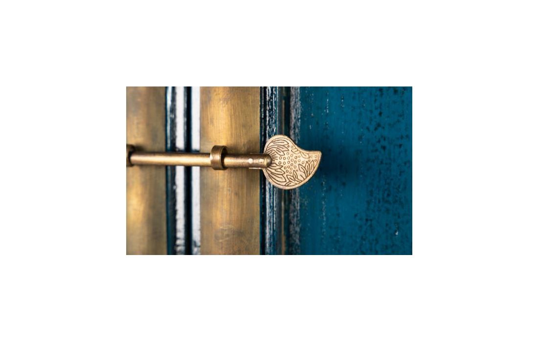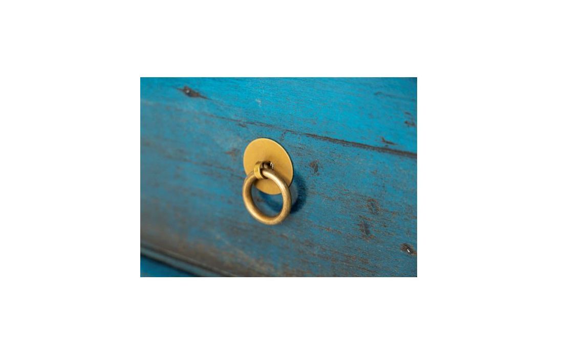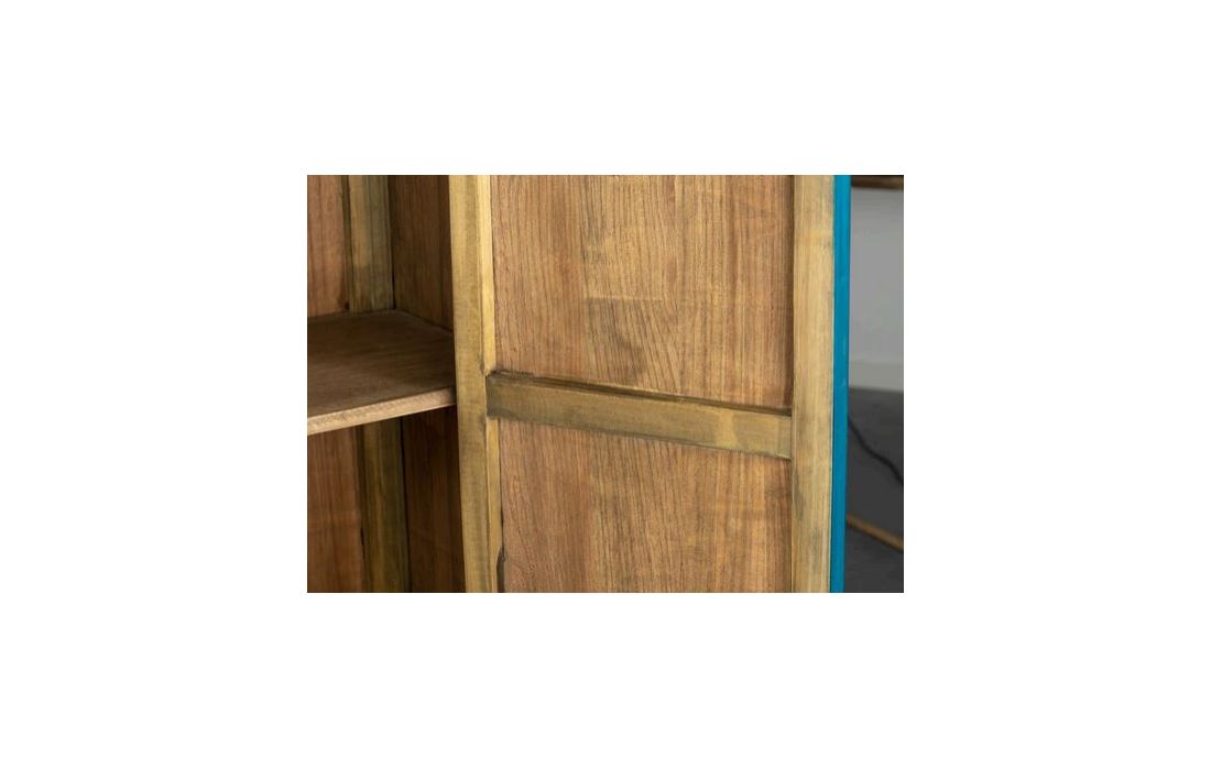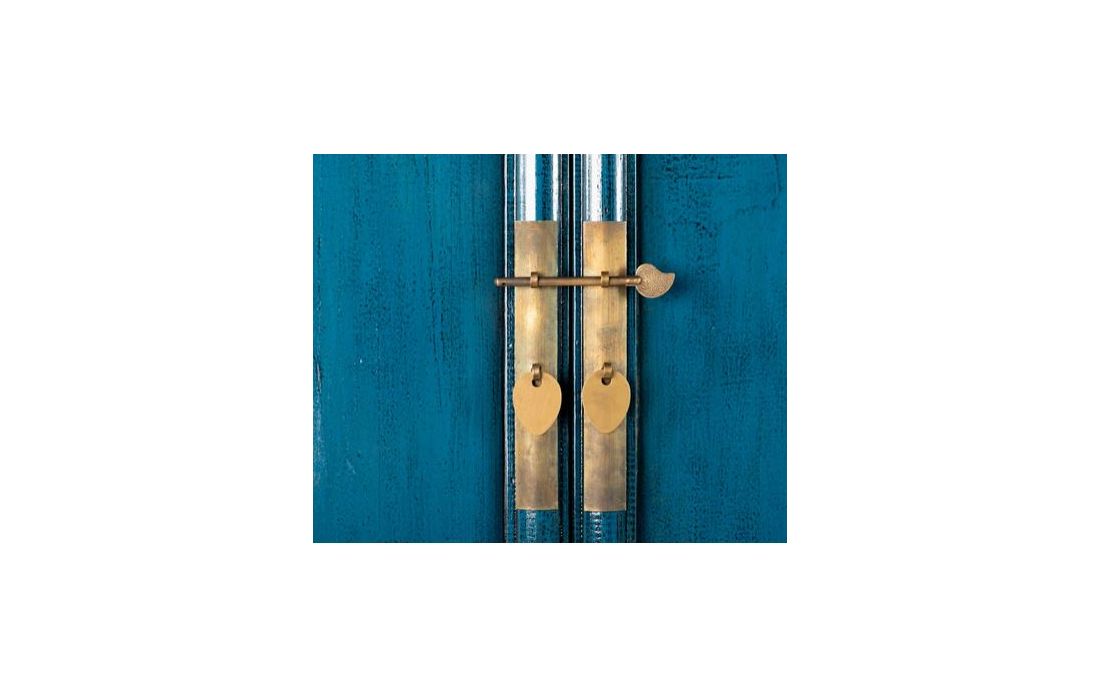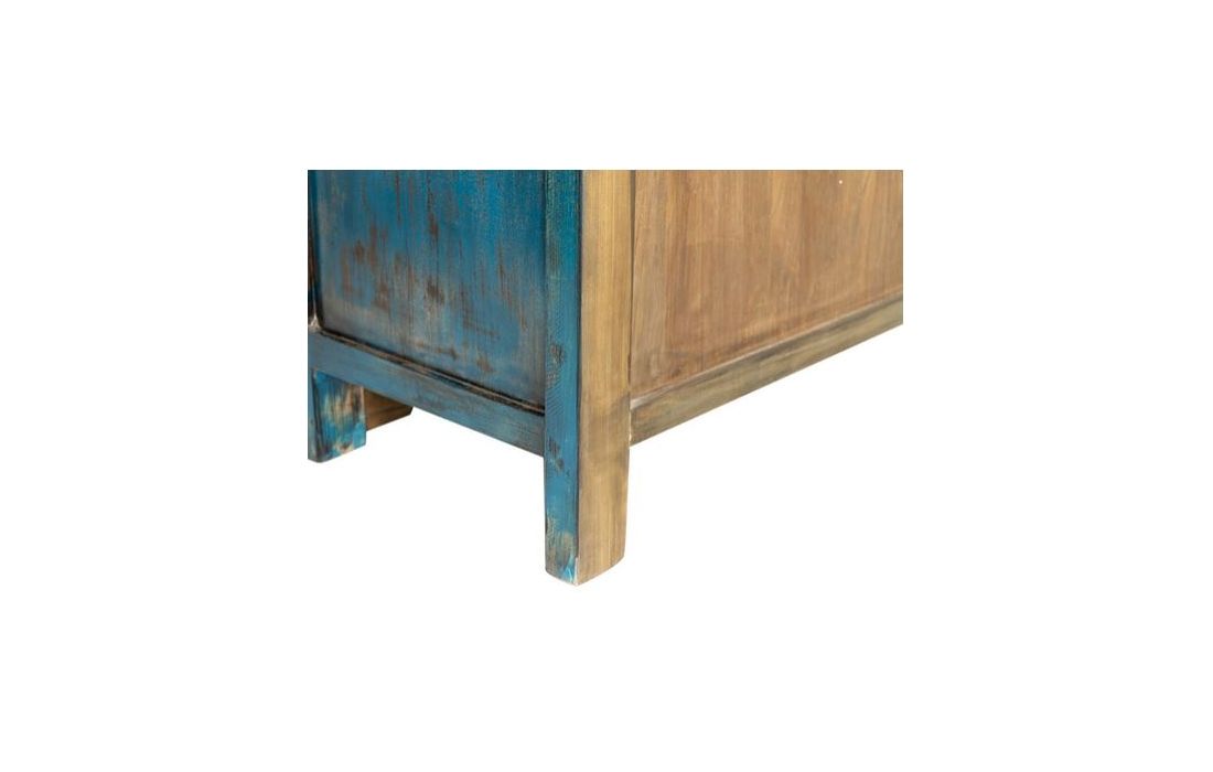 Tall piece of furniture with two doors and two drawers painted blue, with an aged finish