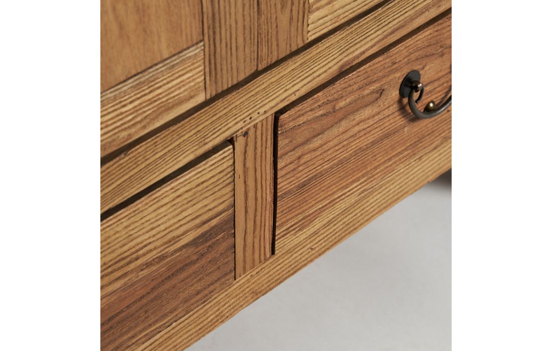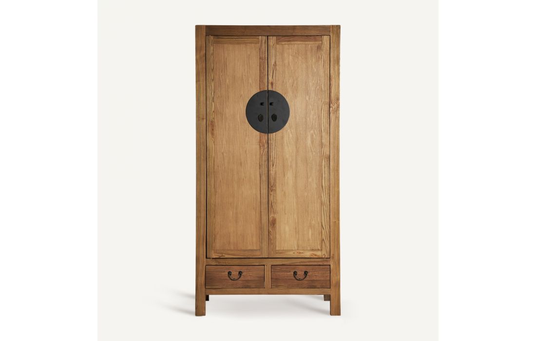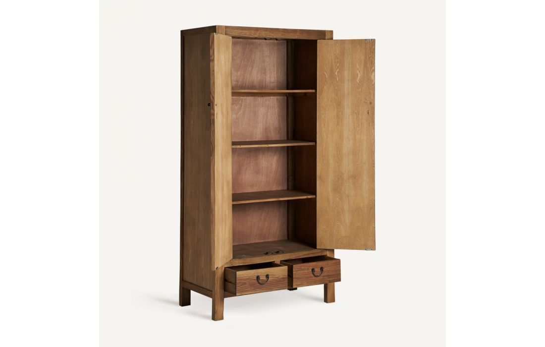 Tall piece of furniture with 2 doors, 4 internal shelves and 2 drawers, made of elm wood in natural color.