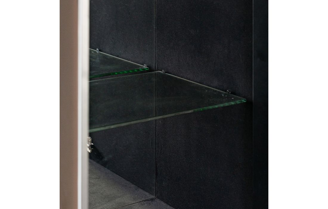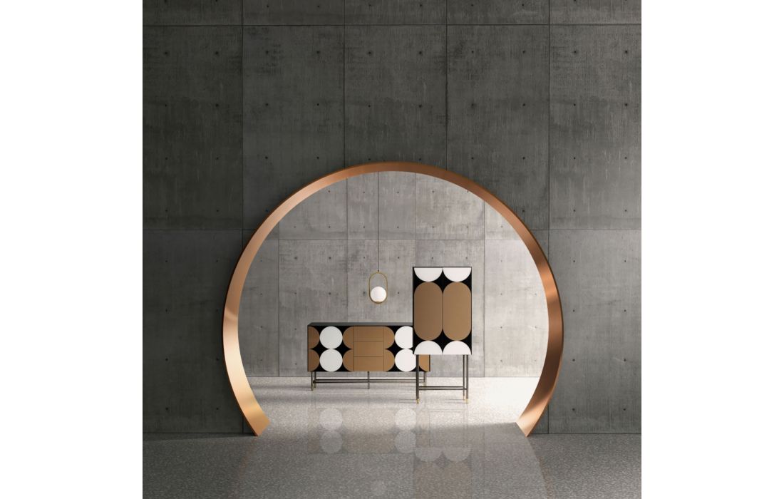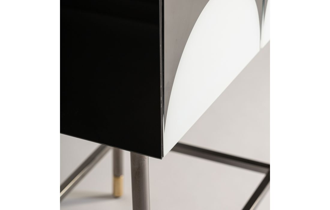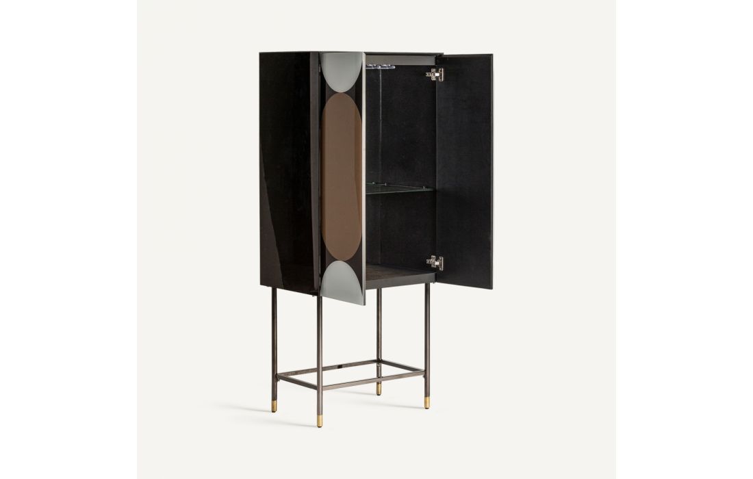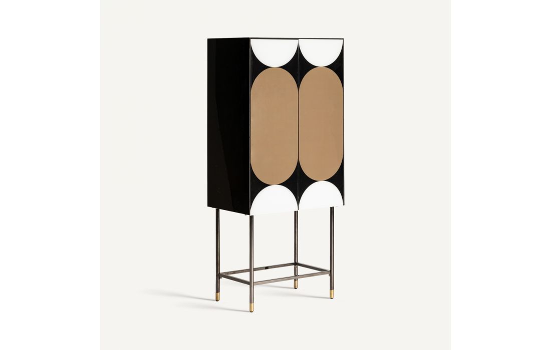 Bar furniture made of dm wood with glass shelves where dark tones such as black and brown predominate and where white is responsible for giving that touch of light to the pieces that make up the collection. With metal feet with a golden cup detail.