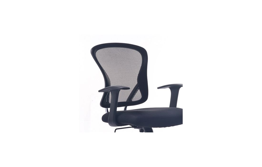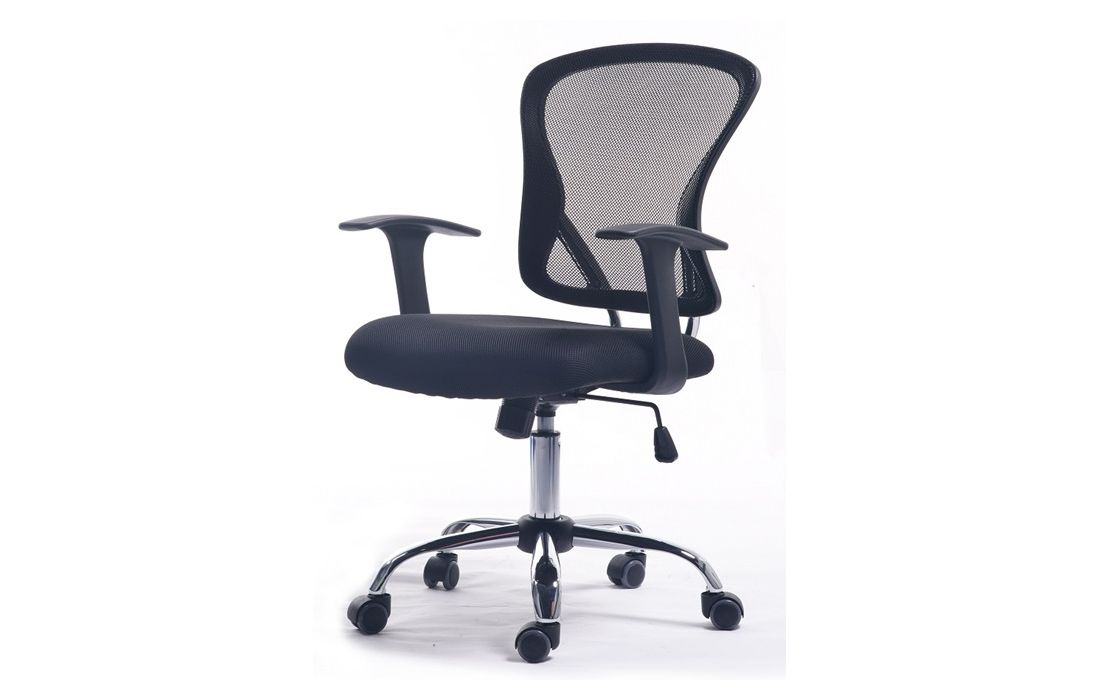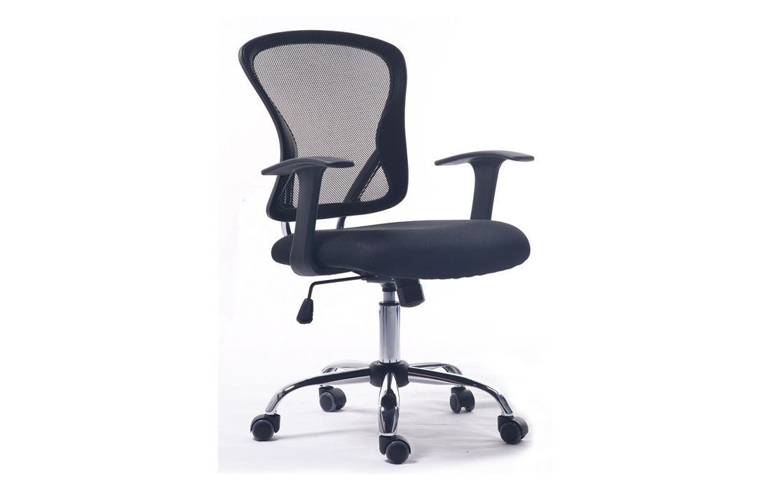 Revolving gas lift chair with tilt and lock, upholstered with mesh and black fabric and chromed metal base.