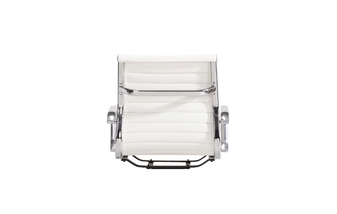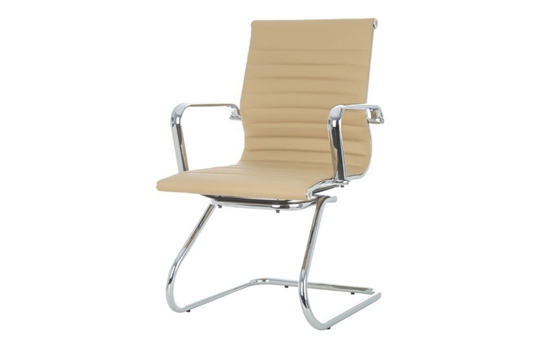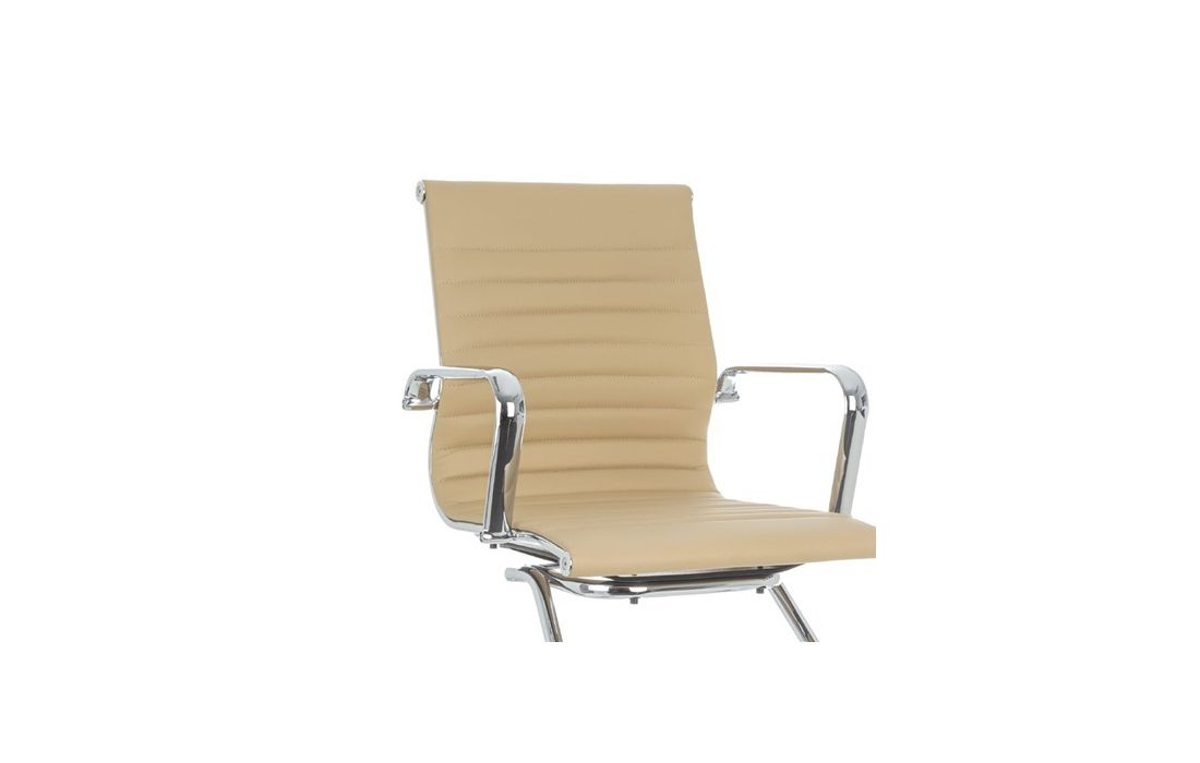 Chair with chromed metal structure and upholstered in beige, white and black synthetic leather.