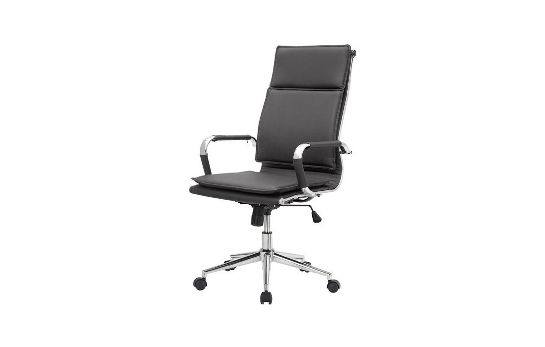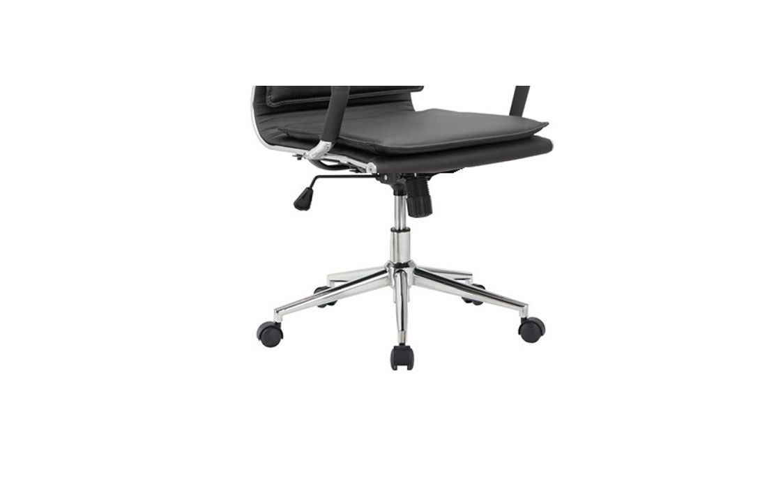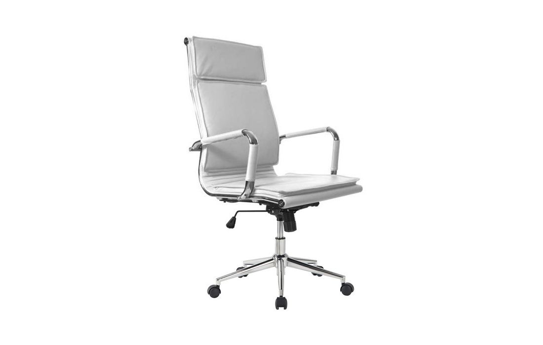 Swivel gas lift chair with tilt and lock, metal base and upholstered in white and black synthetic leather.
