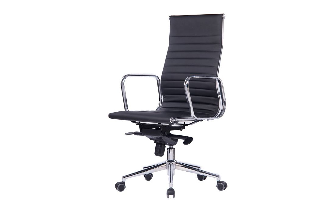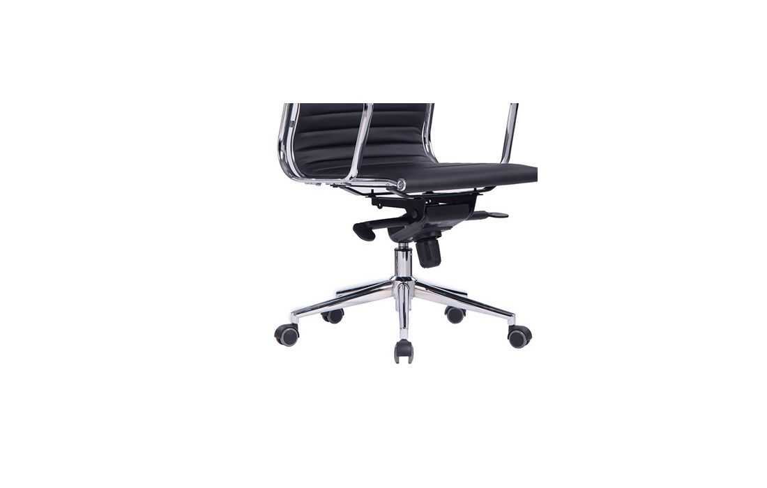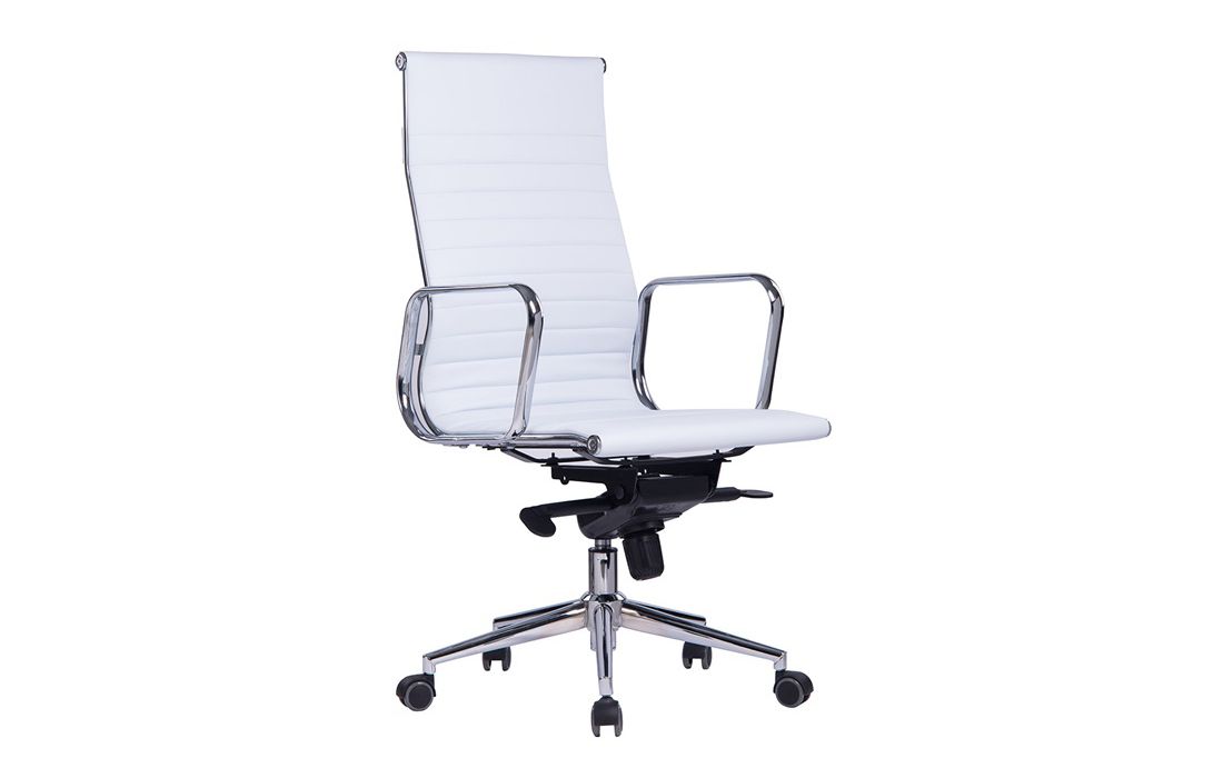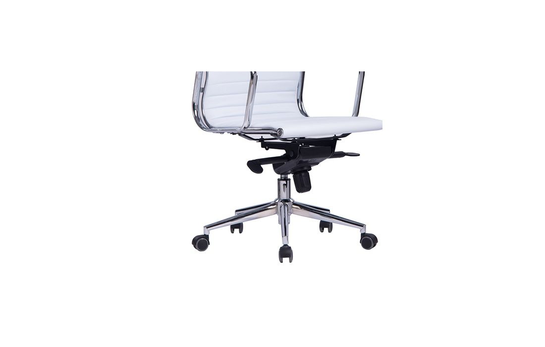 Swivel gas lift chair with tilt and lock, metal frame and white and black synthetic leather upholstery.