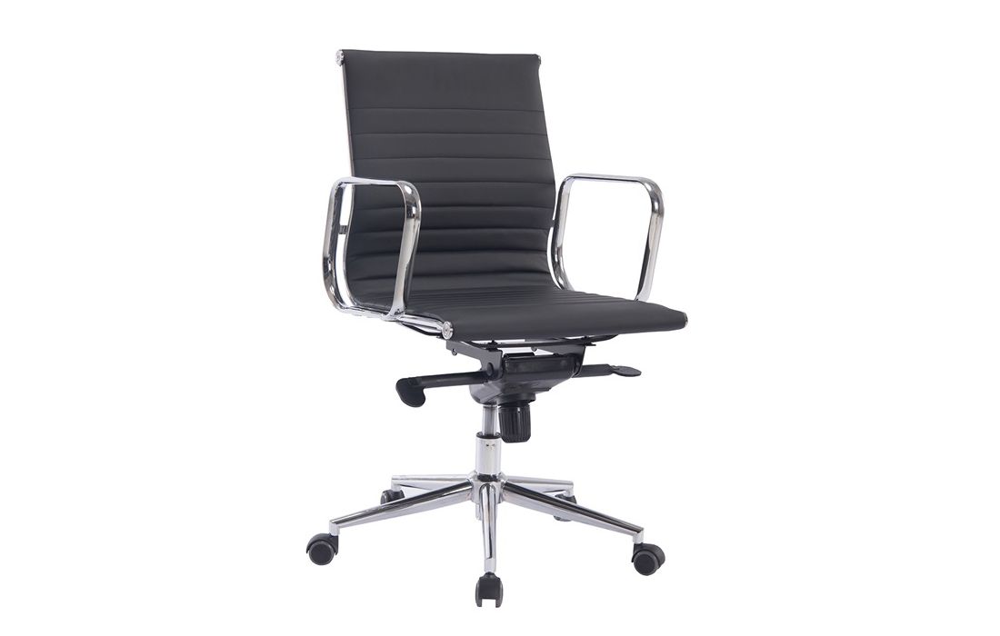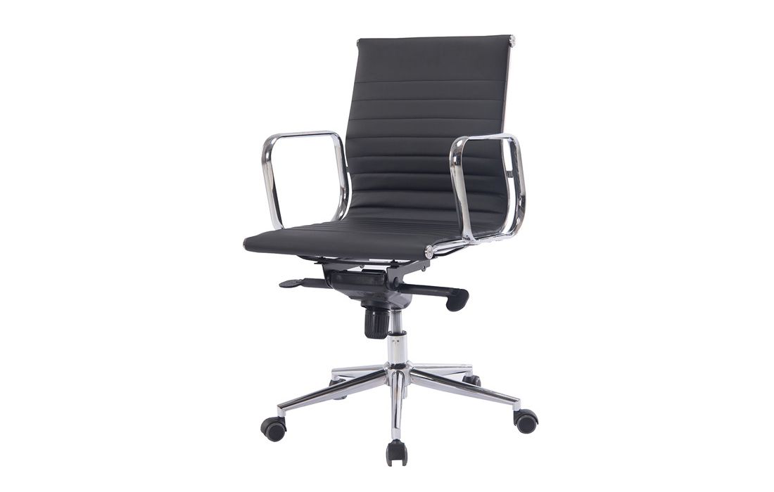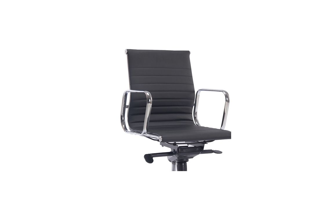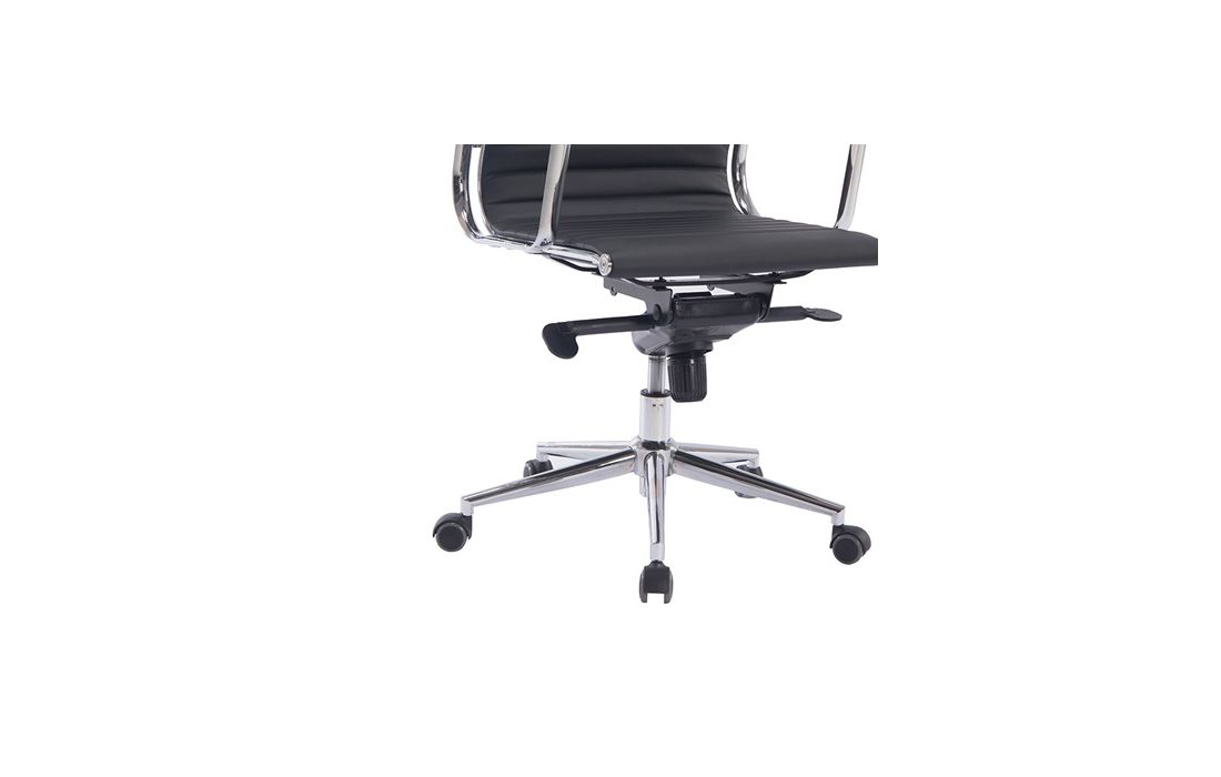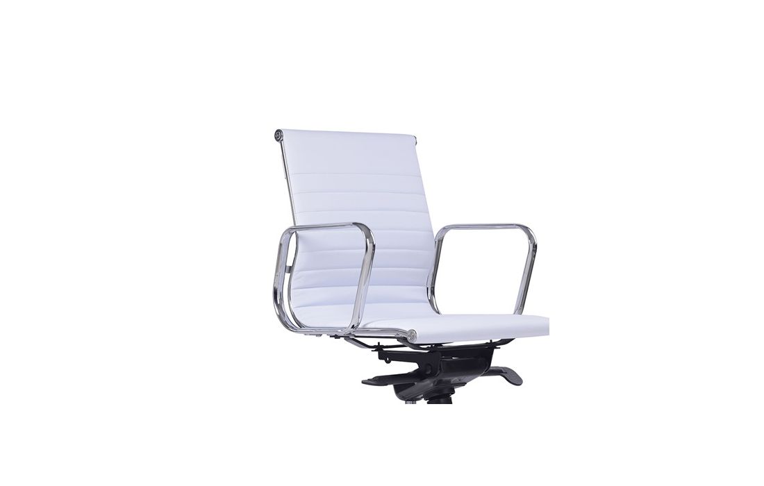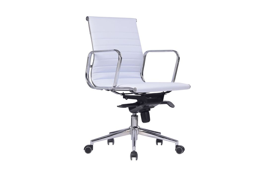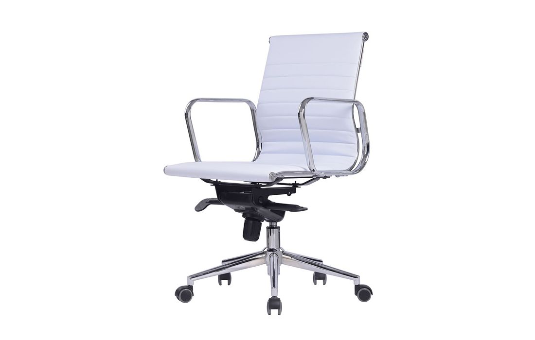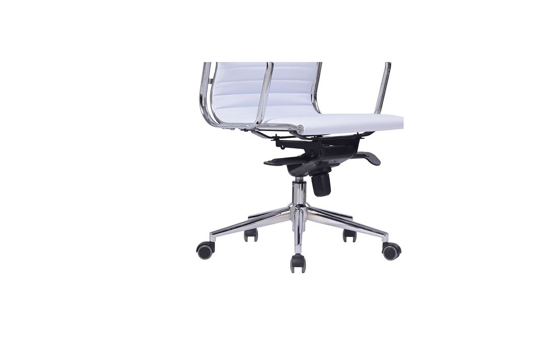 Swivel gas lift chair with tilt and lock, metal frame and white and black synthetic leather upholstery.