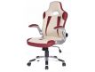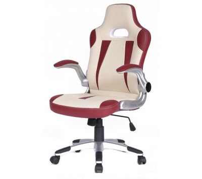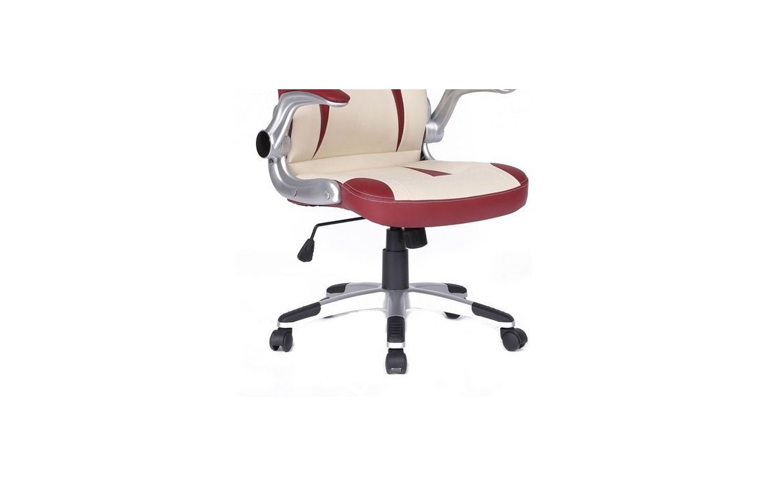Swivel gas lift chair with tilt and lock, metal frame and upholstered in synthetic leather and fabric.