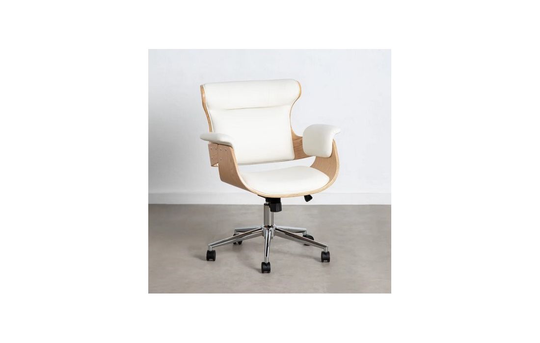 Swivel gas lift chair with tilt and lock, chromed metal base and upholstered in synthetic leather in camel, black and white.Dimensions in cmW 56 D 68 H 107/115Delivery time10 to 15 days