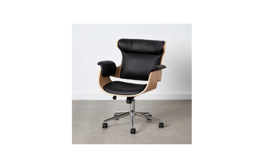 Swivel gas lift chair with tilt and lock, chromed metal base and upholstered in black synthetic leather.Dimensions in cmW 66 D 70 H 112/122Delivery time10 to 15 days