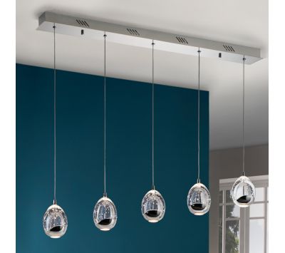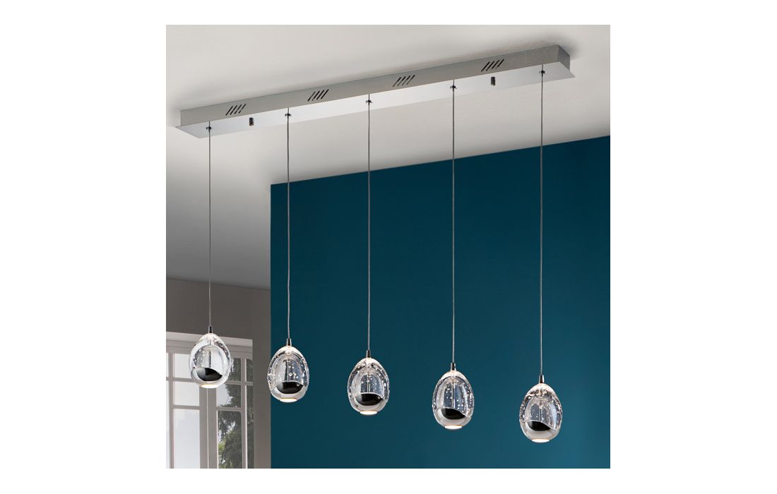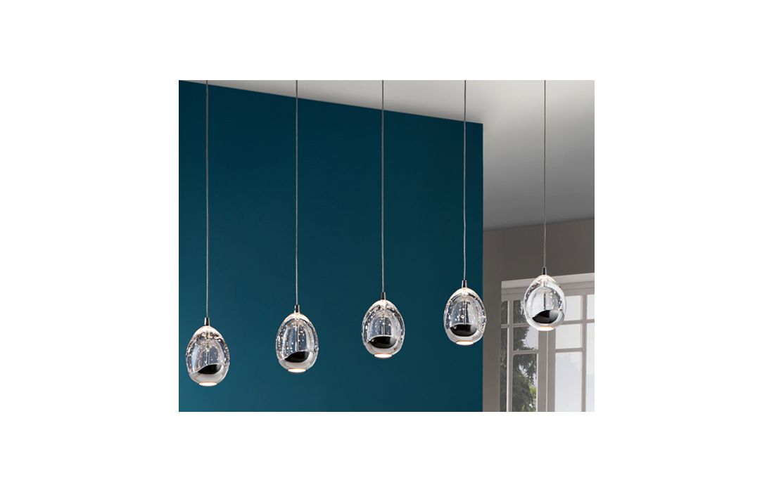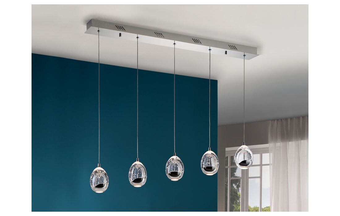 Ceiling lamp in metal with chrome trim and LED light. drop-shaped tulips in massive glass with decorative bubbles in their interio. Height adjustable.