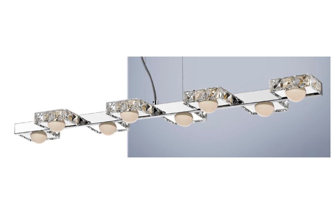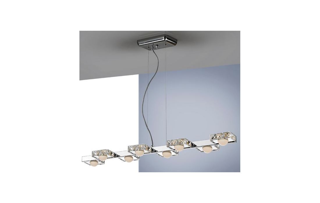 LED lamp 8 lights finish chromium metal. Square tulips with chrome frame, transparent facetted glass exterior and opal spherical diffuser.