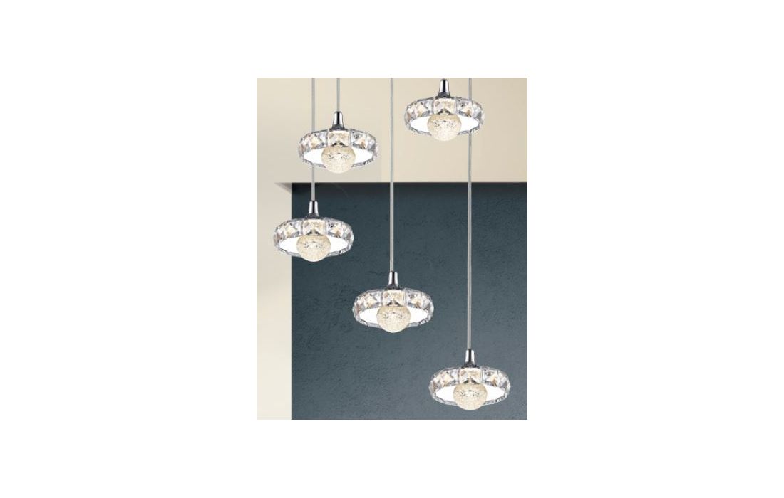 Ceiling lamp LED lights 5 finish chromium metal. Round tulips with chrome rim, transparent facetted glass exterior and spherical diffuser with textured interior.