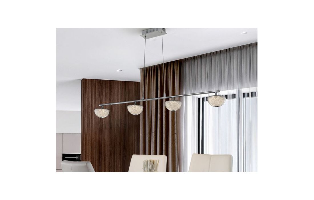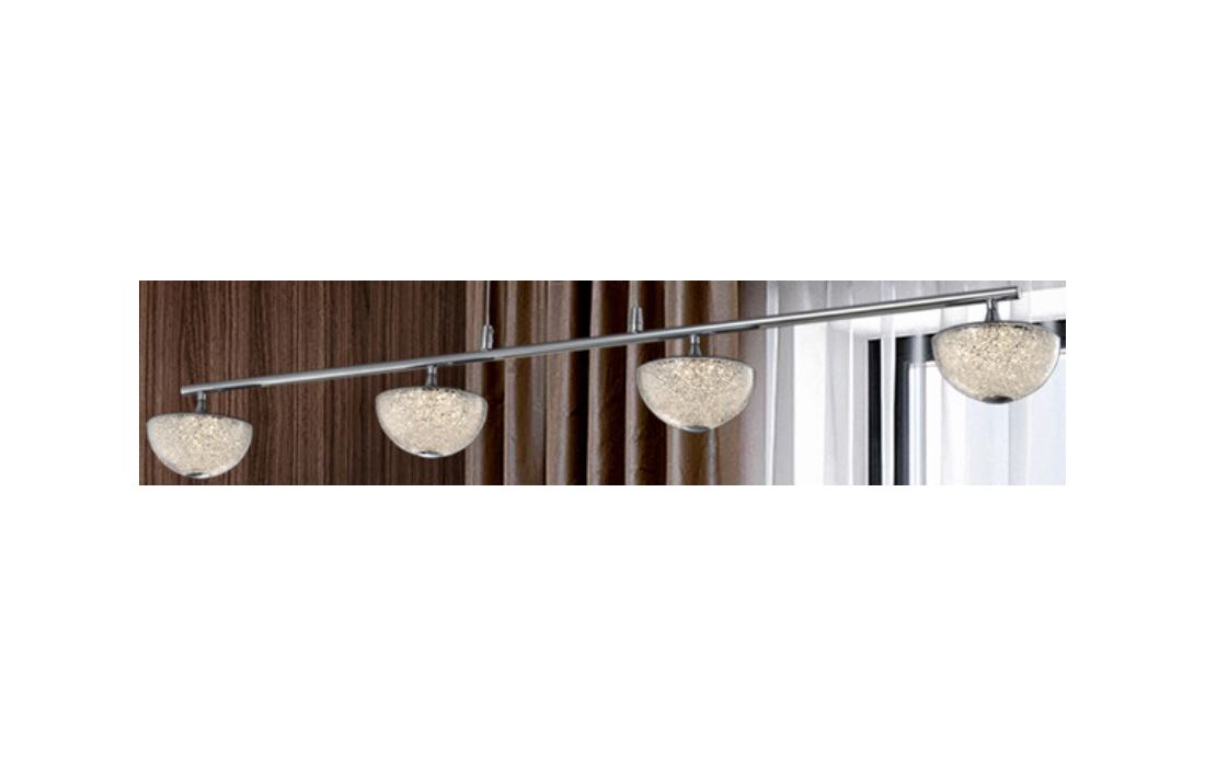 Ceiling lamp with 4 LED lights, chromed metal and aluminum. Semi-spherical tulips in glass, with interior texture of granulated glass.
