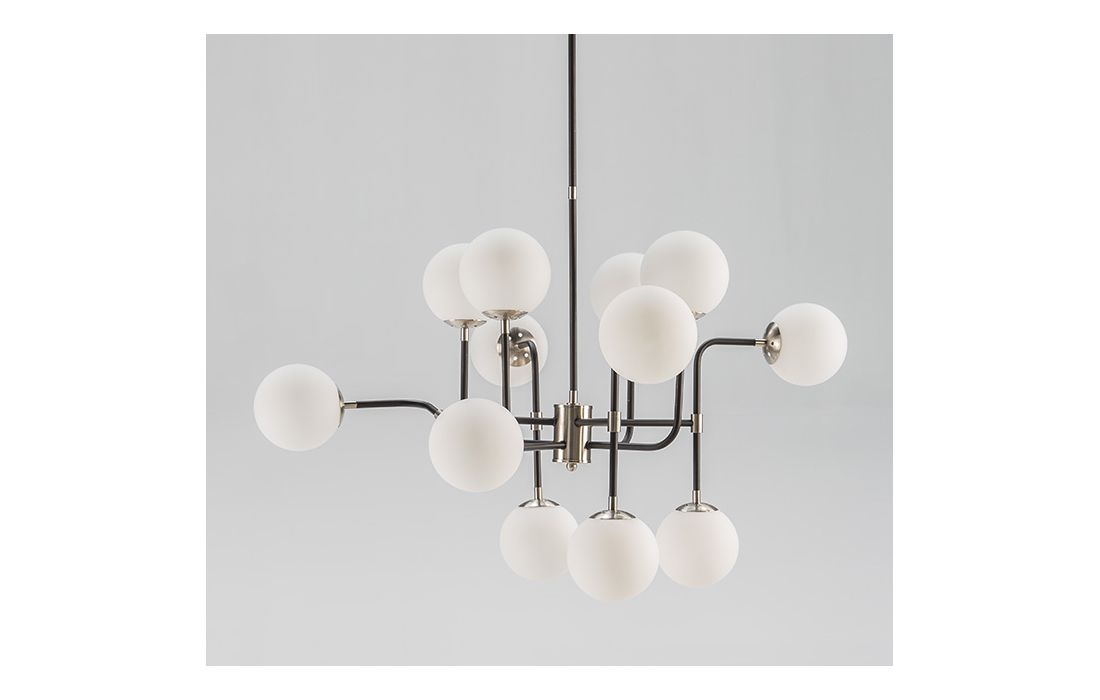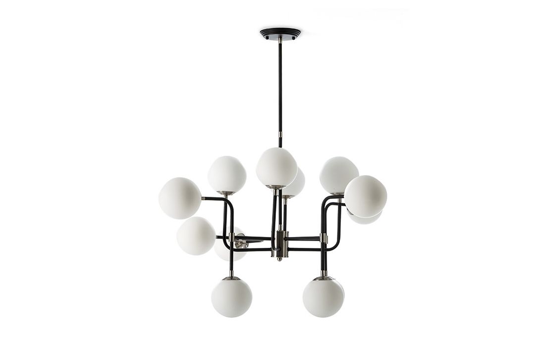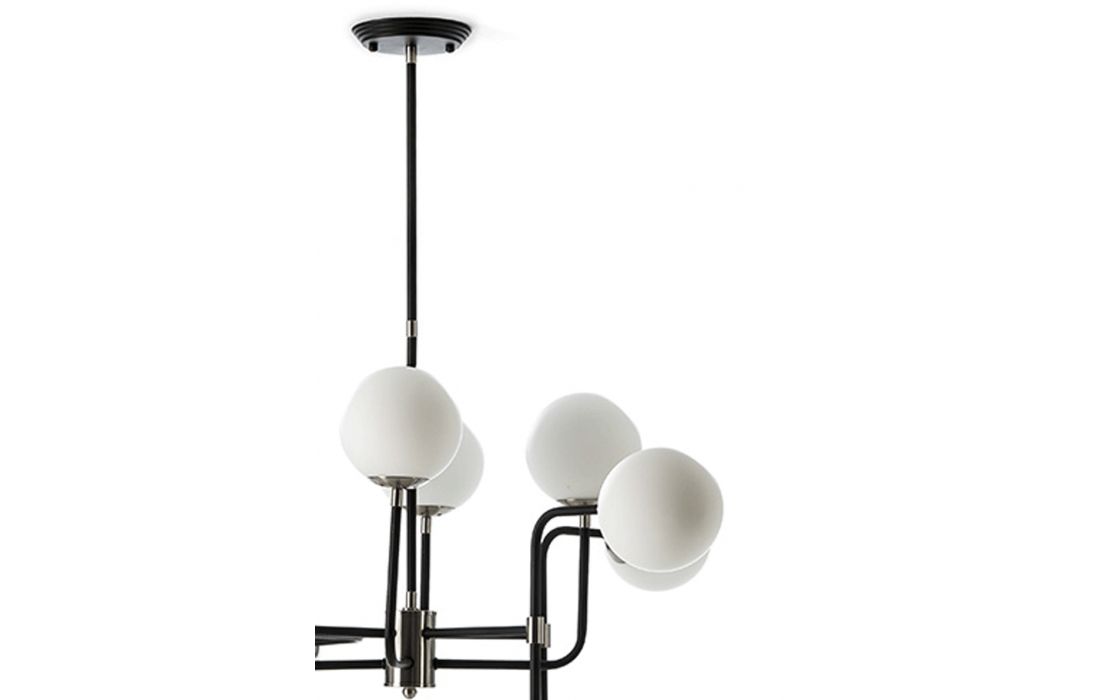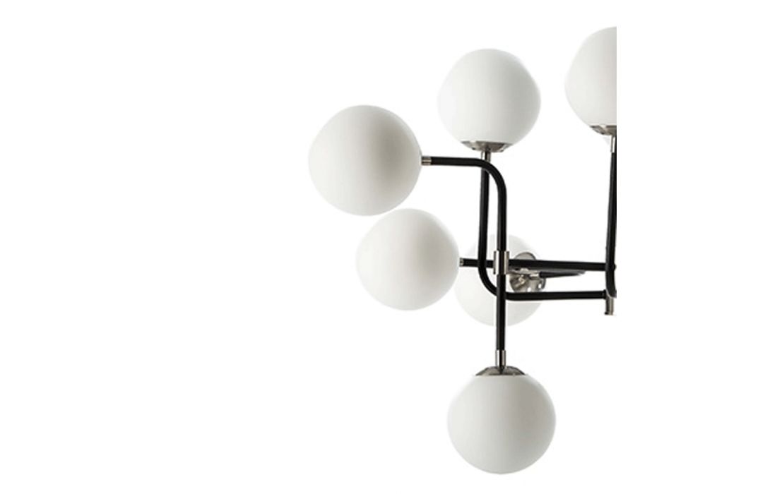 Black/nickel metal ceiling lamp and white glass balls.