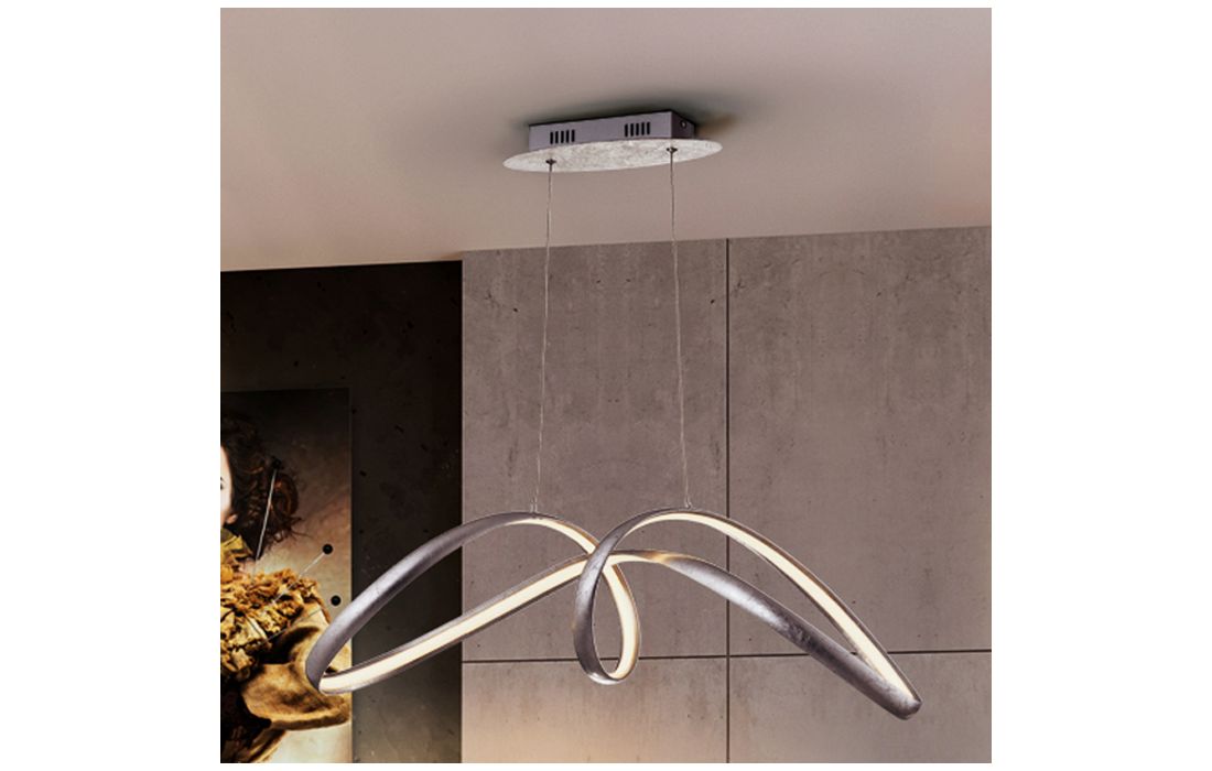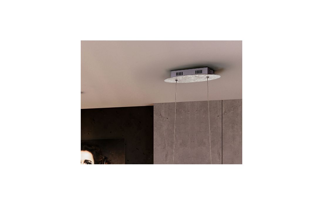 Ceiling lamp in steel and aluminum with silver leaf finish. Opal silicone diffuser. Height adjustable.