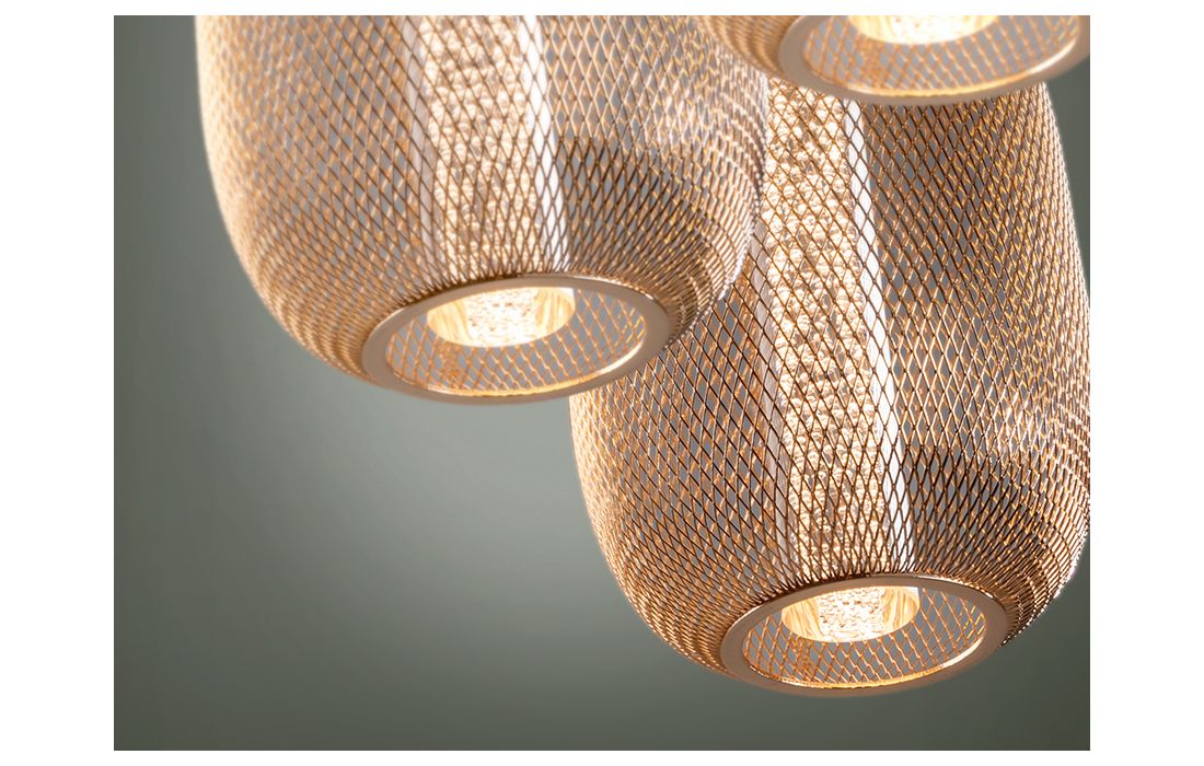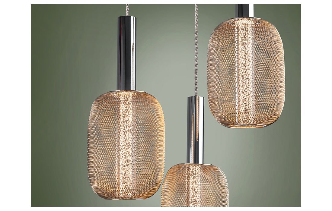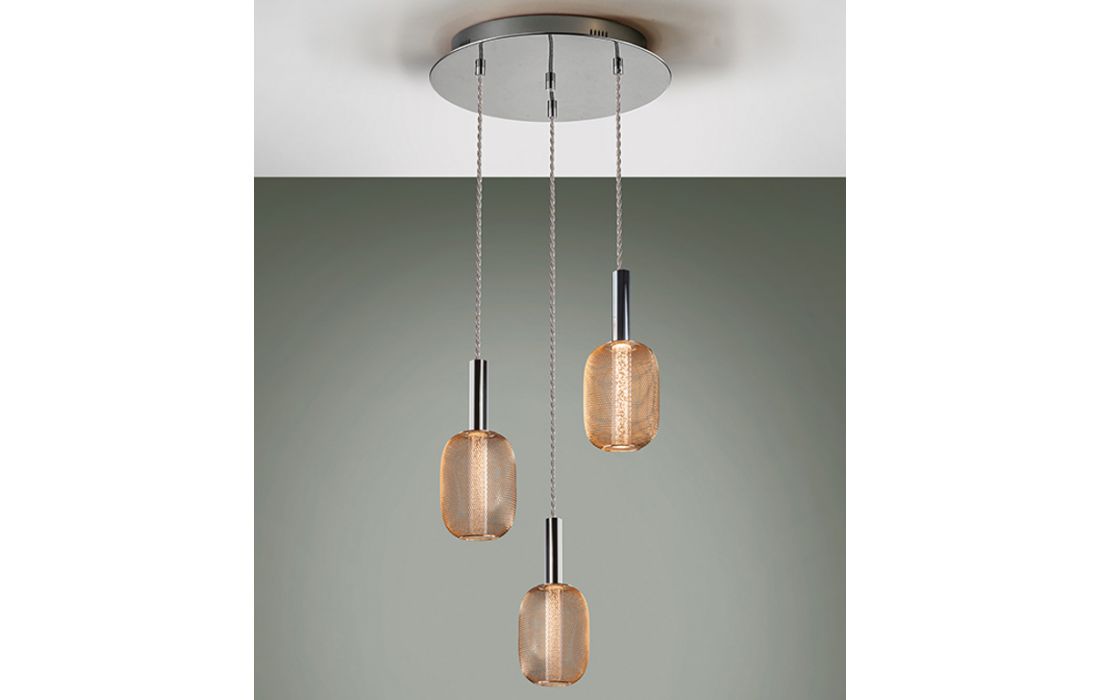 3 light LED ceiling lamp in chromed metal. Double tulip with transparent acrylic inner cylinder with bubbles and shiny gold metallic outer shell.