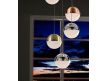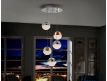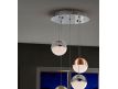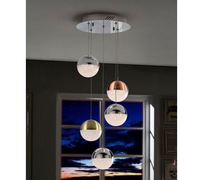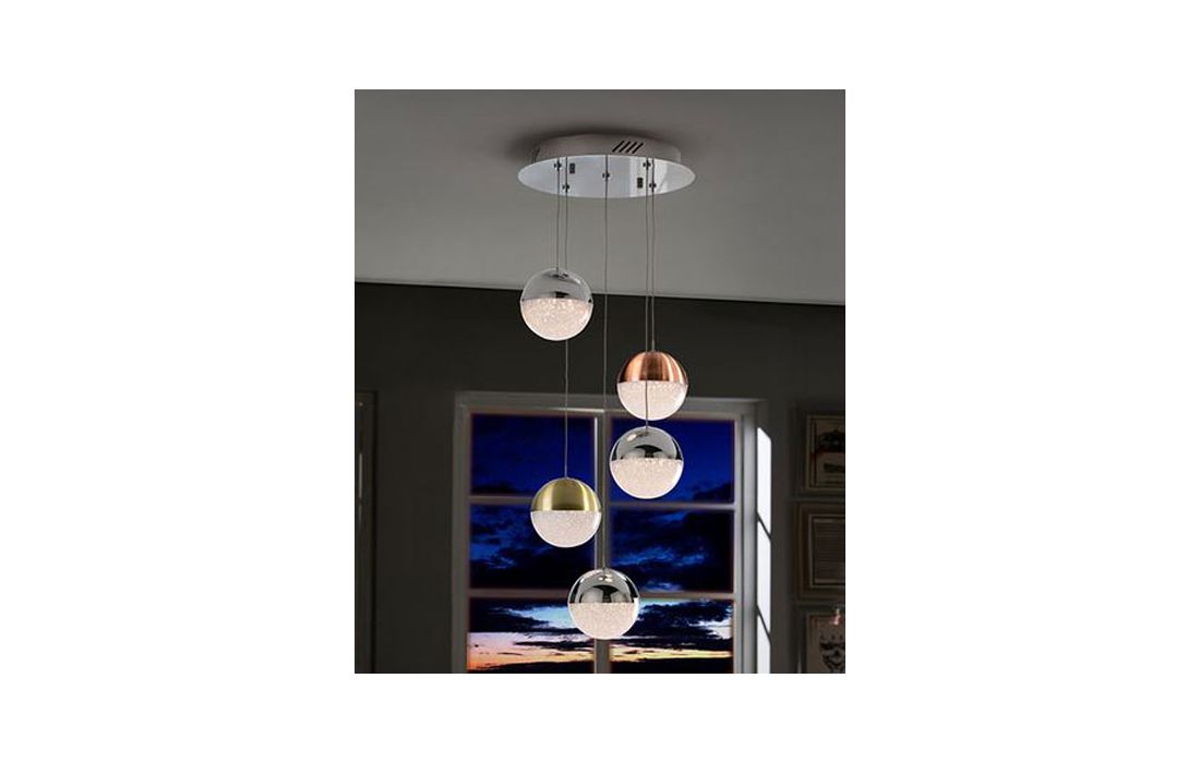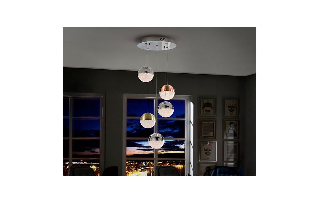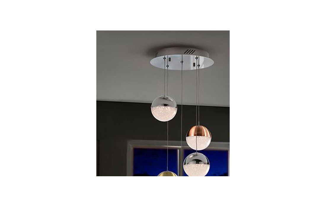 Ceiling lamp with 5 LED lights, made of metal, chrome finish. Spherical 12 cm polycarbonate tulips with textured interior and metal, finished in satin copper, satin brass and chromium. Height adjustable.
