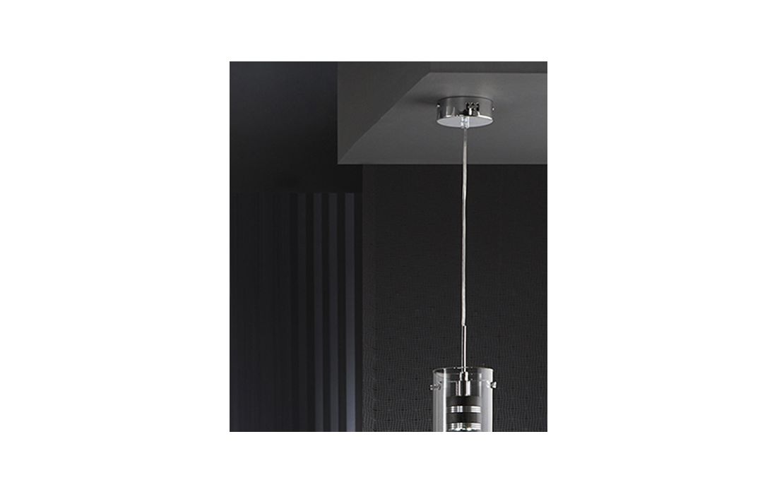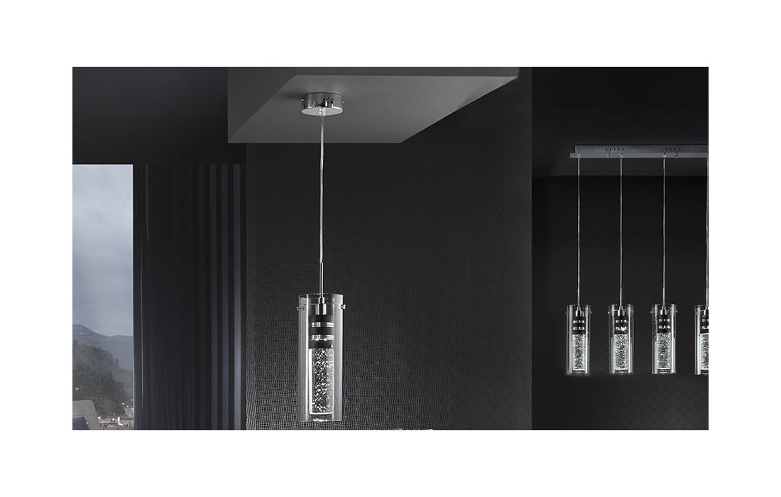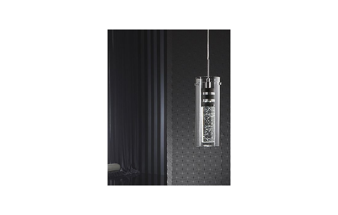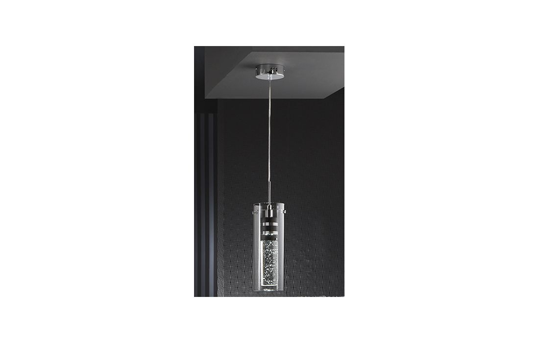 1 light ceiling lamp made of chromed metal and lacquered aluminum. Height-adjustable tulip made of transparent glass and solid faceted glass bar with decorative bubbles inside.