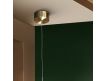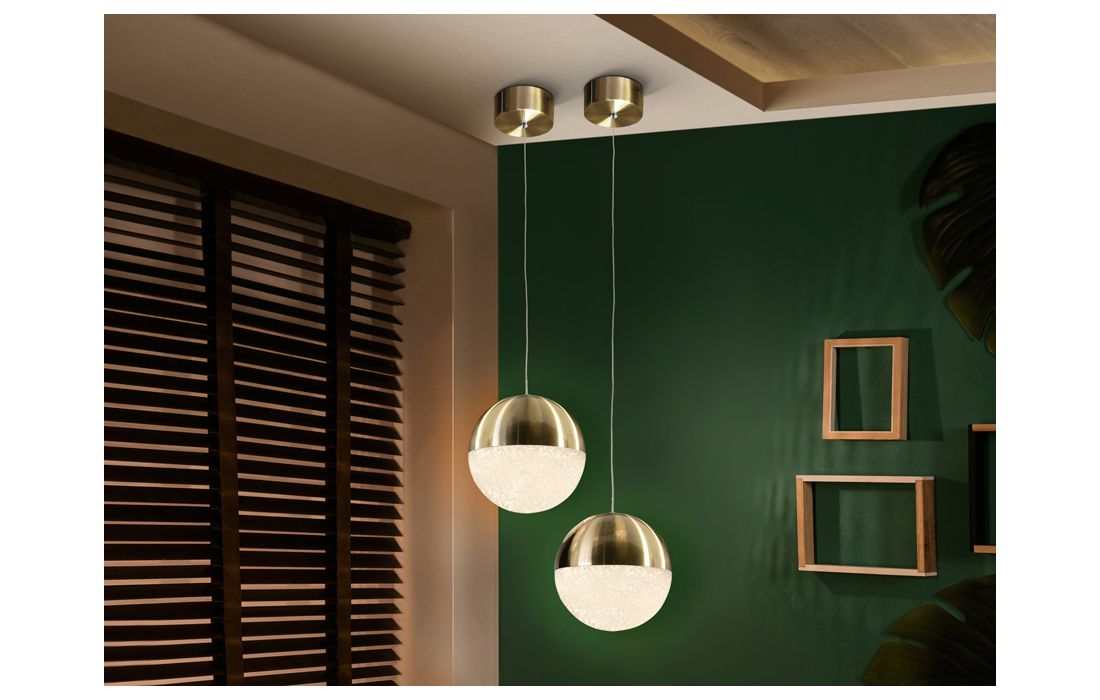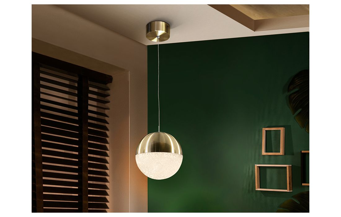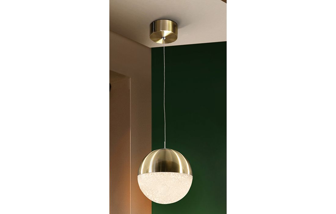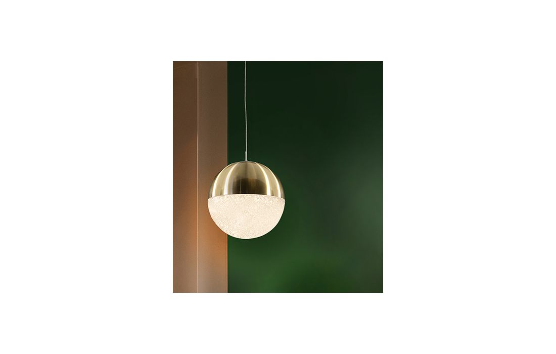 Ceiling lamp 1 LED light made of metal with satin brass finish. Spherical Ø20 cm polycarbonate tulip with textured interior and chromed metal. Height adjustable.
