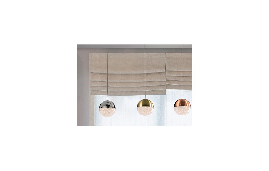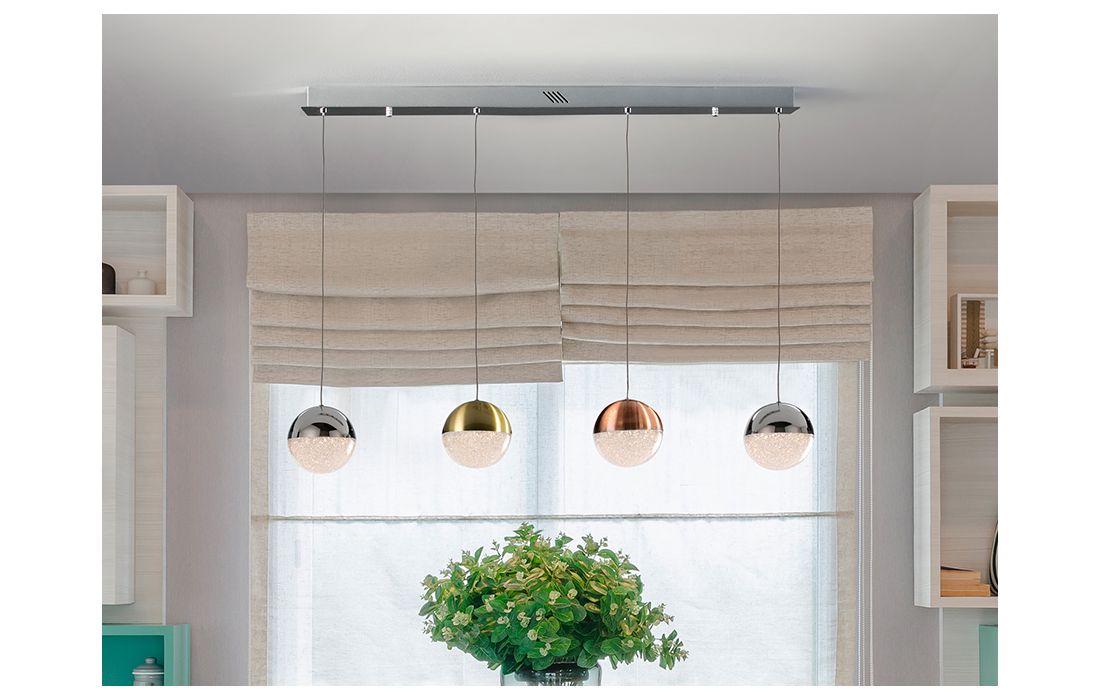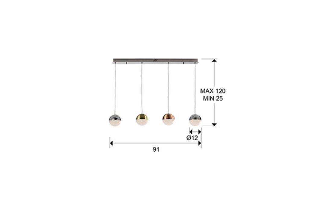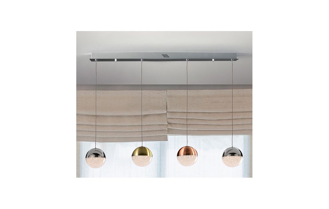 Ceiling lamp 4 LED lights, made of metal, chrome finish. Spherical 12 cm polycarbonate tulips with textured interior and metal, finished in satin copper, satin brass and chrome. Height adjustable.