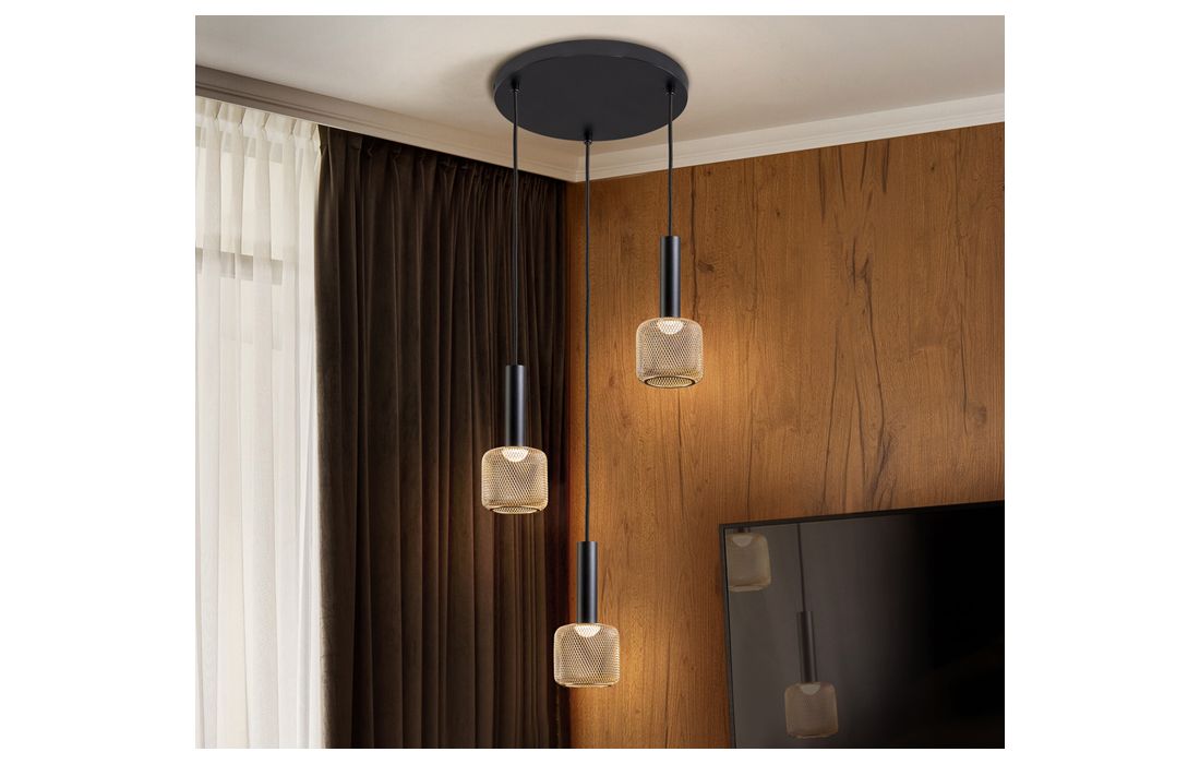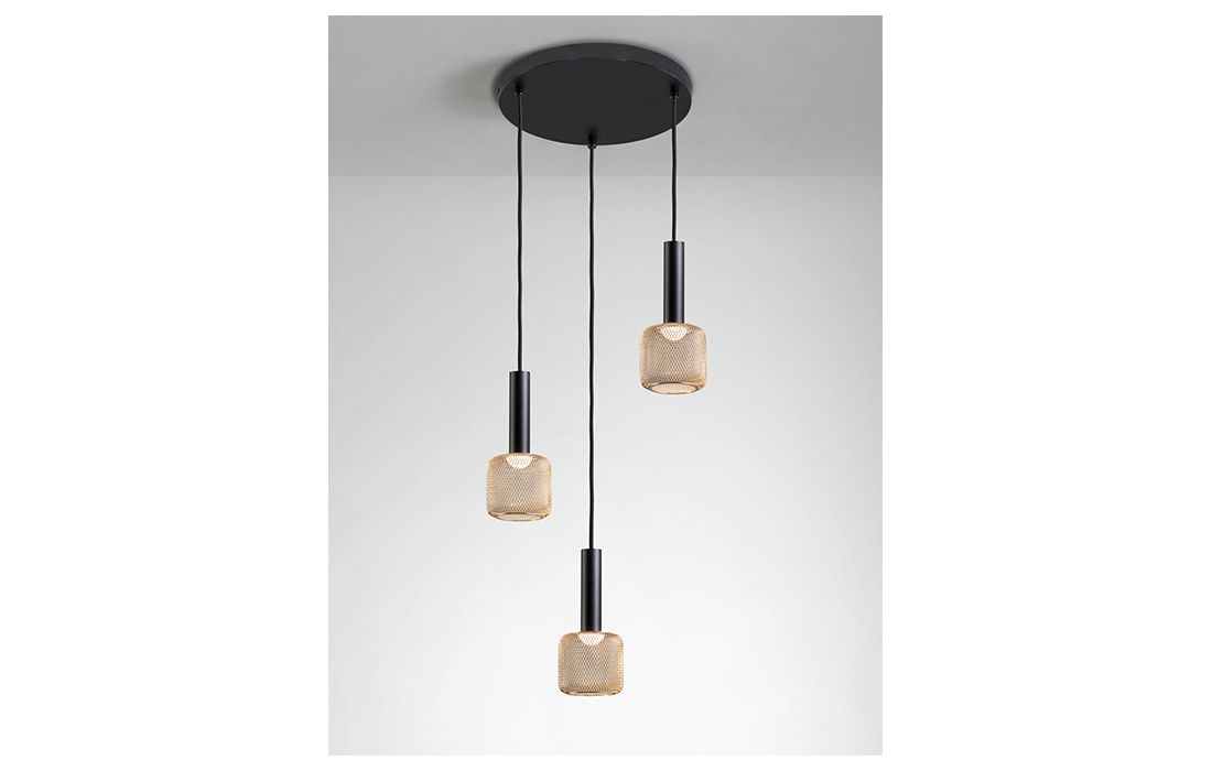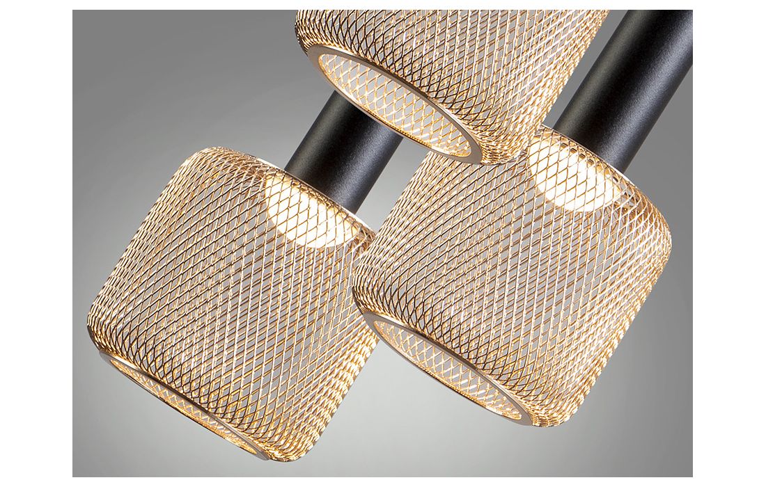 LED ceiling lamp with 3 lights in matt black metal and gloss gold metallic mesh tulip, opaline acrylic diffuser.