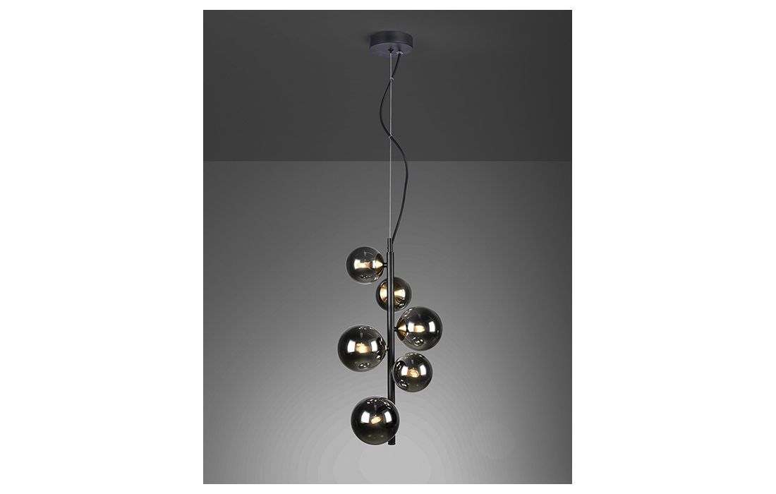 Ceiling lamp 6 lights in metal matt black finish and polished lead. Mirrored smoke gray glass spherical tulips. Height adjustable.