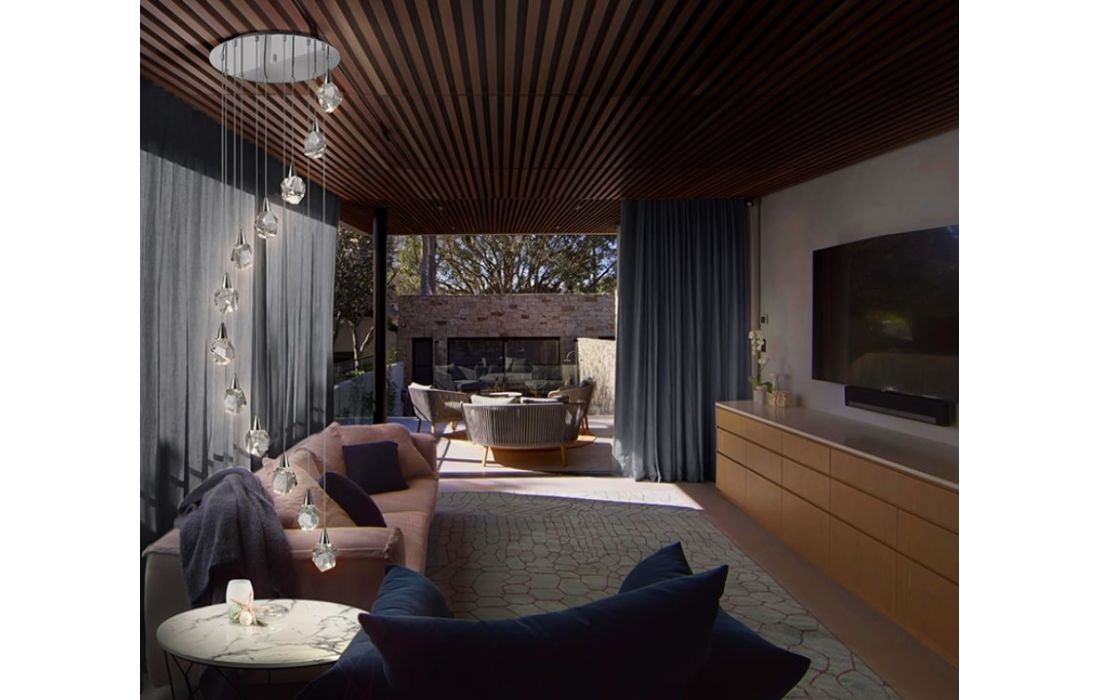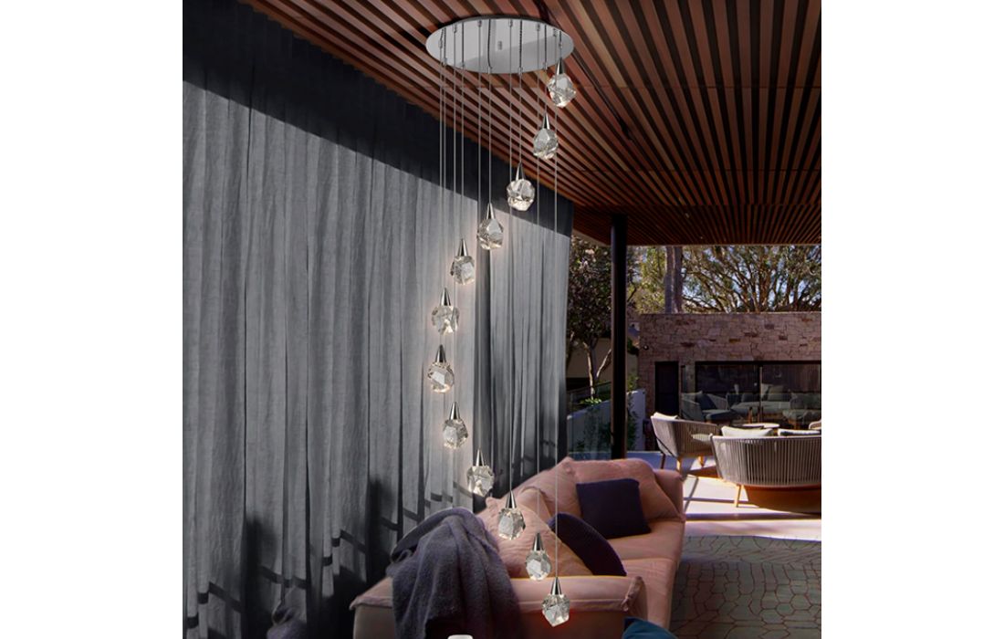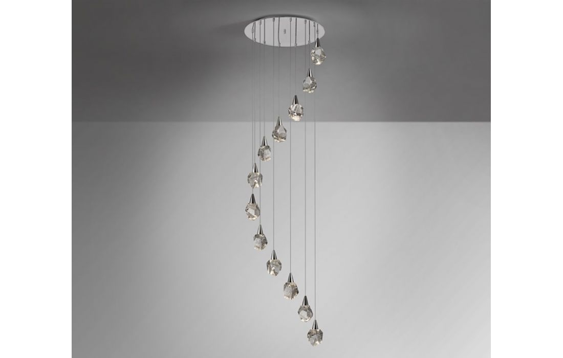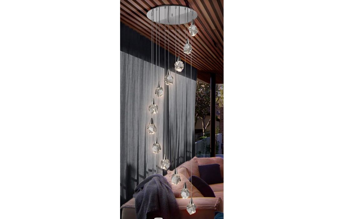 Ceiling lamp with 12 LED light, in metal, chrome finish. Polyhedral lampshade made of solid glass with decorative balls outside the interior. Height adjustable.