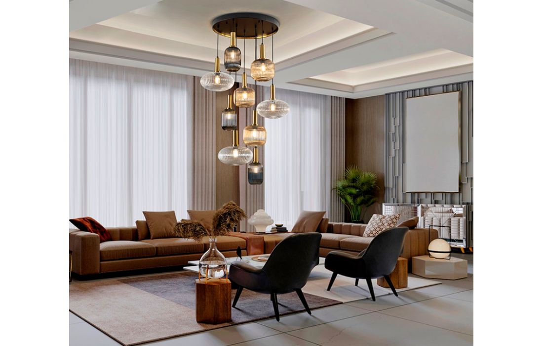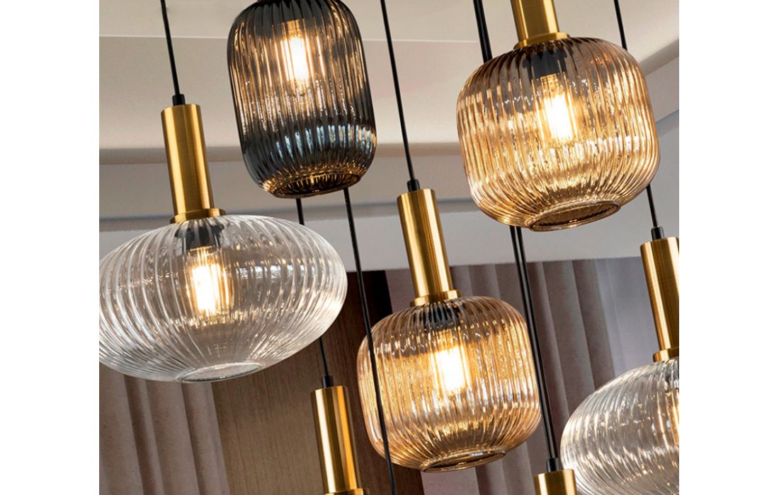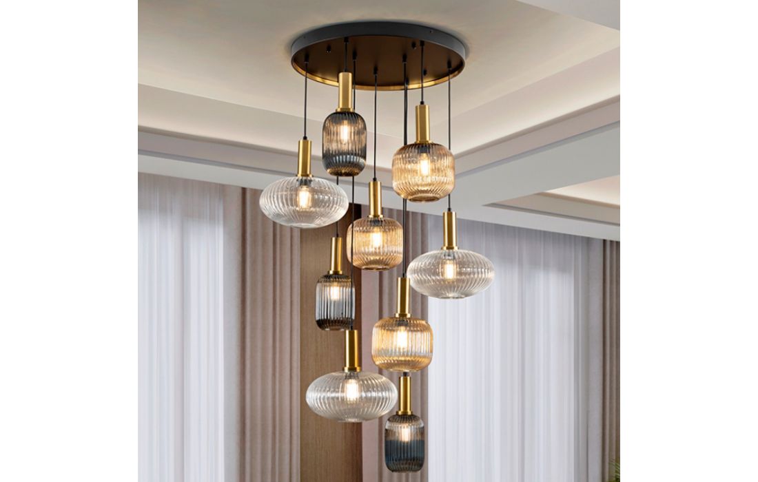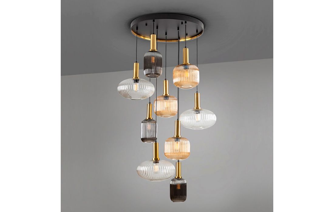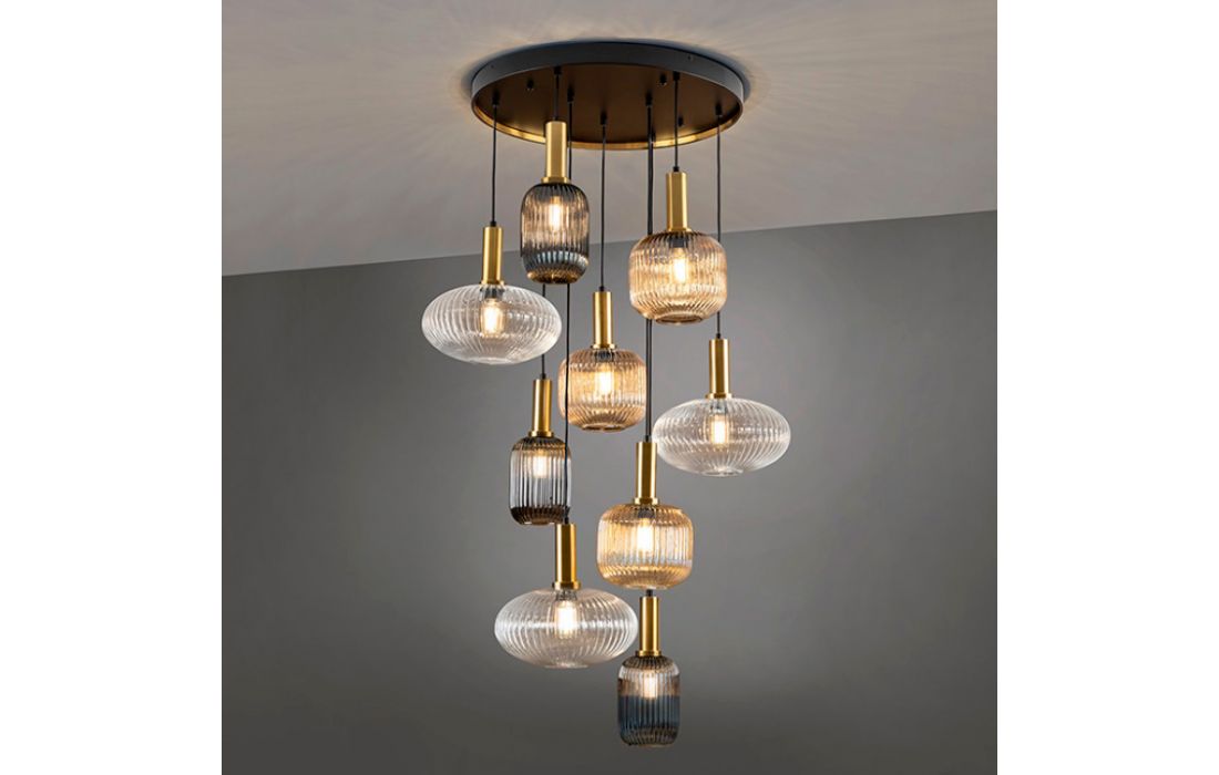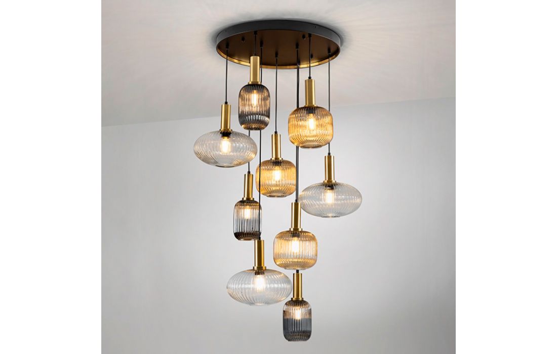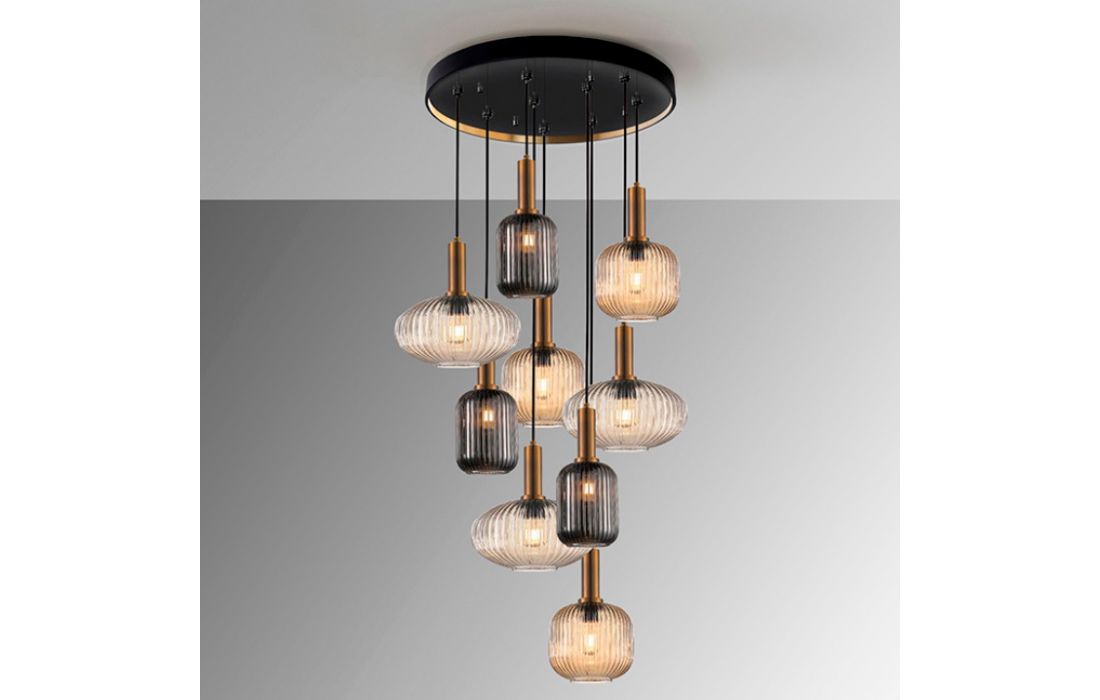 9-light metal ceiling lamp in matt black finish with satin brass details. Glass lampshades with a transparent, amber and smoked gray finish.