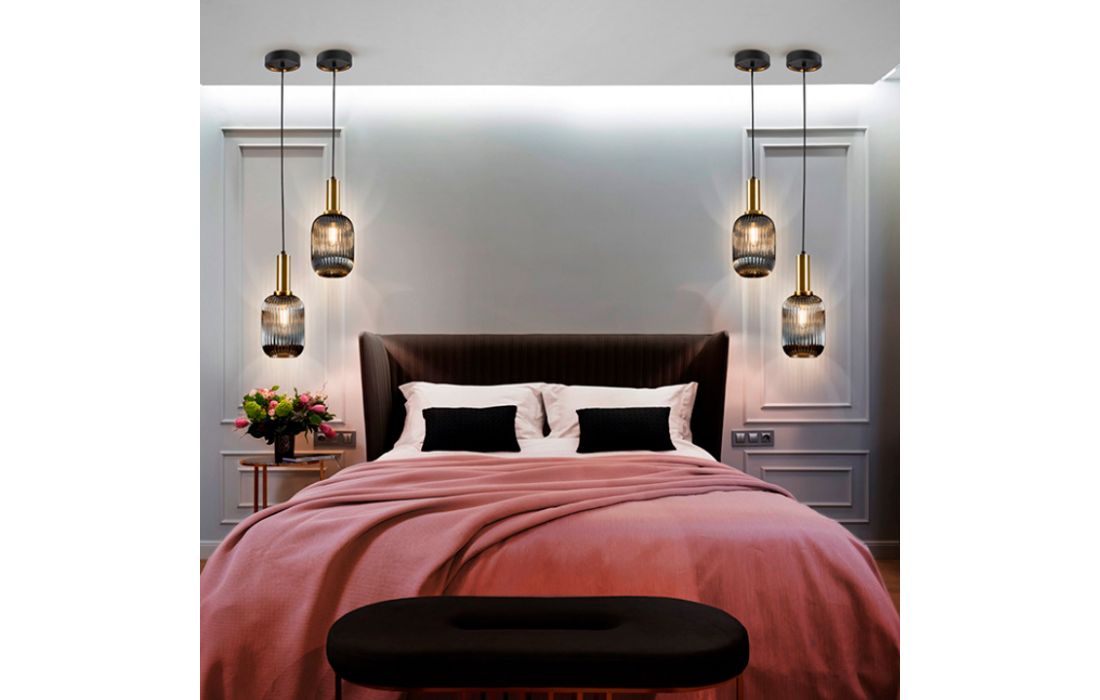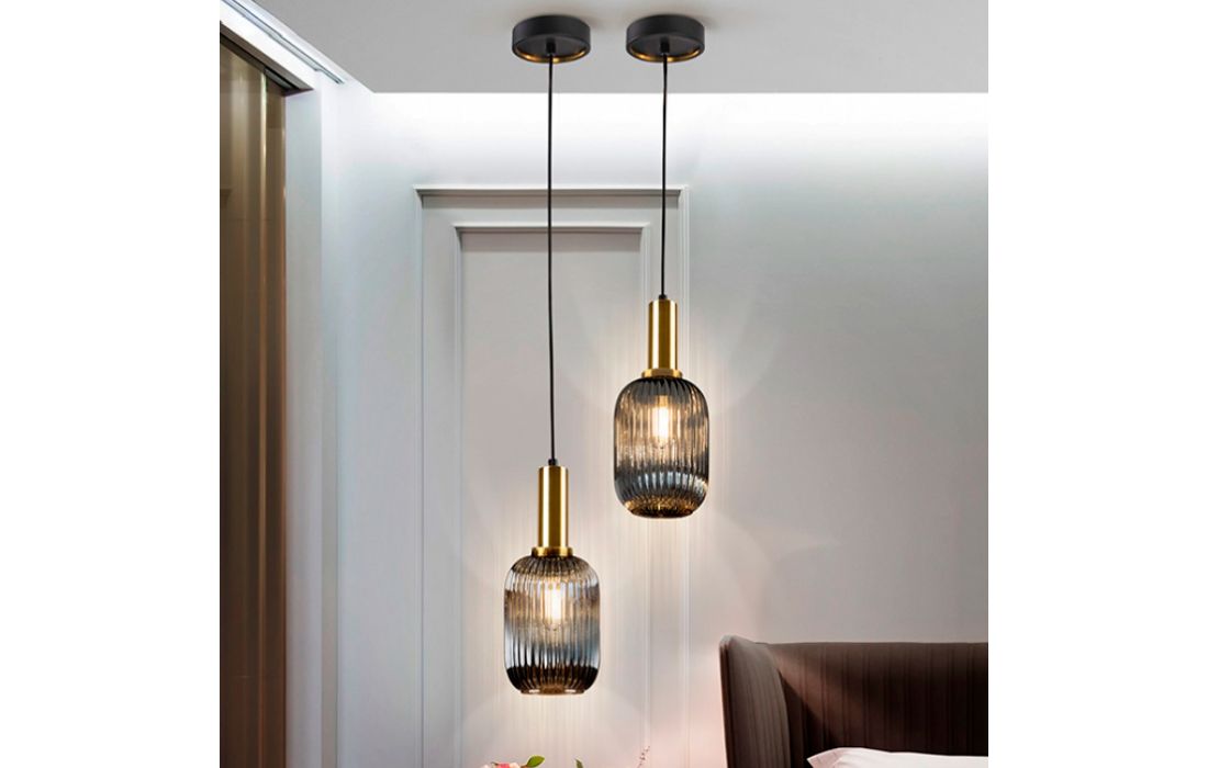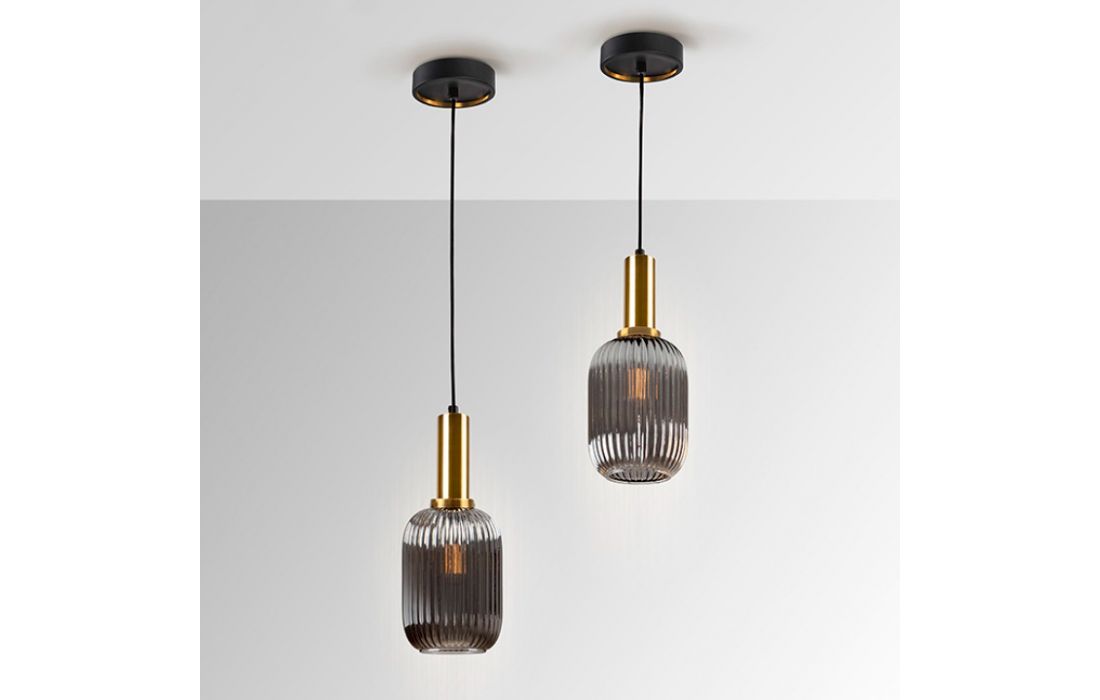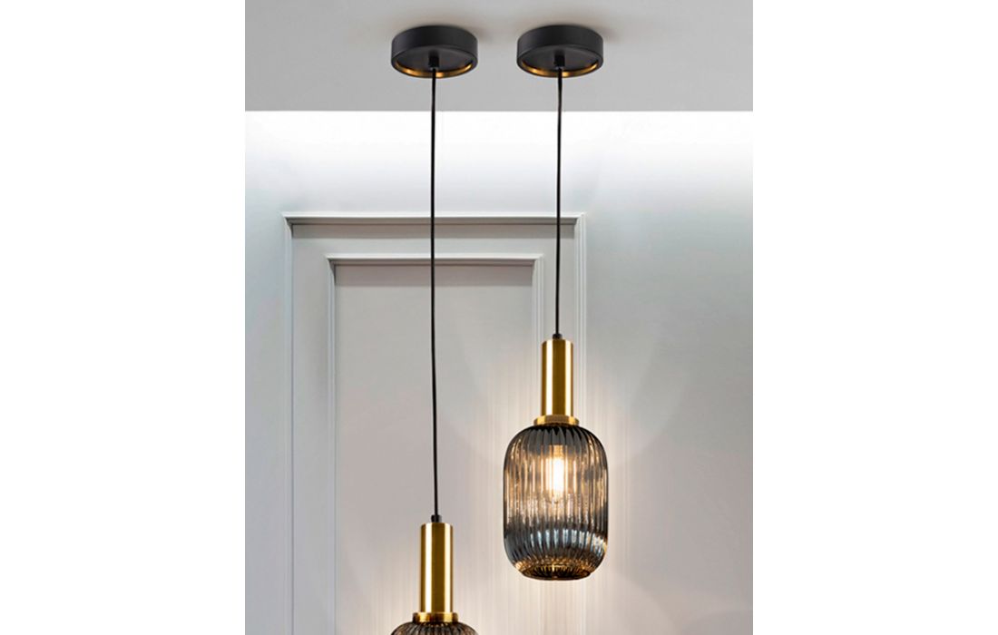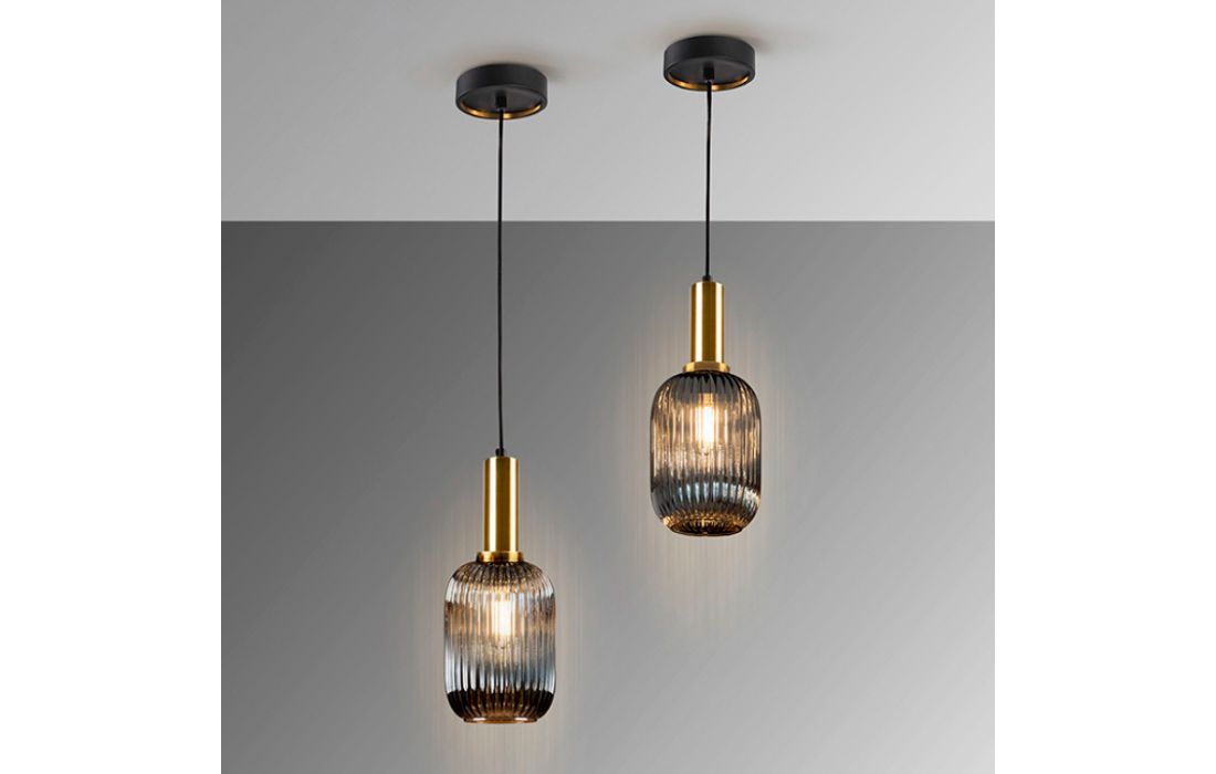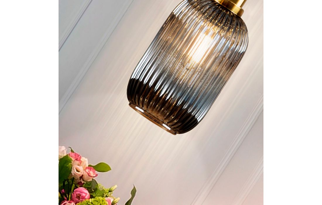 1-light metal ceiling lamp in matt black finish with satin brass details. Glass lampshade with smoked gray finish.