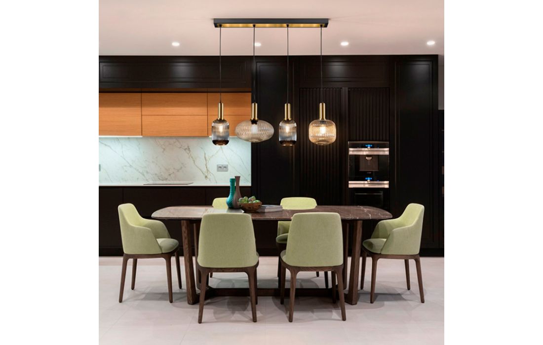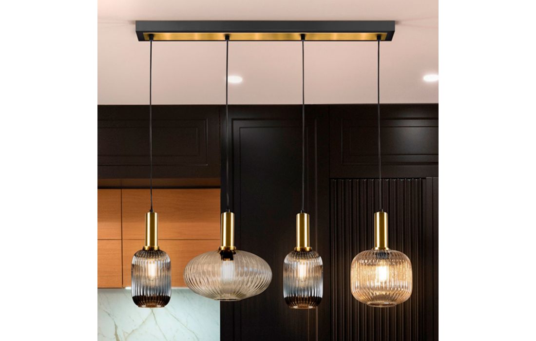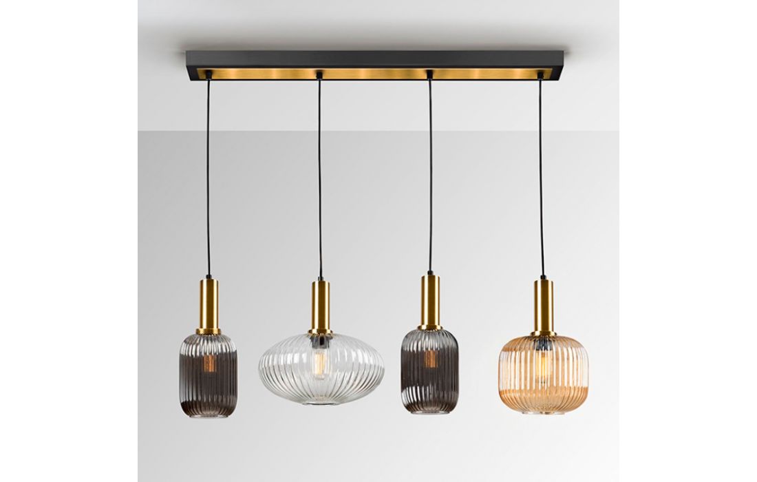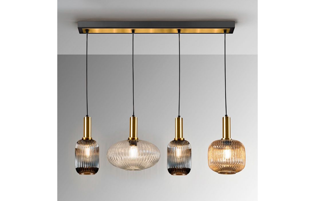 Ceiling lamp with 4 lights in a row made of metal with a matt black finish with satin brass details. Glass lampshade with a transparent, amber and smoked gray finish.