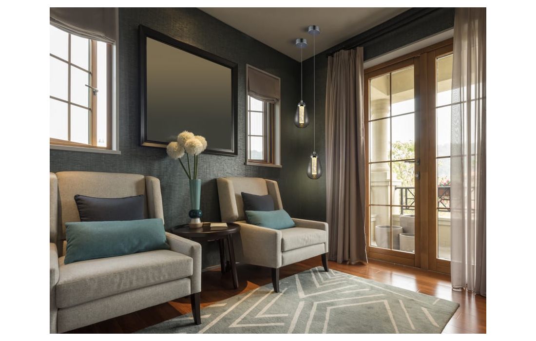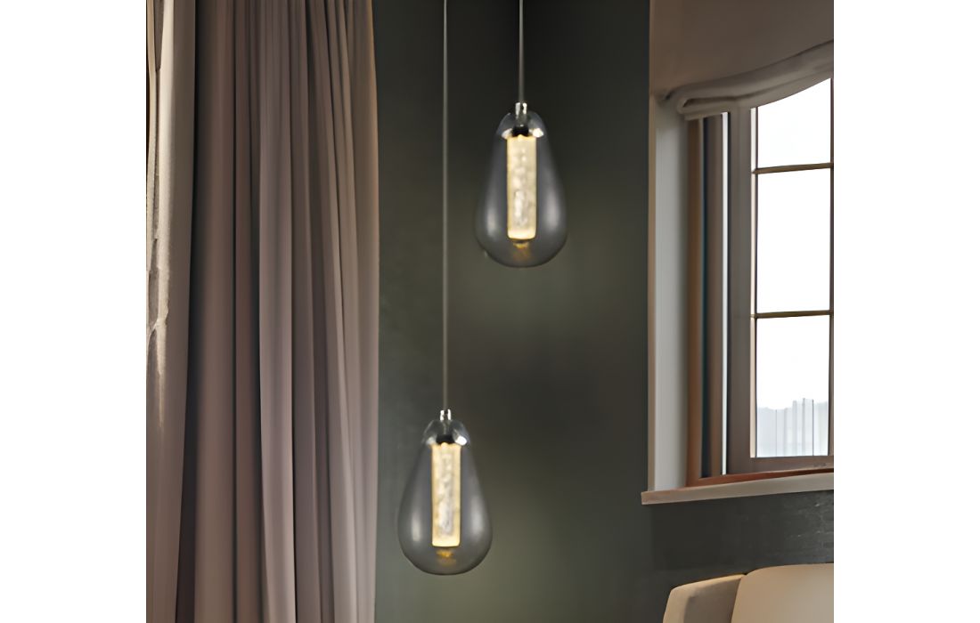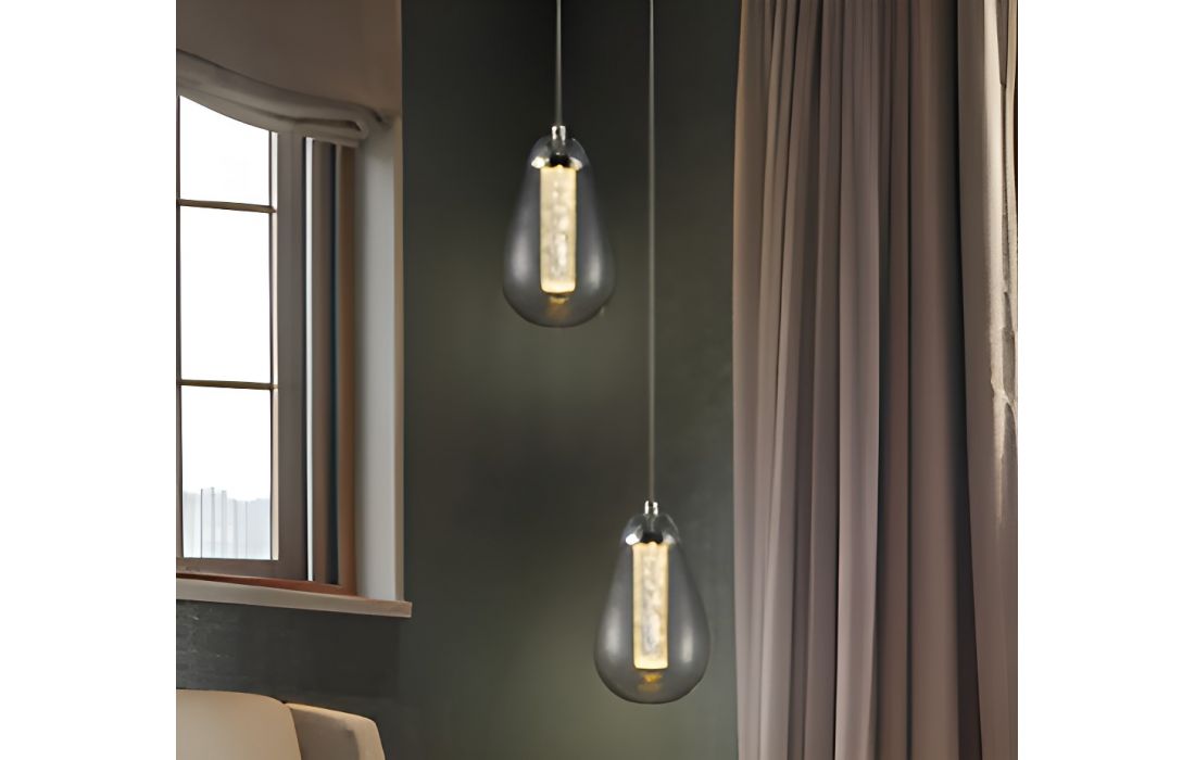 Ceiling lamp 1 metal light with chromium finish. Double tulip, pear -shaped exterior performed on transparent glass and massive bar with decorative bubbles. Adjustable at height.