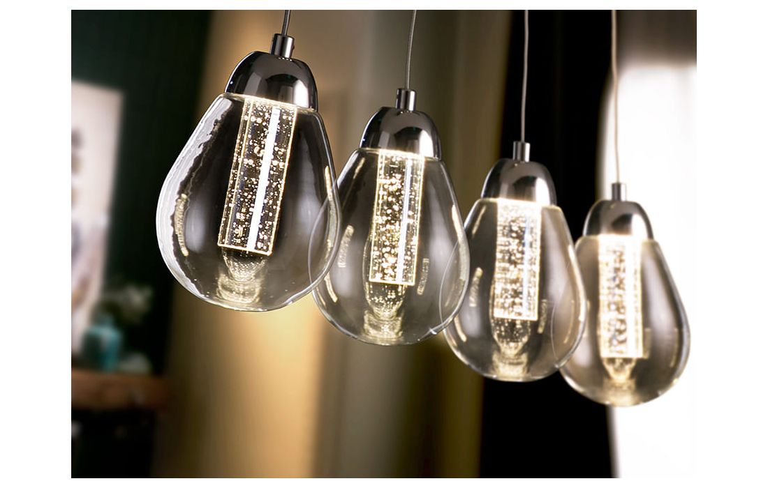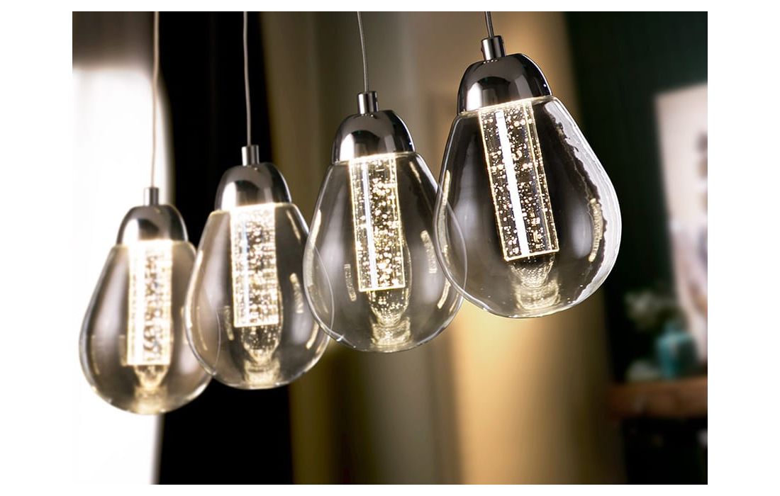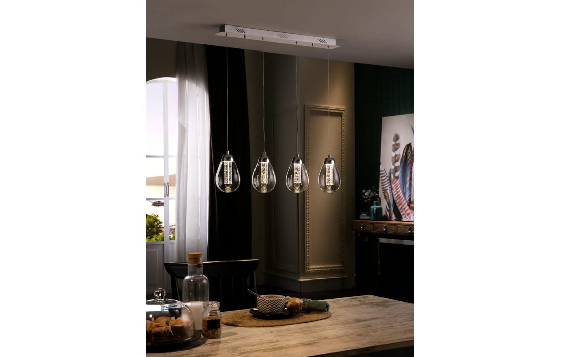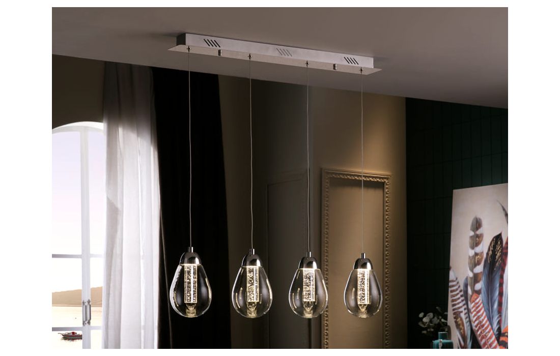 Ceiling lamp 4 metal lights with chromium finish. Double tulip, pear -shaped exterior performed on transparent glass and massive bar with decorative bubbles. Adjustable at height.
