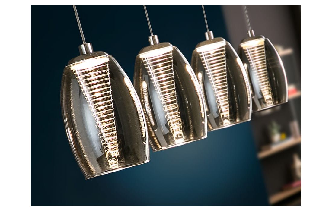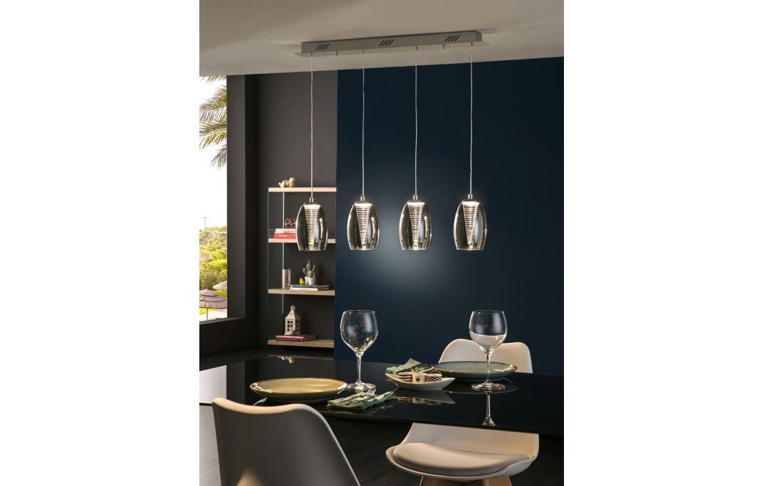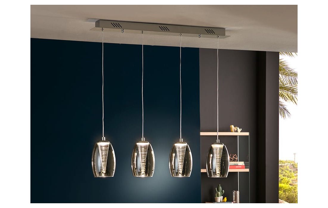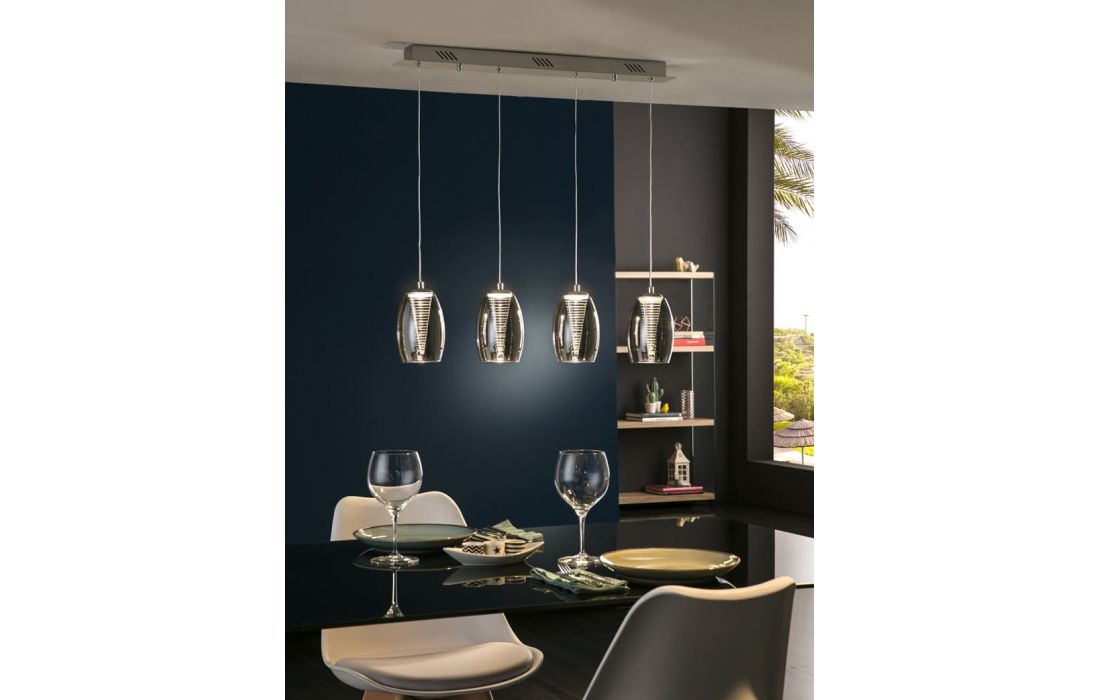 Ceiling lamp 4 metal lights with chromium finish. Double tulip, pear -shaped outer performed on mirrored glass and transparent polycarbonate interior in staggered cone - shaped. Adjustable at height.