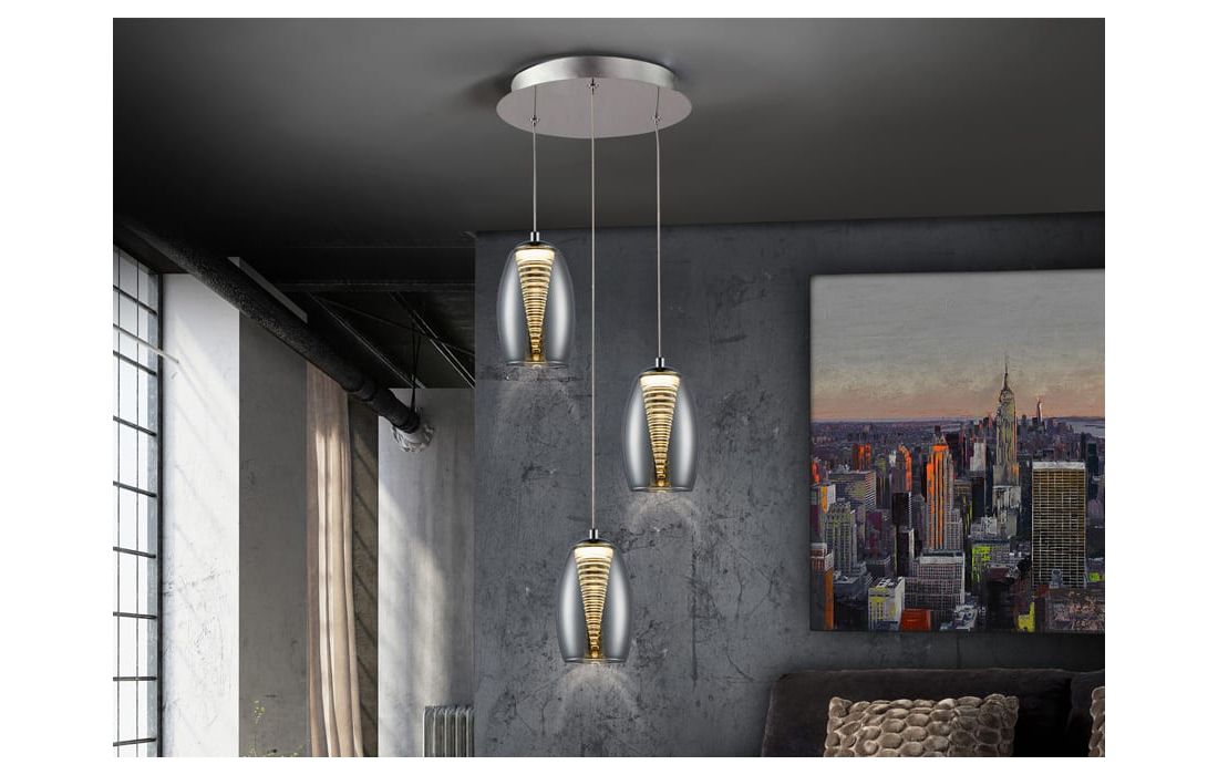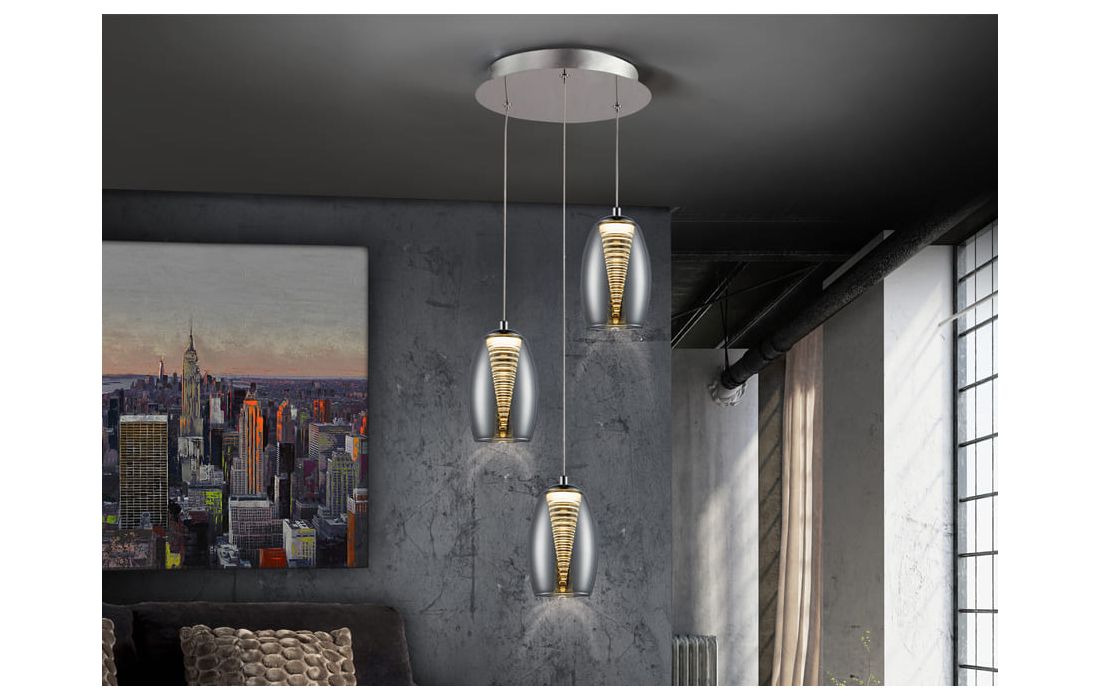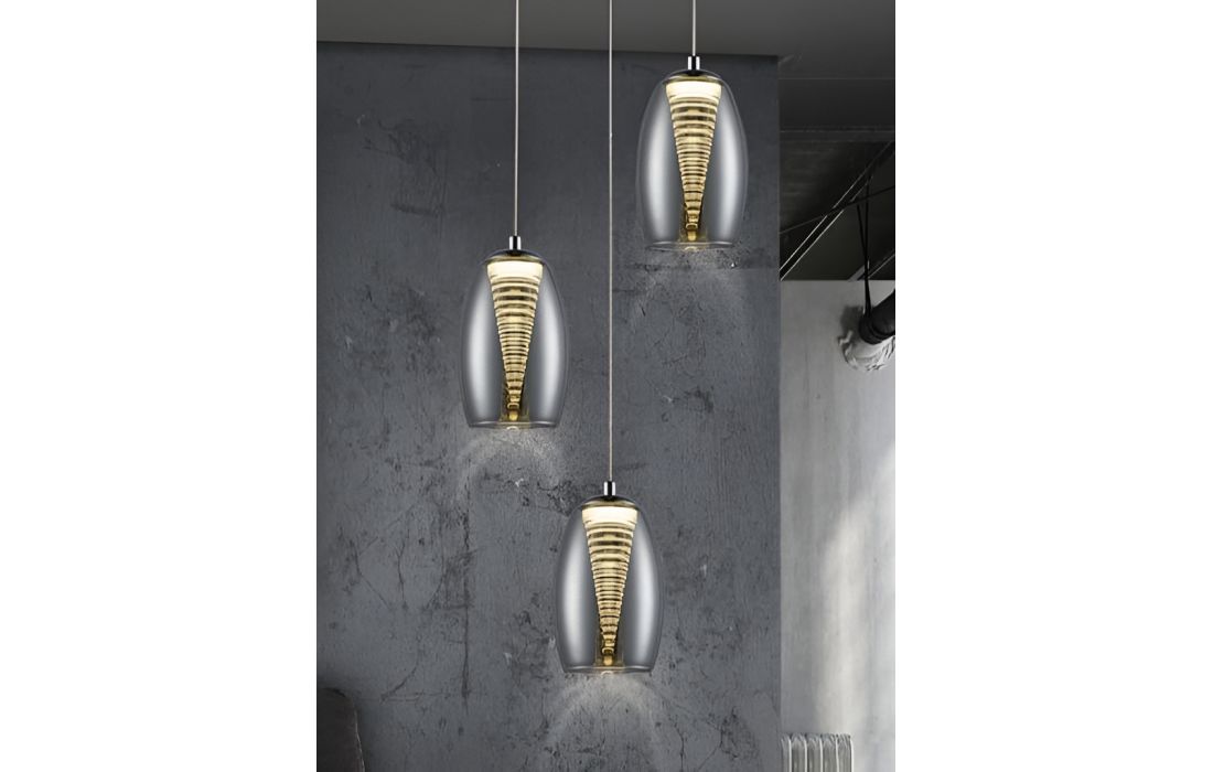 Ceiling lamp 3 metal lights with chromium finish. Double tulip, exterior performed on mirrored glass and interior in transparent polycarbonate in staggered cone - shaped. Adjustable at height.
