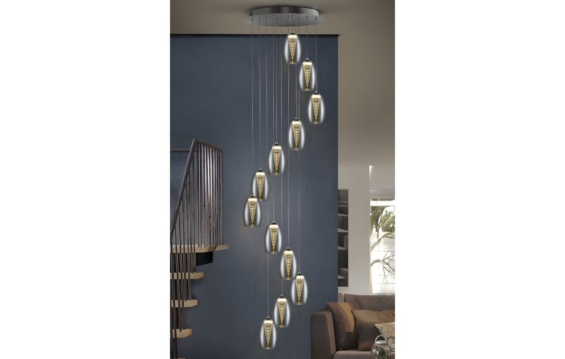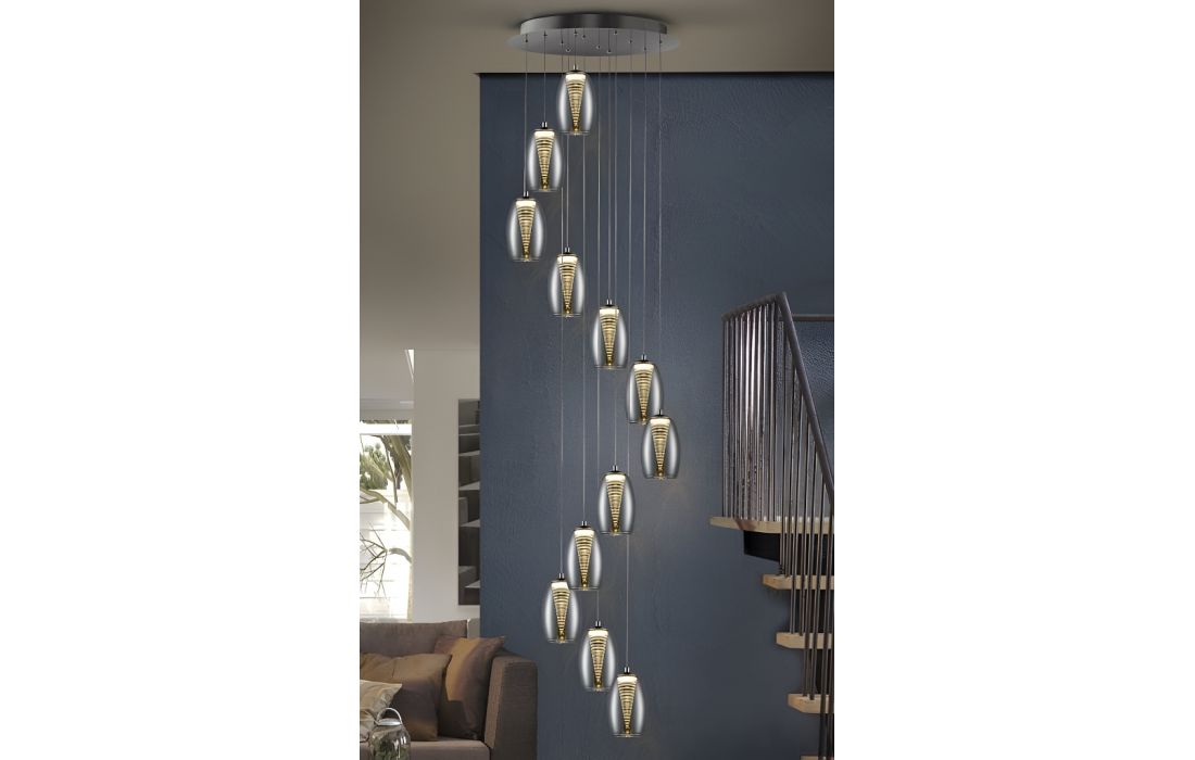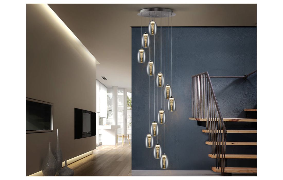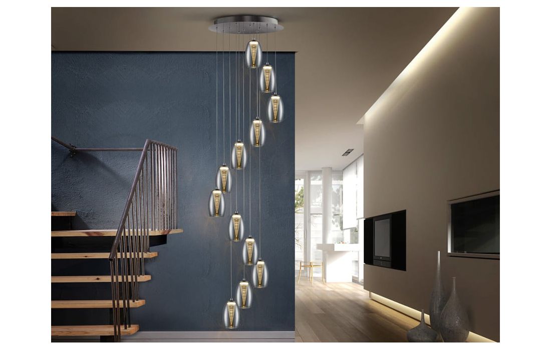 Ceiling lamp 12 metal lights with chromium finish. Double tulip, exterior performed on mirrored glass and interior in transparent polycarbonate in staggered cone - shaped. Adjustable at height.