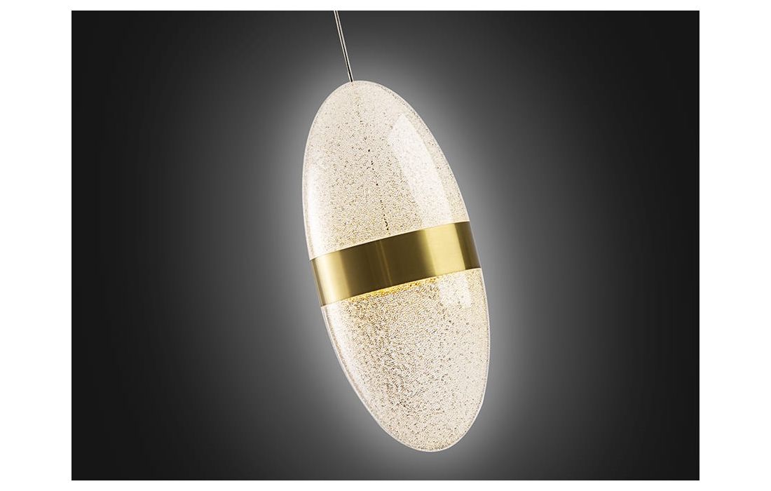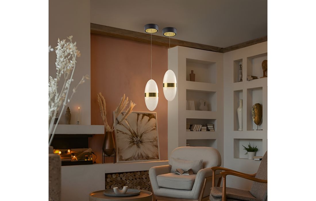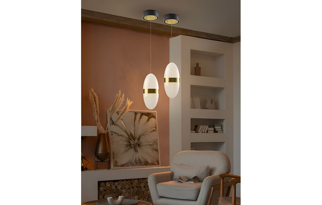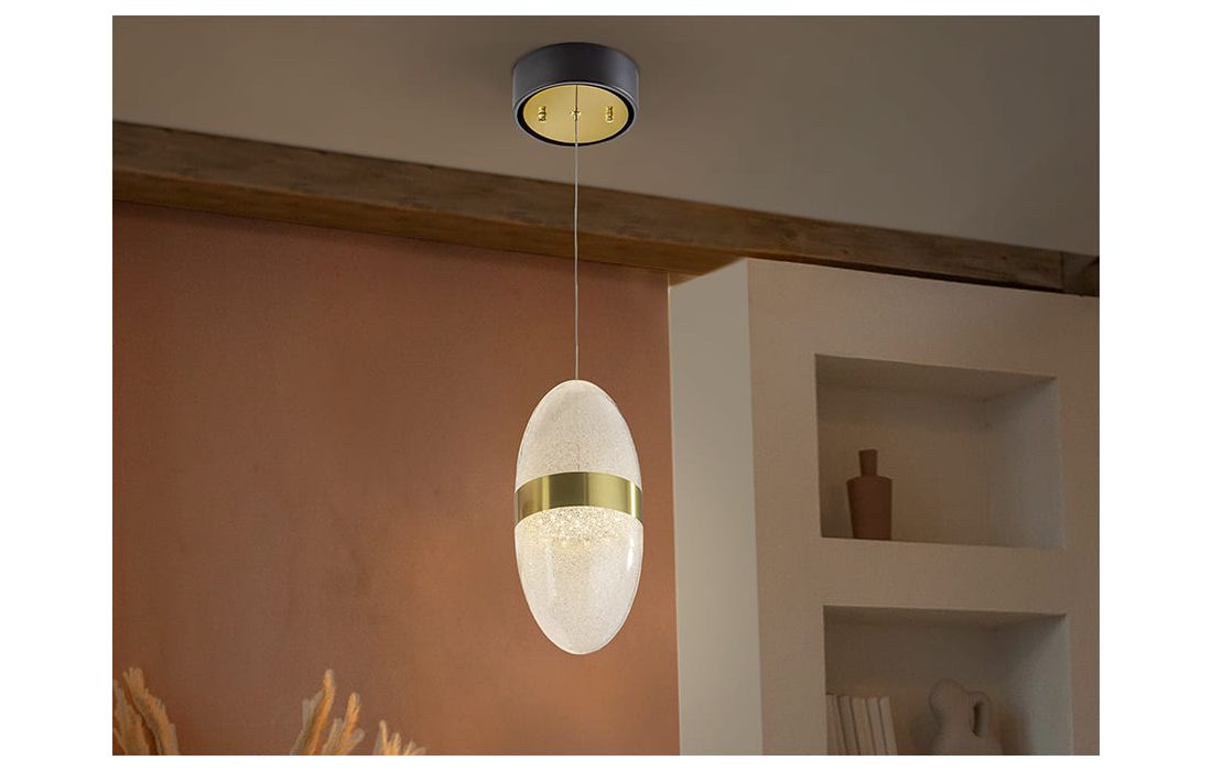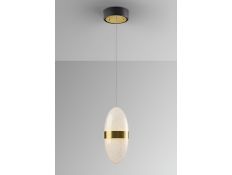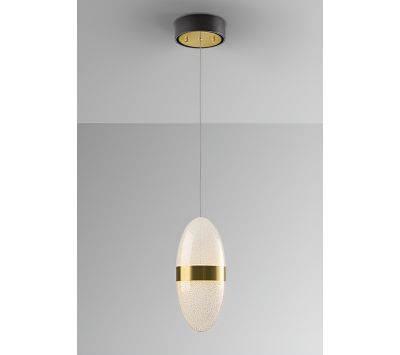 Ceiling lamp with 1 LED light, made of metal with a black finish. 6 - inch polycarbonate spheroidal tulip with textured interior and bronze metal rim. Adjustable height.