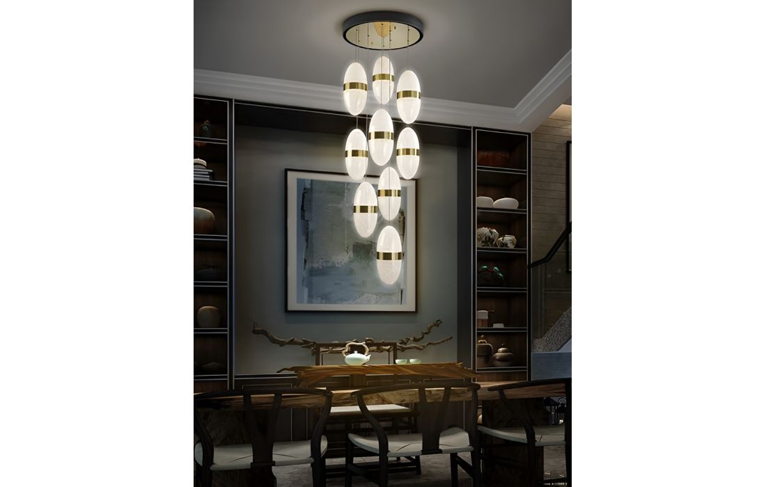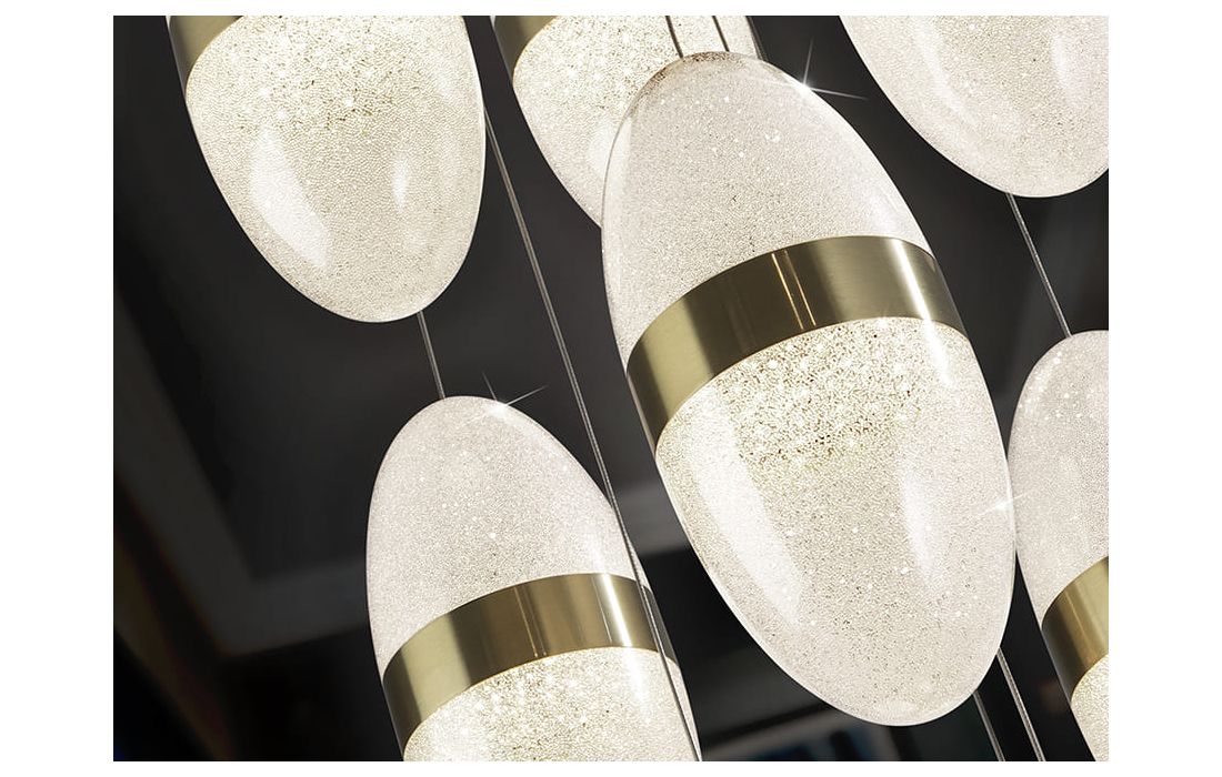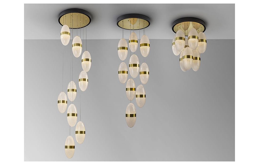 Ceiling lamp with 9 LED lights made of metal with a black and gold finish. 6 -inch polycarbonate spheroidal tulip with textured interior and brass metal rim. Adjustable height.