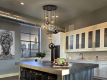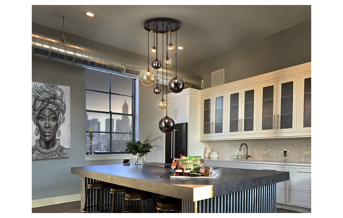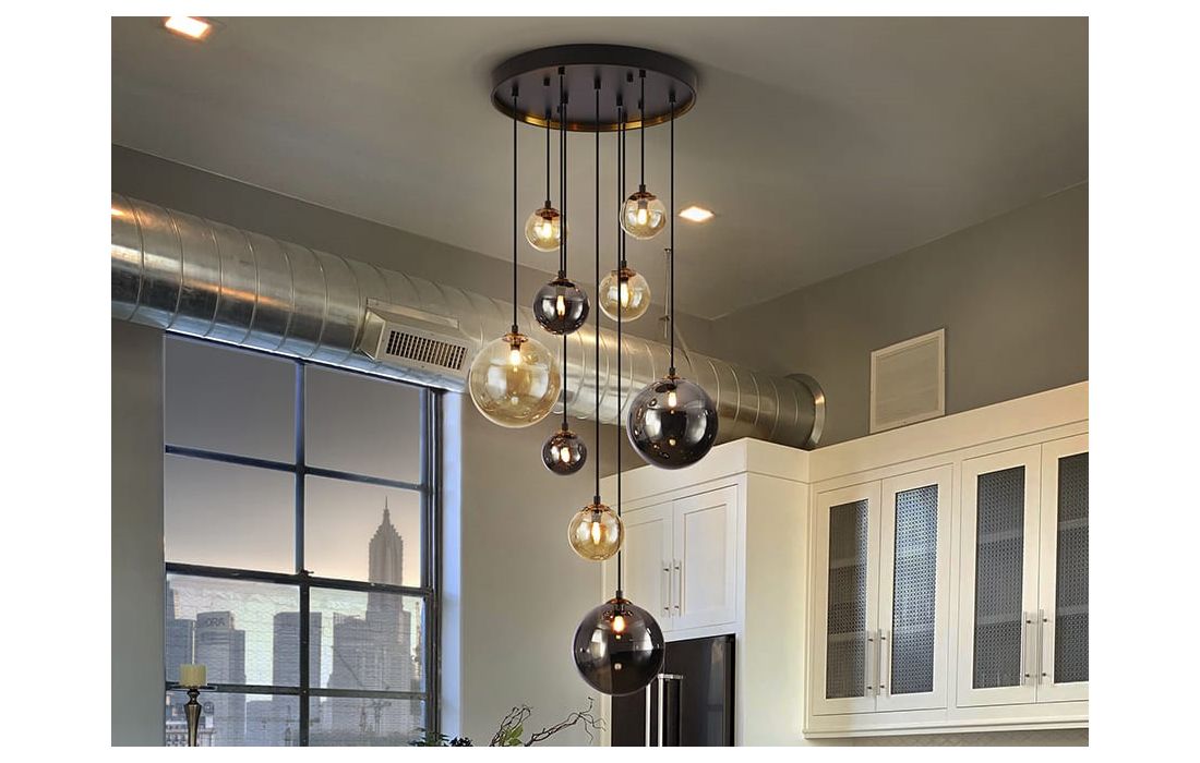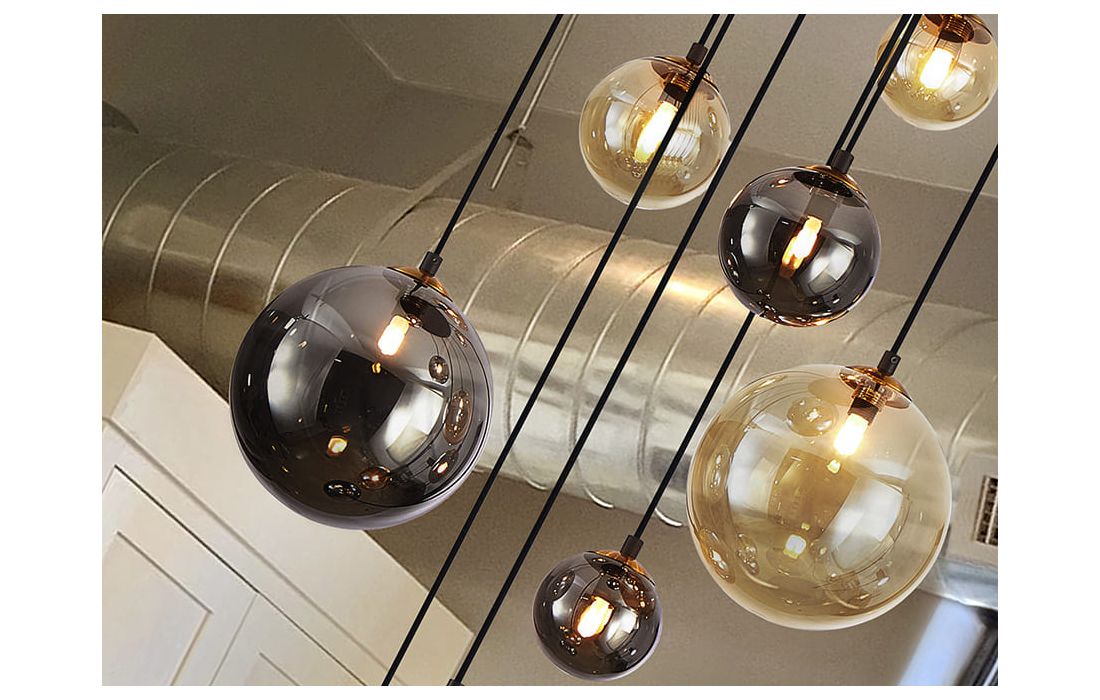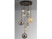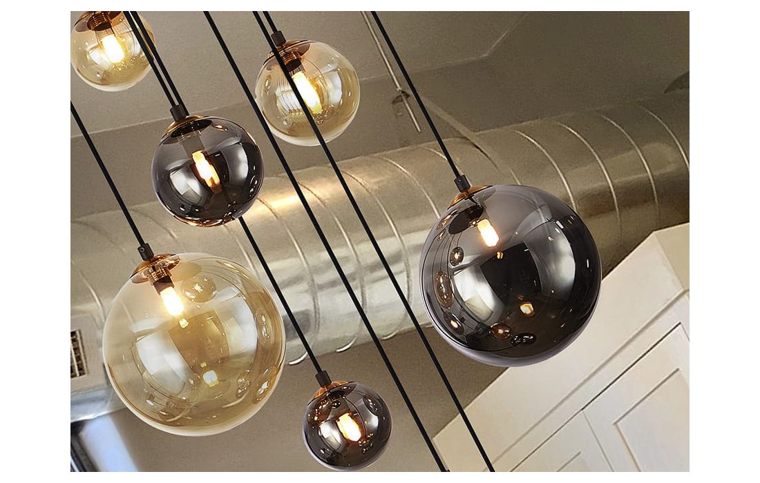 14-light metal lamp with matte black finish, with satin brass details. Spherical glass lampshades measuring 10, 12 and 20 cm, with amber and smoke gray mirrored finishes. Height adjustable.