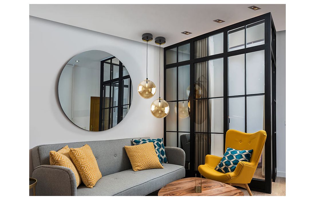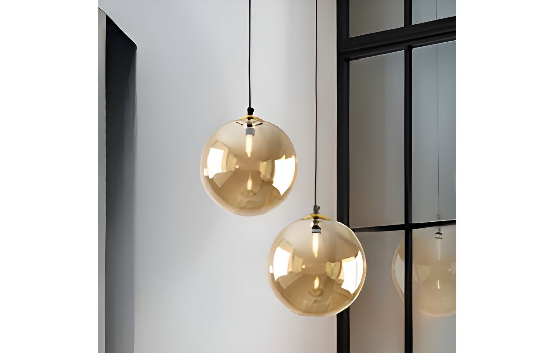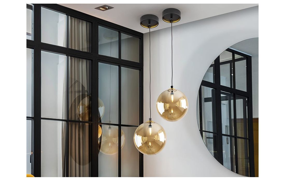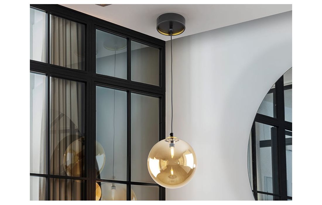 1-light metal lamp with matte black finish, satin brass details. 8 inch amber spherical glass lampshade.