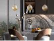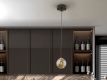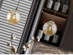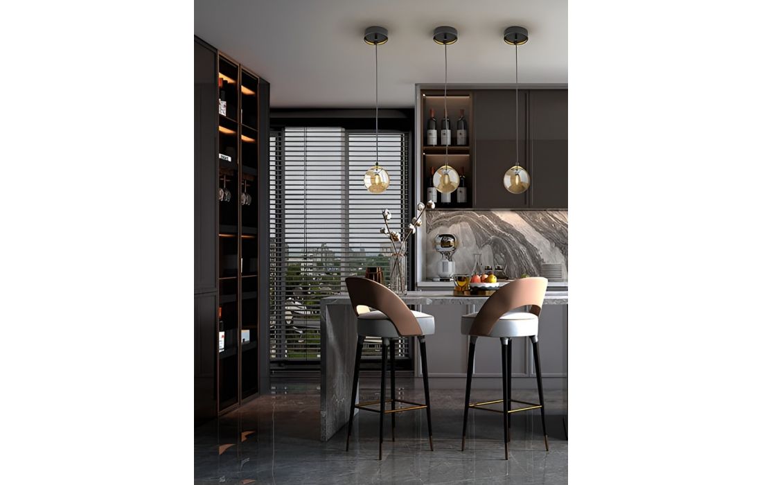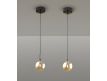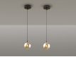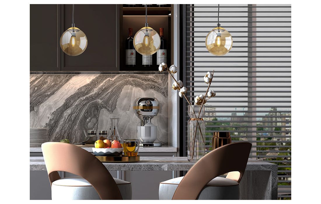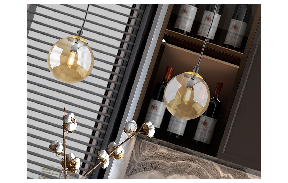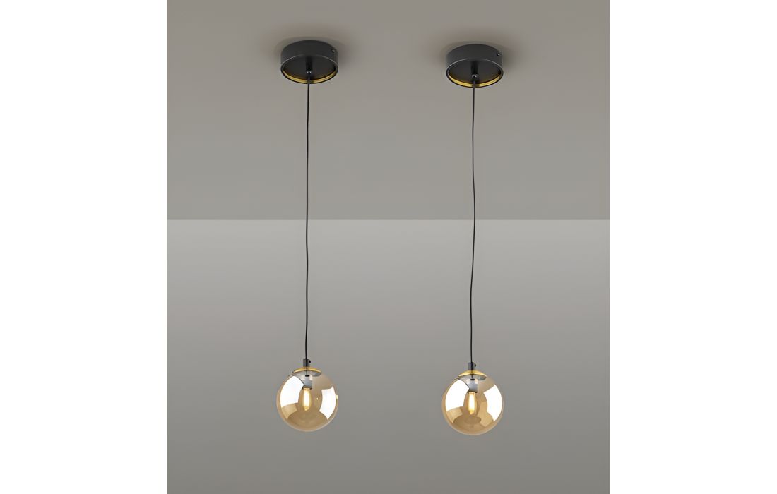 1-light metal lamp with matte black finish, with satin brass detail. 5 inch amber spherical glass lampshade.