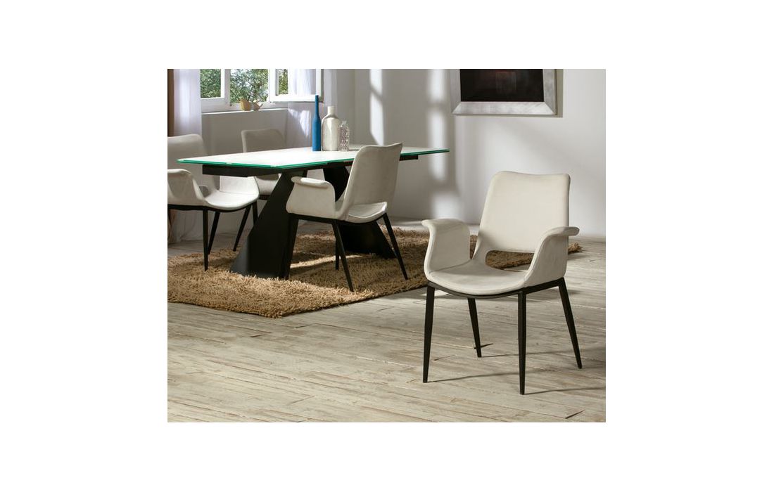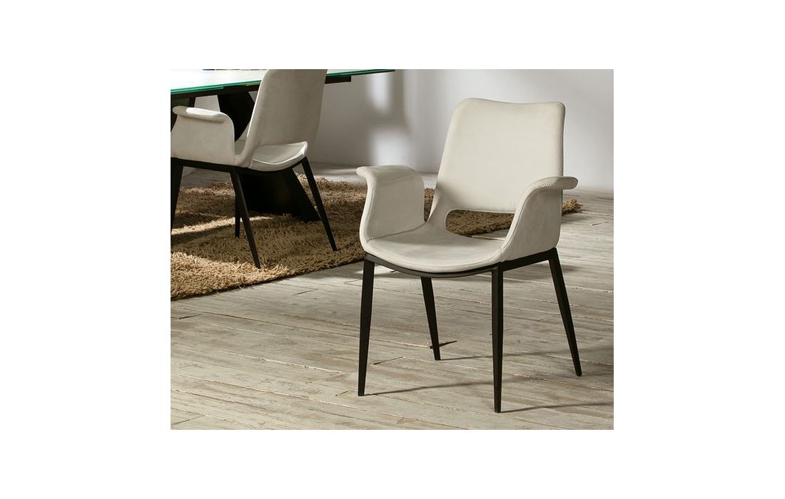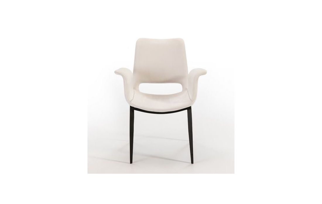 Metal armchair with matt black finish. Plywood and foam seat and back. White polyester fabric lining, with white decorative backstitching.